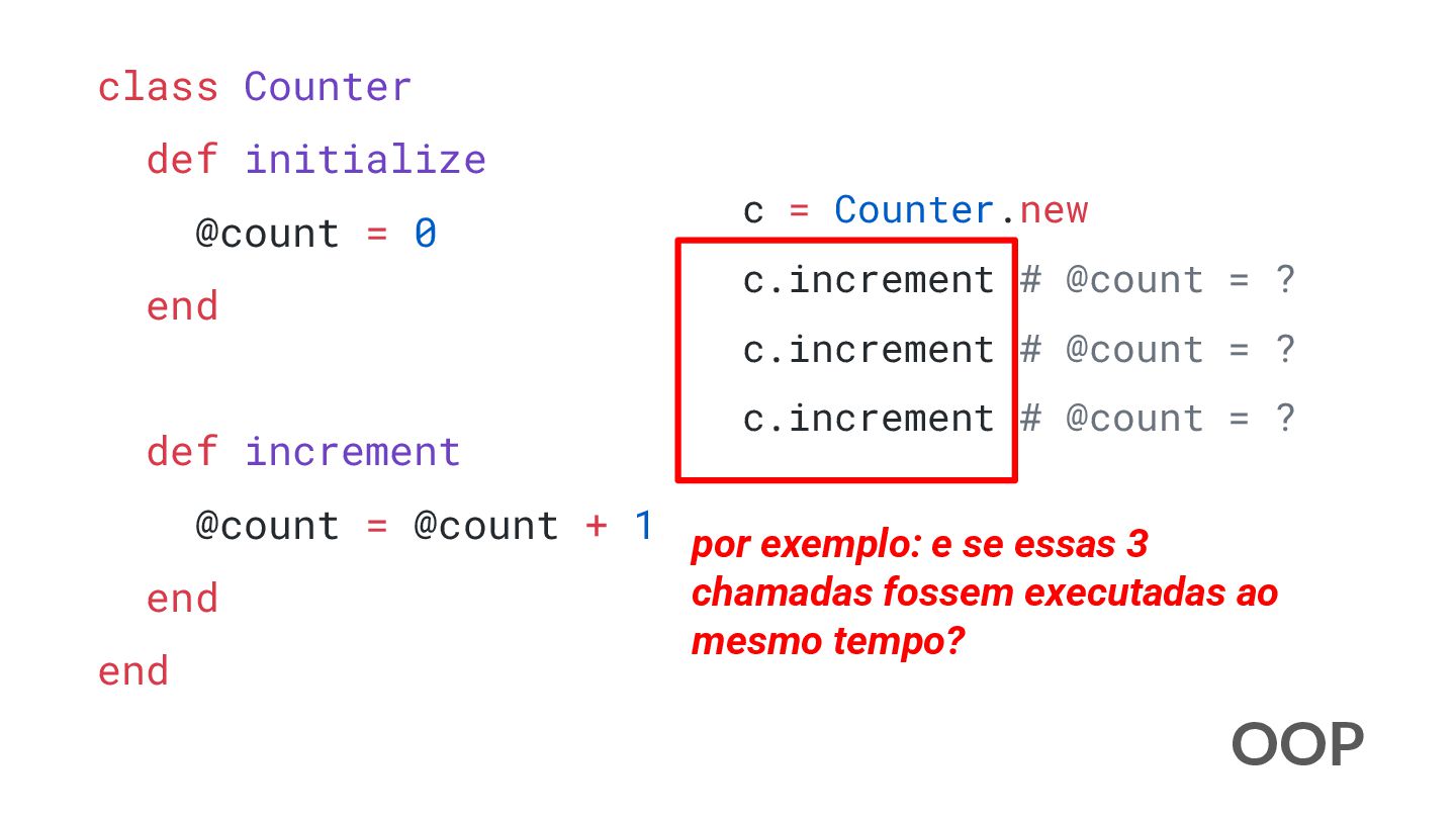 @count = @count + 1 end end OOP c = Counter.new c.increment # @count = ? c.increment # @count = ? c.increment # @count = ? por exemplo: e se essas 3 chamadas fossem executadas ao mesmo tempo?