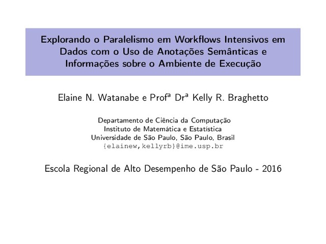 O uso de plataformas de alto desempenho é um requisito para a execução de atividades que lidam com grandes volumes de dados. Um conjunto de atividades interligadas, modeladas como um workflow, pode ter sua execução controlada por um Sistema de Gerenciamento de Workflows (SGWfs). O paralelismo de dados pode diminuir o seu tempo total de execução, contudo, os SGWfs não exploram isso de maneira automática. Este trabalho propõe o uso de anotações semânticas para a criação automática de um modelo paralelo para a execução das atividades. Em experimentos com um workflow que lida com 5,8 milhões de objetos de dados, a paralelização obtida das anotações reduziu em 88,37% o tempo de execução do workflow e em 10,35% o custo financeiro.