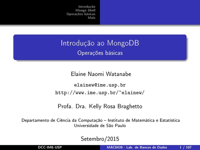 Na documentação do MongoDB [MongoDB 2015b] Nas aulas do curso M101P - MongoDB for Developers [University 2015b] Nas aulas do curso M101J - MongoDB for Java Developers [University 2015a] Nas aulas do curso M102 - MongoDB for DBAs [University 2015c] No livro MongoDB - Construa novas aplicações com novas tecnologias de Fernando Boaglio [Boaglio 2015] DCC-IME-USP MAC0439 - Lab. de Bancos de Dados 2 / 107