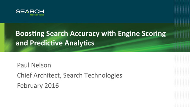 With Big Data, it is possible to harvest user event data, such as search and click logs, for the purpose of computing user-based search accuracy metrics. Learn about the algorithms and processes for computing these metrics which are vital for comparing search engine accuracy before a deployment.