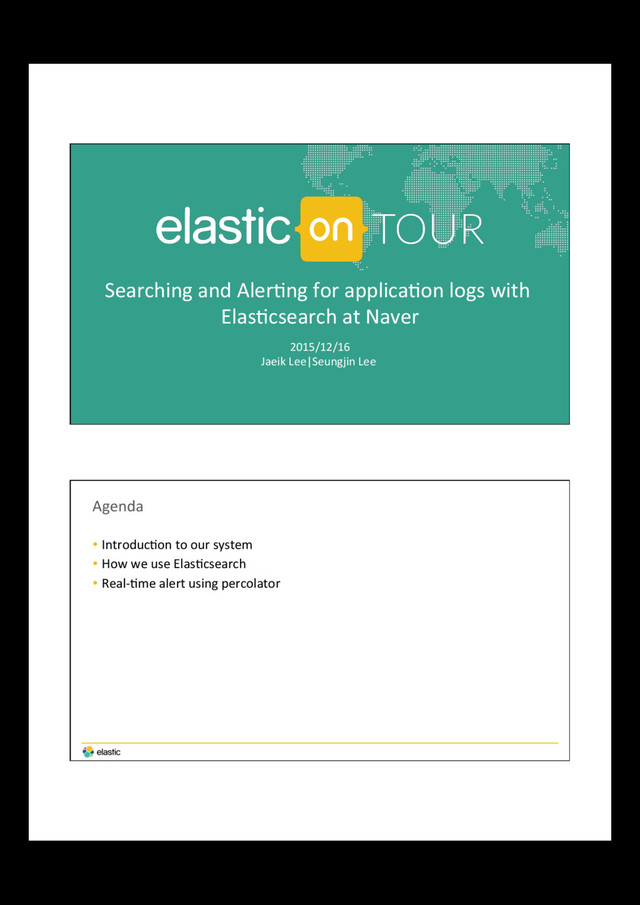 Naver, the biggest Internet content service provider in South Korea, develops and distributes mobile and server applications like Naver search portal, Line and Band messengers. Naver developers need to check application logs stored on hundreds of servers and sometimes only on customers' devices. NELO2 is Naver's in-house logging system, built with Elasticsearch, indexing and percolating 1.5 billion logs daily with 126TB of logs stored in seven Elasticsearch clusters.