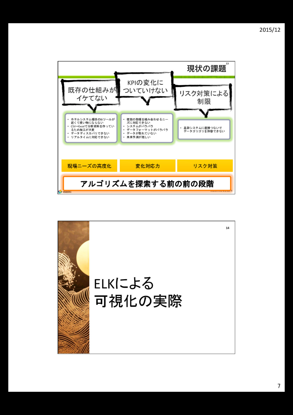 遅くて使い物にならない • CSV→Excelで分析資料を作ってい るため加工が大変 • データディスカバリできない • リアルタイムに対応できない • 複数の指標を組み合わせるニー ズに対応できない • システムがバラバラ • データフォーマットがバラバラ • データが取れていない • 未来予測が難しい リスク対策による 制限 • 基幹システムに直接つないで データゴリゴリを許容できない 現場ニーズの高度化 変化対応力 リスク対策 13 ELKによる 可視化の実際 14