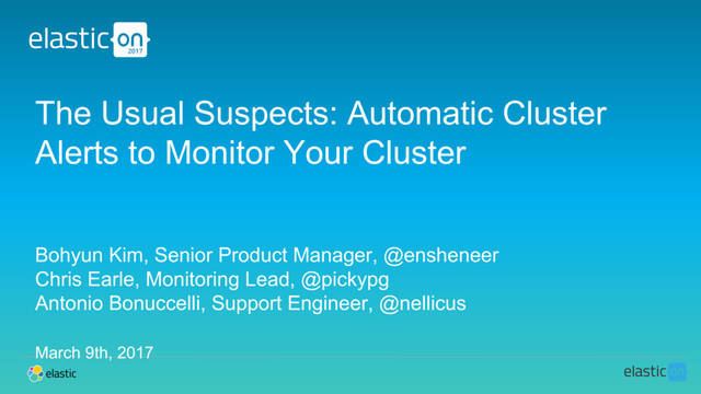 X-Pack, which made its first debut with the 5.0 release of the Elastic Stack, brings monitoring and alerting features together to enable built-in cluster alerts. Chris and Bohyun will go over the latest in monitoring and management in the first portion of the talk, then Antonio will talk about how to solve real-world problems using monitoring data based on customer scenarios he's helped with as part of the Elastic support team.