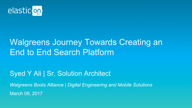 Walgreens is on a journey towards creating an end-to-end search platform for its website powered by Elasticsearch. In this talk, Syed will walk through the various steps along the way, including a look at why their old Endeca-based search platform was no longer viable, how and why Elasticsearch became their new engine, and the technical and architectural lessons and successes they learned along the way.