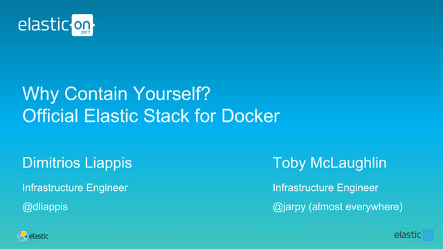 With the 5.X release of the Elastic Stack comes official support for the Docker container platform. The Elastic Docker team will discuss running the Elastic Stack in container environments using the official images they maintain and publish. Dimitrios and Toby will cover configuration techniques for the images and share tips on performance optimization, show how Elasticsearch's distributed nature aligns with container orchestration, and discuss the quality automation that ensures the Elastic Stack is always Docker-ready, whether on a laptop or across a fleet.