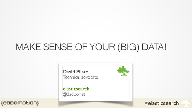 "title" : "Elasticsearch",! "subtitle" : "Make sense of your (BIG) data !",! "date" : "2014-04-12T14:10:00",! "tags" : [ "elasticsearch", "codemotion", "bigdata" ],! "speakers" : [{! "first_name" : "David", ! "last_name" : "Pilato" ! }]! }'