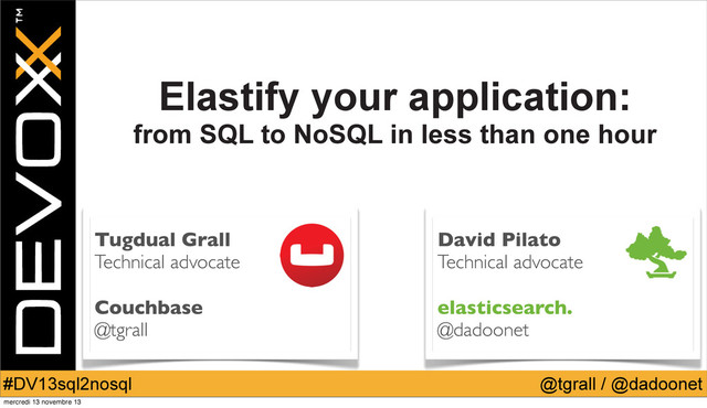 During this "live coding" talk, Tugdual from Couchbase and David from Elasticsearch moved an old-fashion full SQL application to the NoSQL world.