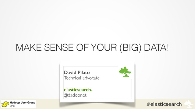 • marketing data • ... • your data • your big data Let’s make sense of … { "name":"Pilato David", "dateOfBirth":"1971-12-26", "gender":"male", "children":3, "marketing":{ "fashion":334, "music":3363, "hifi":2351 }, "address":{ "country":"France", "city":"Paris", "location": [2.332395, 48.861871] } }