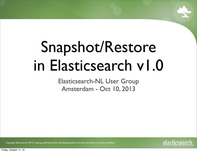 is strictly prohibited Restore Index v1.0 $ curl -XPOST "localhost:9200/_snapshot/my_backup/snapshot_20131010" -d '{ "indices":"test_*" }' $ curl -XPOST "localhost:9200/test_*/_close" close all indices that start with test_ repository name snapshot name list of indices to restore Friday, October 11, 13
