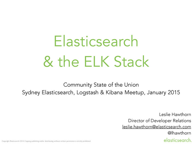 In this presentation, Leslie Hawthorn will review all matters related to the ELK stack and its community. We'll go over how to contribute to the Elasticsearch, Logstash and Kibana projects, where our users are, what they are finding most useful and how you can get more involved in the community.