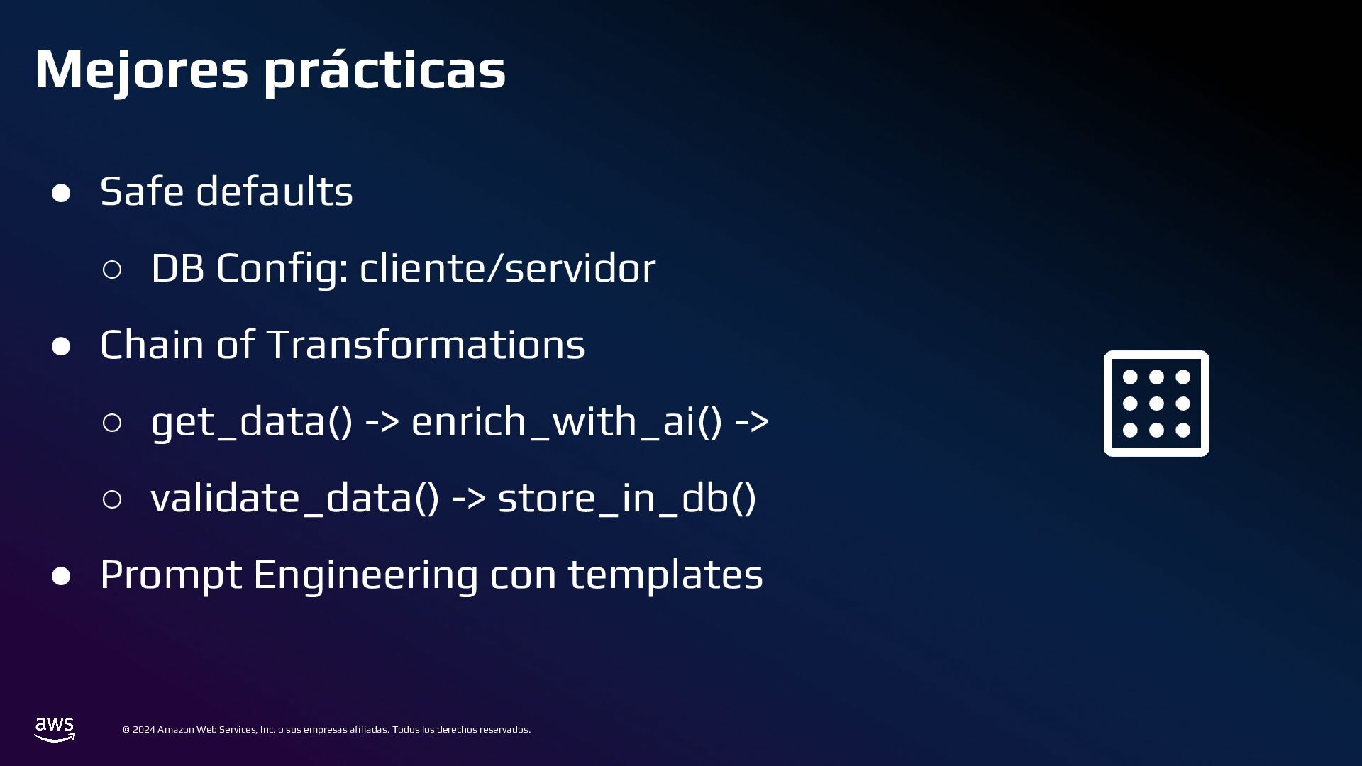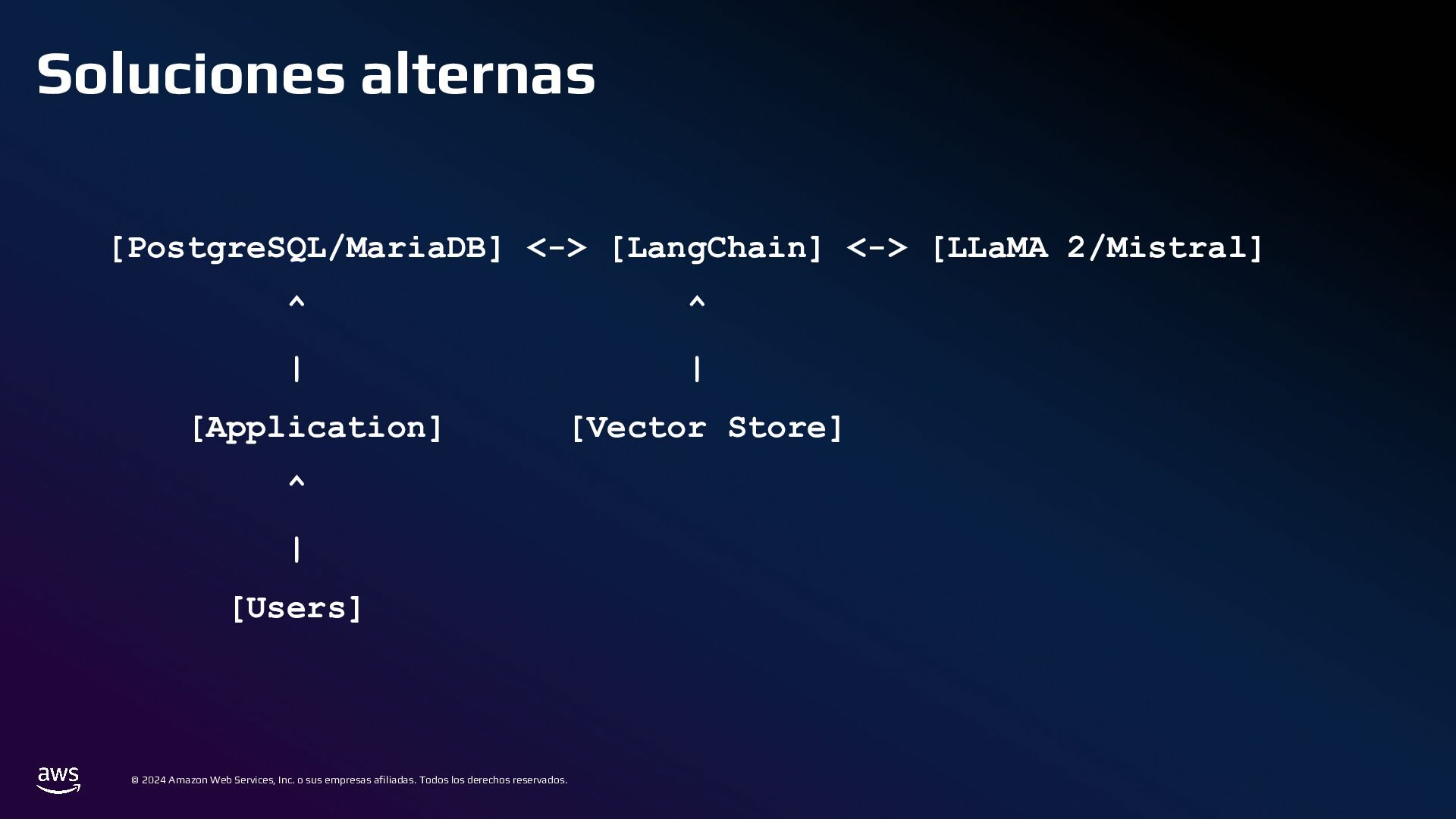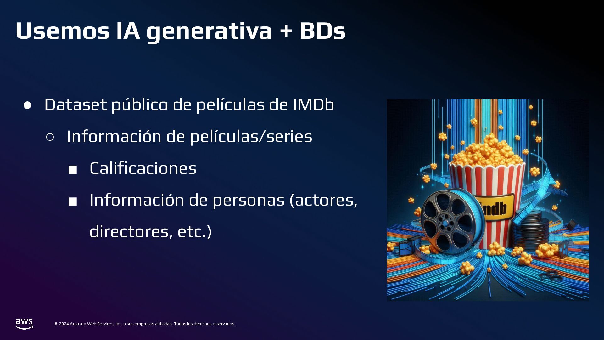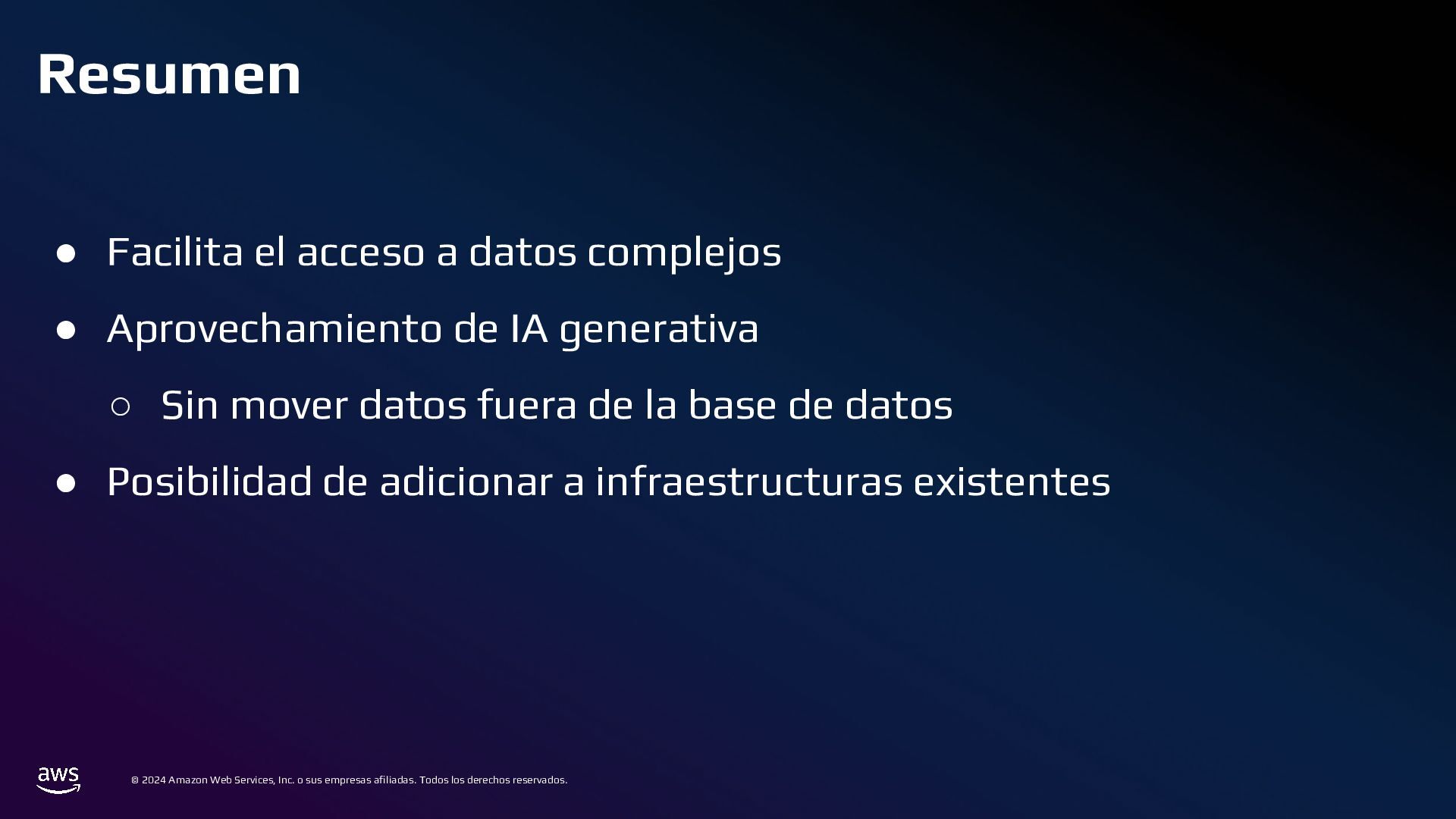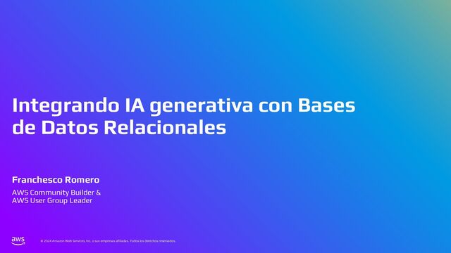 En esta charla mostraremos cómo AWS Bedrock puede conectarse a una base de datos tradicional, comprender su estructura, y generar consultas a partir de preguntas en lenguaje cotidiano. Este mecanismo permite crear integraciones para que usuarios de diversos perfiles puedan acceder y analizar datos complejos de manera eficiente.