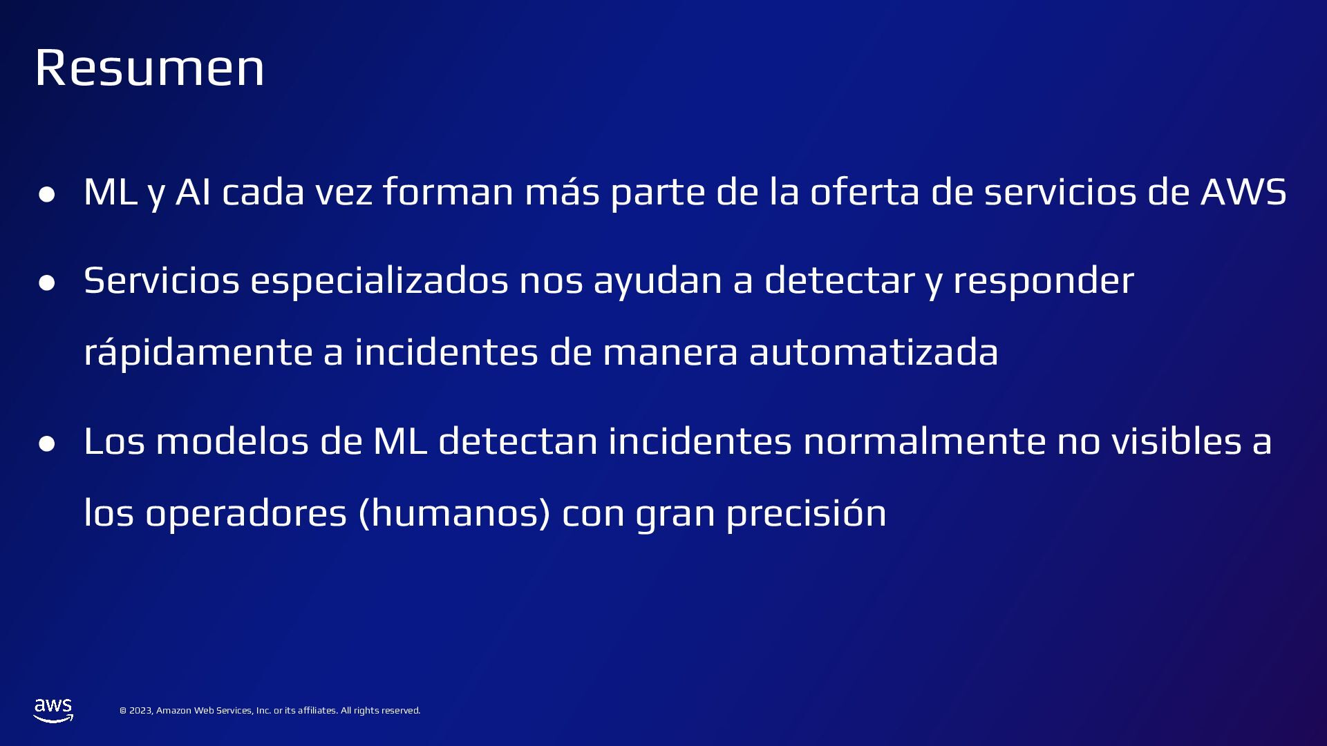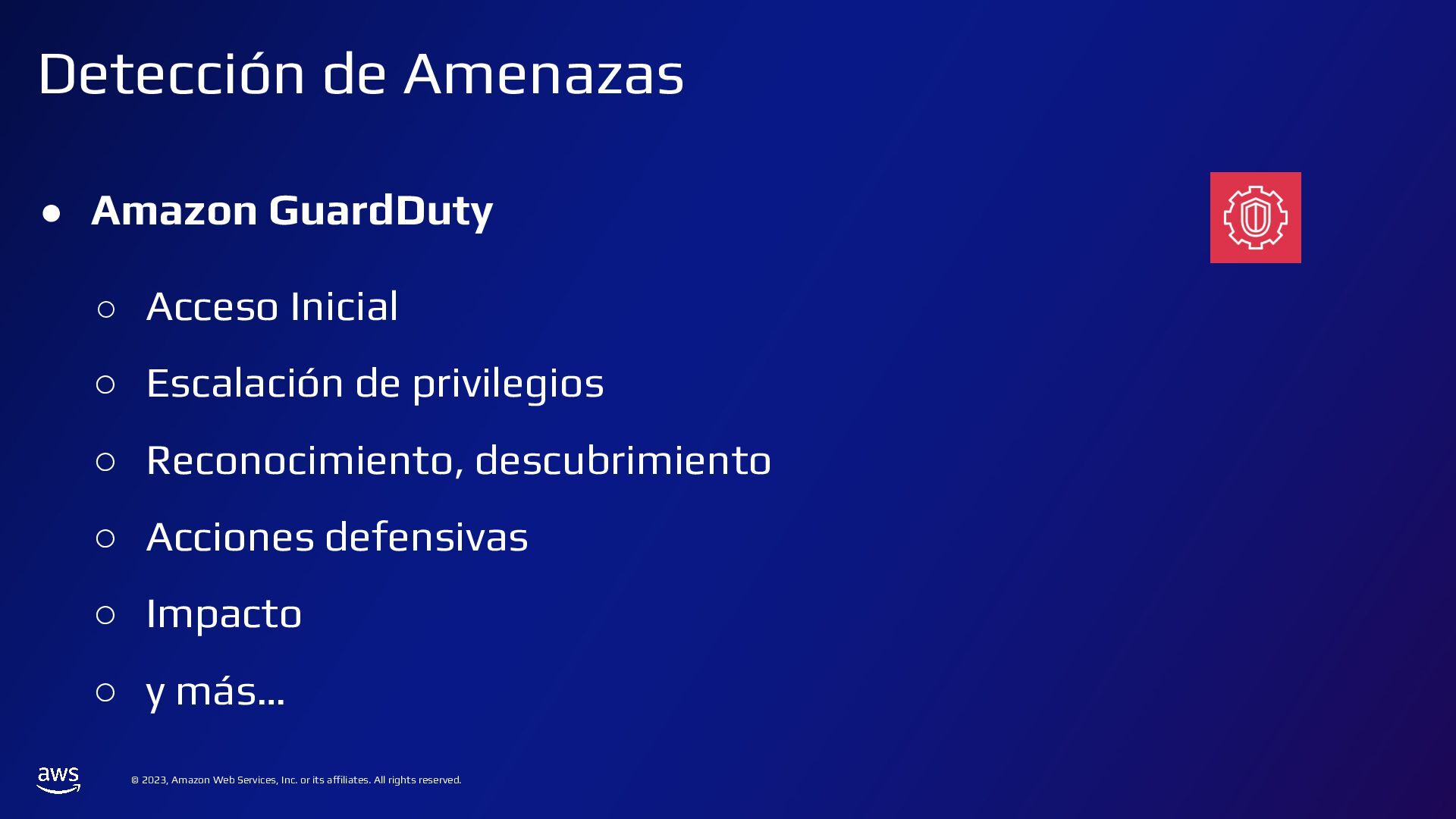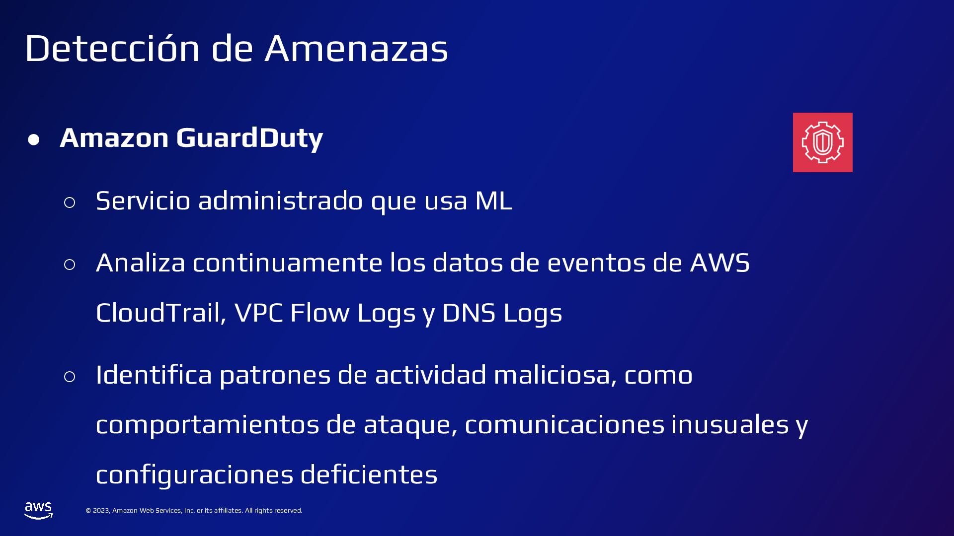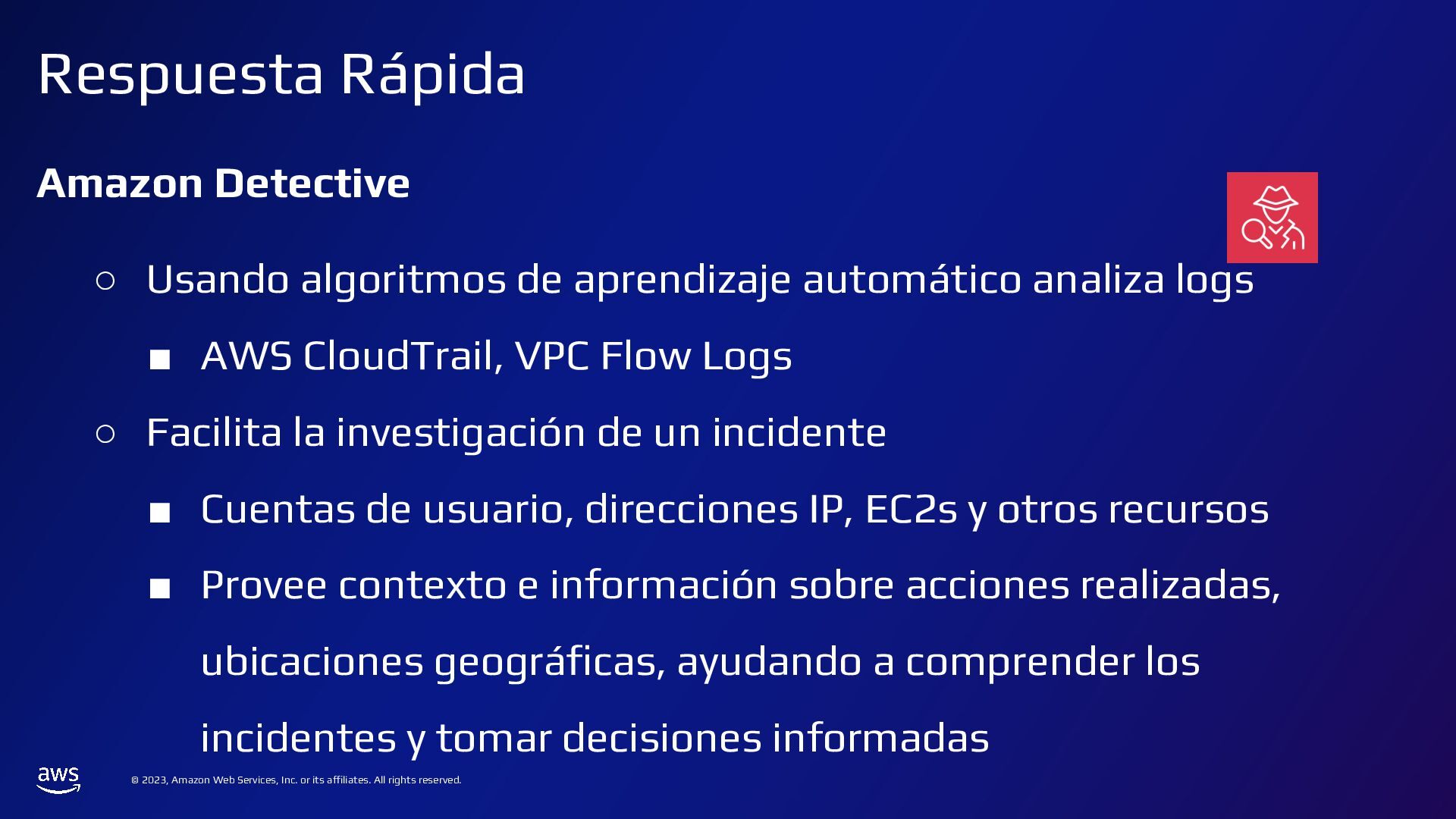 rights reserved. Respuesta Rápida Amazon Detective ◦ Usando algoritmos de aprendizaje automático analiza logs ▪ AWS CloudTrail, VPC Flow Logs ◦ Facilita la investigación de un incidente ▪ Cuentas de usuario, direcciones IP, EC2s y otros recursos ▪ Provee contexto e información sobre acciones realizadas, ubicaciones geográficas, ayudando a comprender los incidentes y tomar decisiones informadas