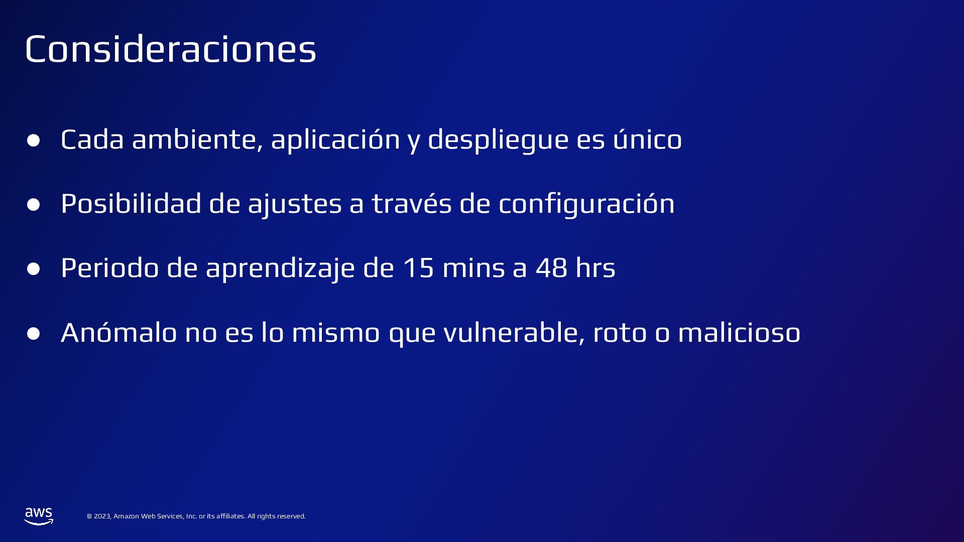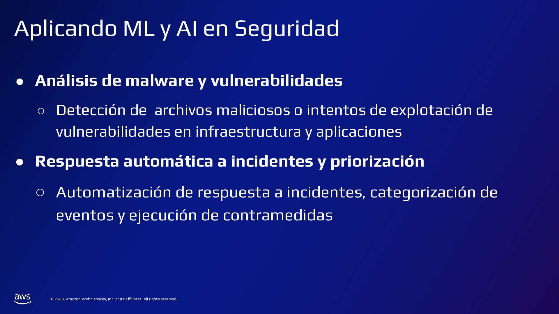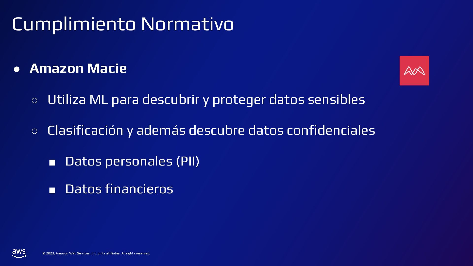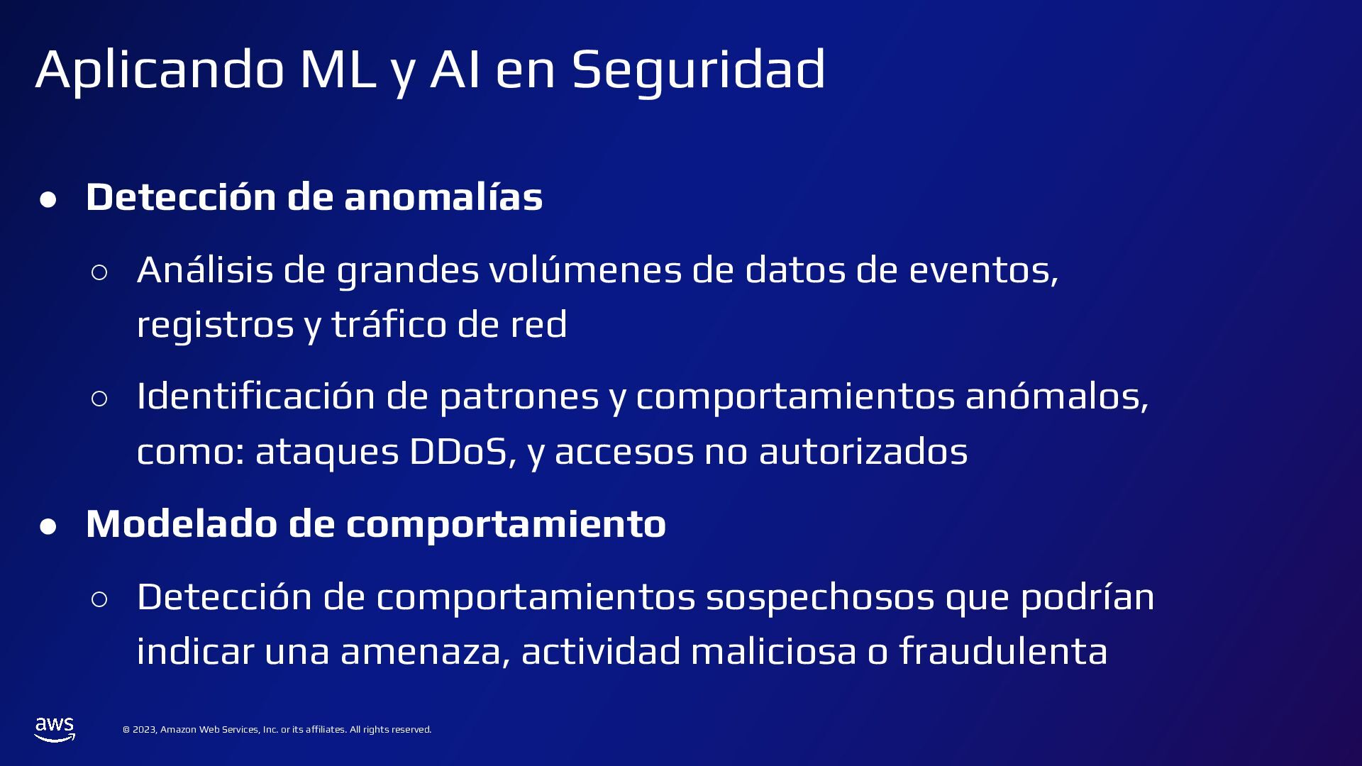 rights reserved. Respuesta Rápida Amazon Detective ◦ Usando algoritmos de aprendizaje automático analiza logs ▪ AWS CloudTrail, VPC Flow Logs ◦ Facilita la investigación de un incidente ▪ Cuentas de usuario, direcciones IP, EC2s y otros recursos ▪ Provee contexto e información sobre acciones realizadas, ubicaciones geográficas, ayudando a comprender los incidentes y tomar decisiones informadas