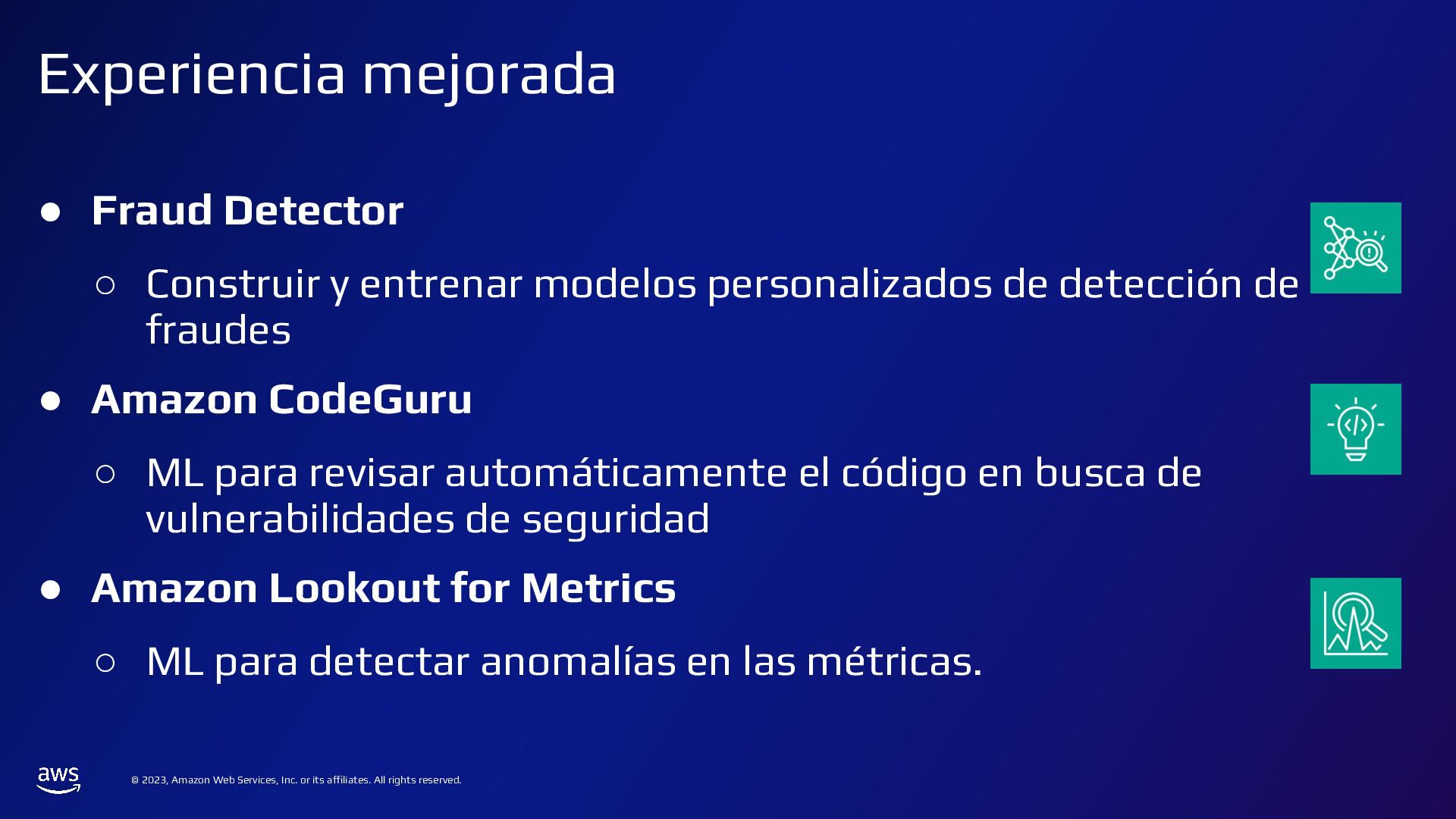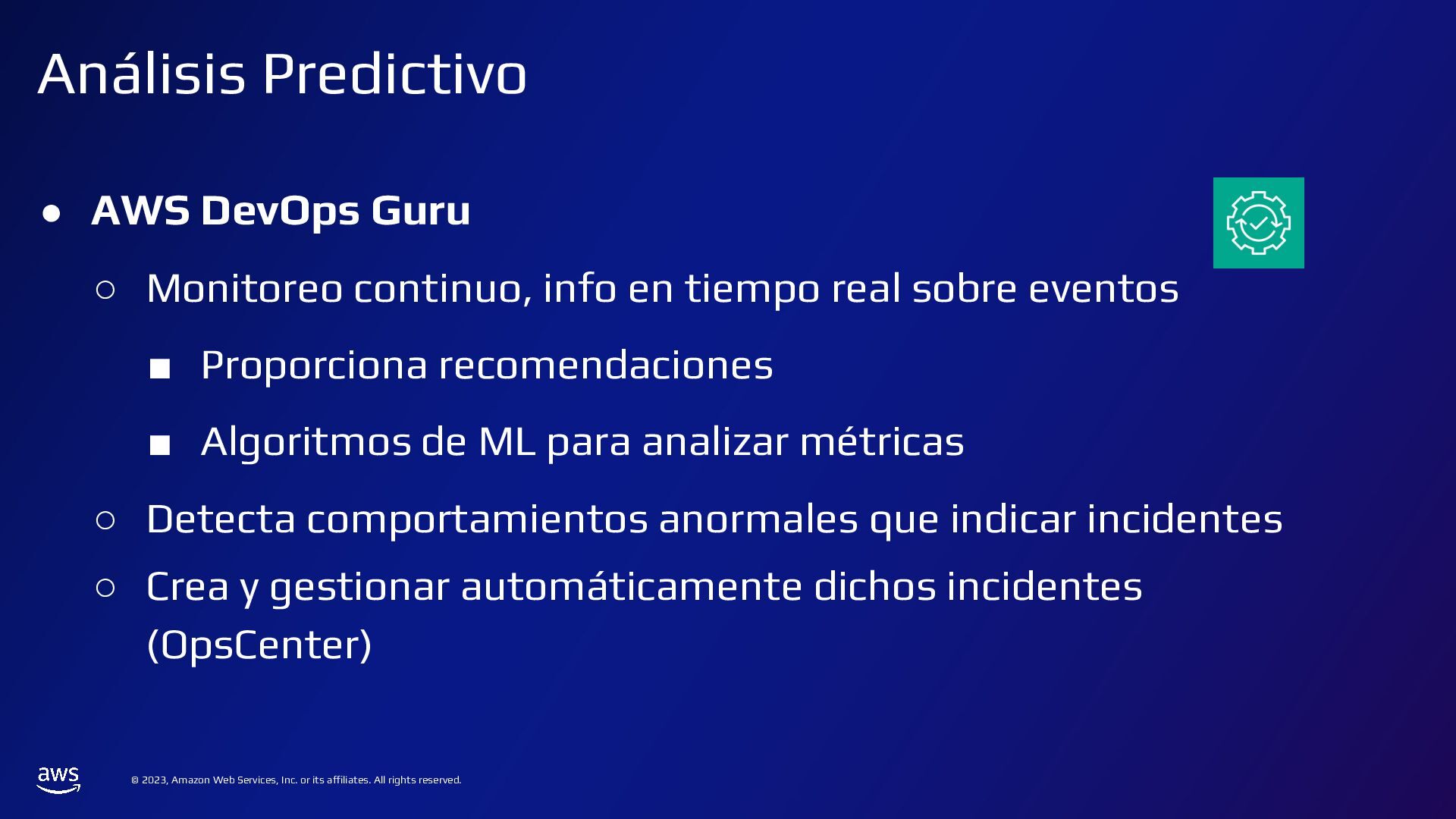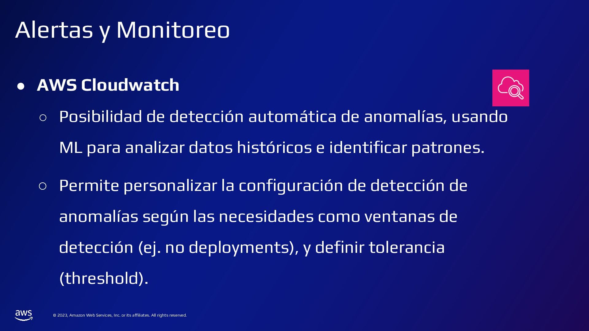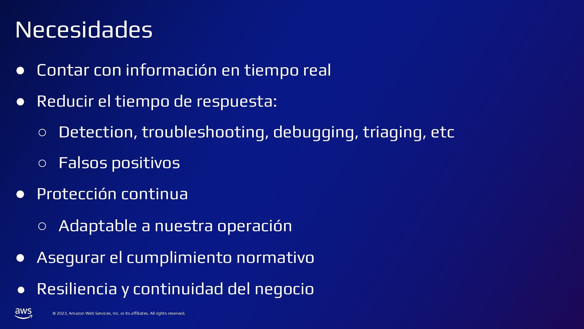 rights reserved. Respuesta Rápida Amazon Detective ◦ Usando algoritmos de aprendizaje automático analiza logs ▪ AWS CloudTrail, VPC Flow Logs ◦ Facilita la investigación de un incidente ▪ Cuentas de usuario, direcciones IP, EC2s y otros recursos ▪ Provee contexto e información sobre acciones realizadas, ubicaciones geográficas, ayudando a comprender los incidentes y tomar decisiones informadas