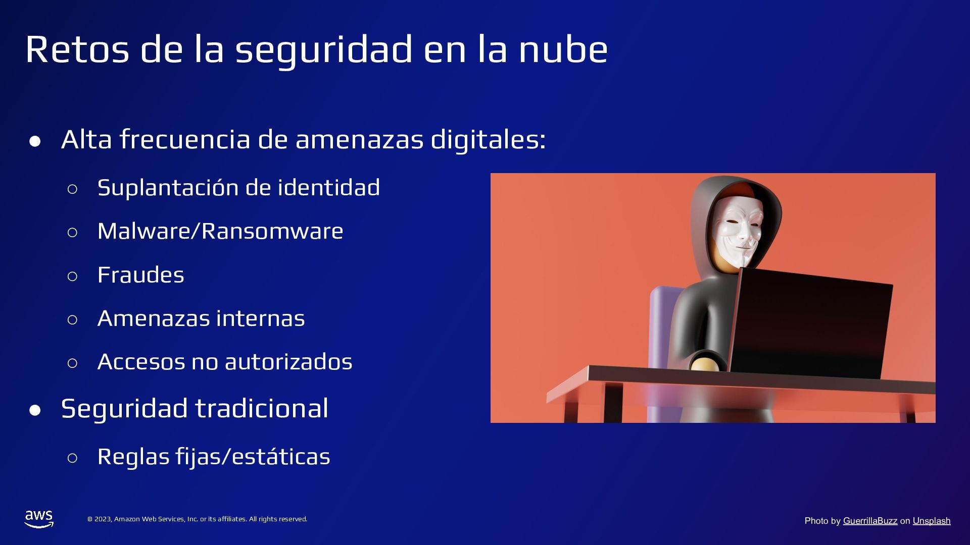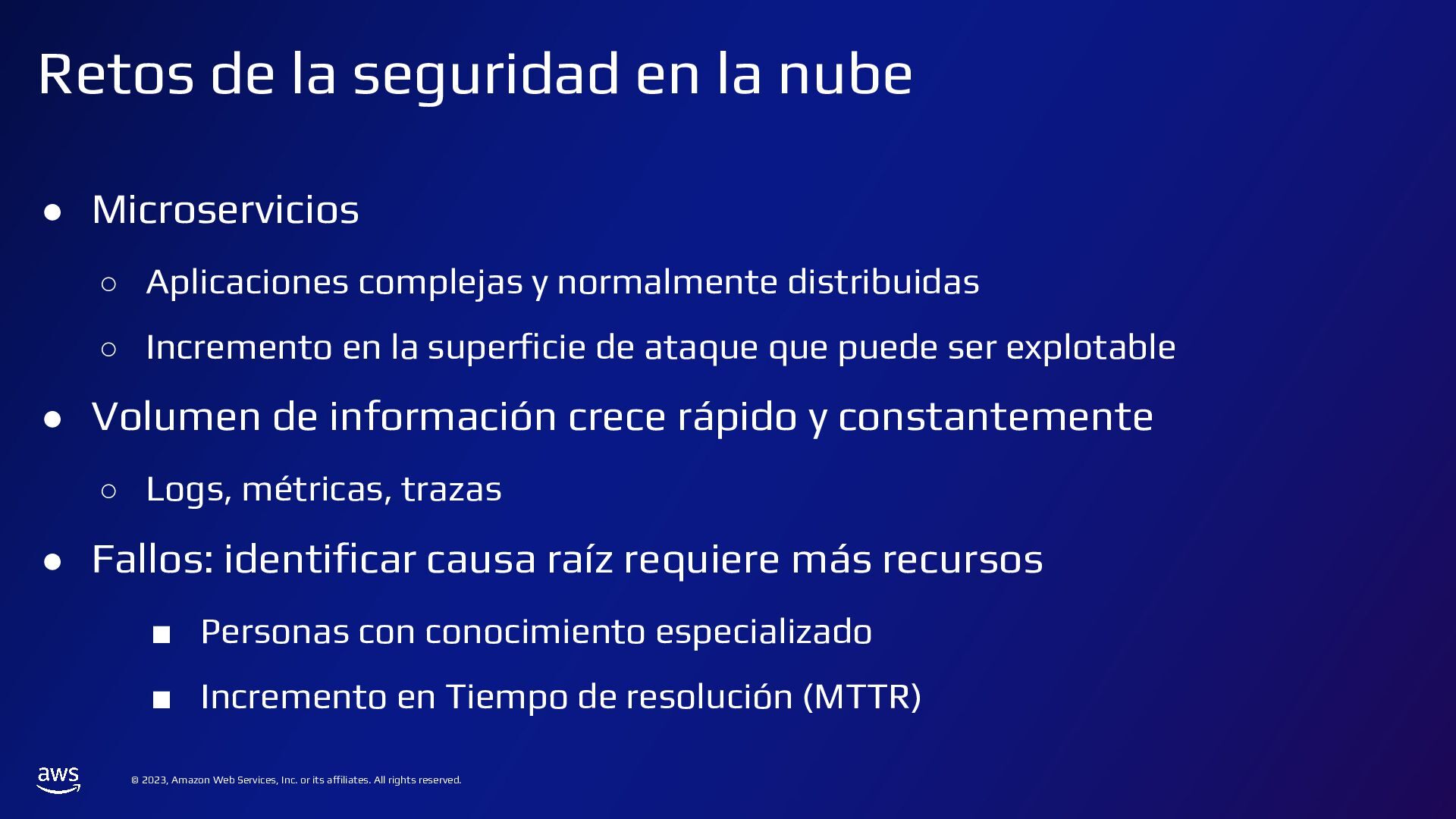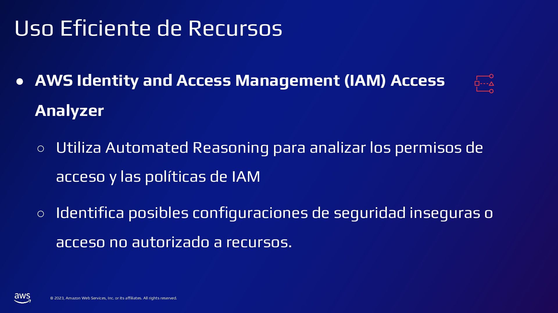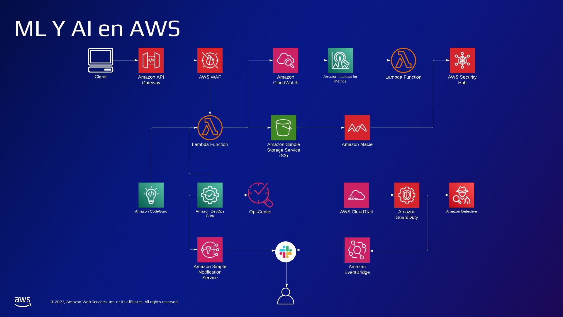 rights reserved. Respuesta Rápida Amazon Detective ◦ Usando algoritmos de aprendizaje automático analiza logs ▪ AWS CloudTrail, VPC Flow Logs ◦ Facilita la investigación de un incidente ▪ Cuentas de usuario, direcciones IP, EC2s y otros recursos ▪ Provee contexto e información sobre acciones realizadas, ubicaciones geográficas, ayudando a comprender los incidentes y tomar decisiones informadas