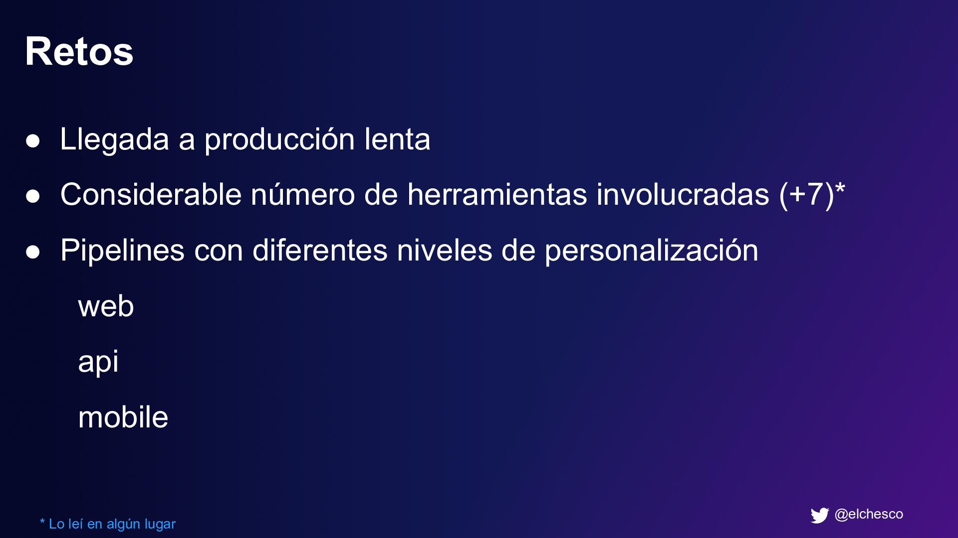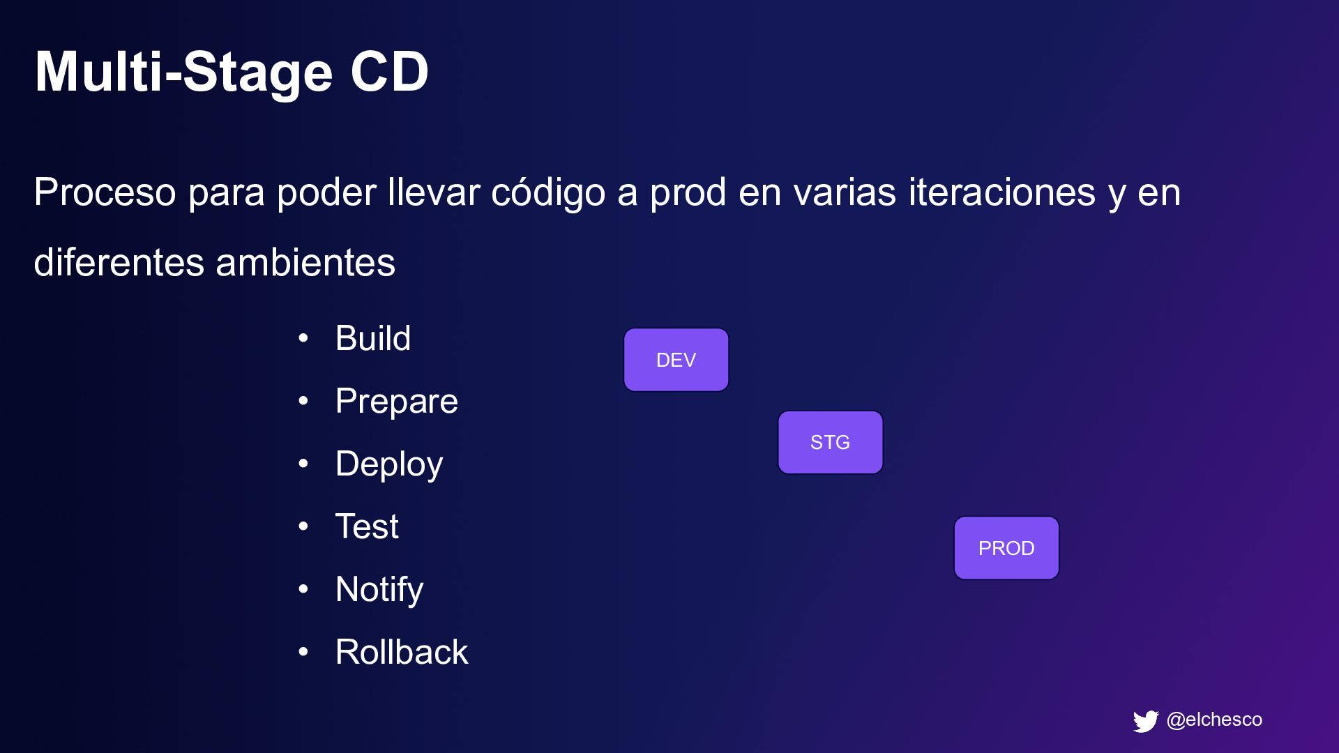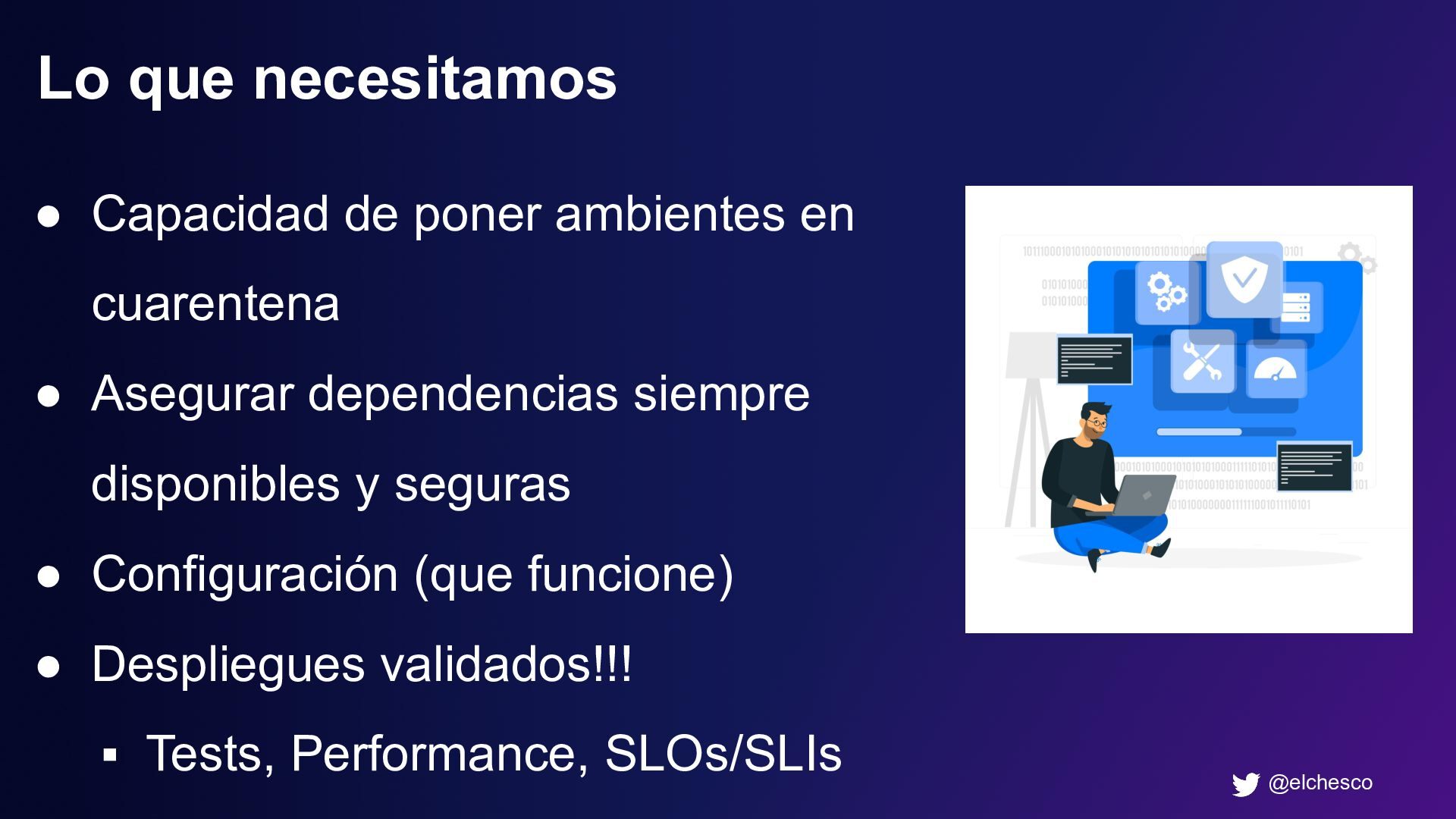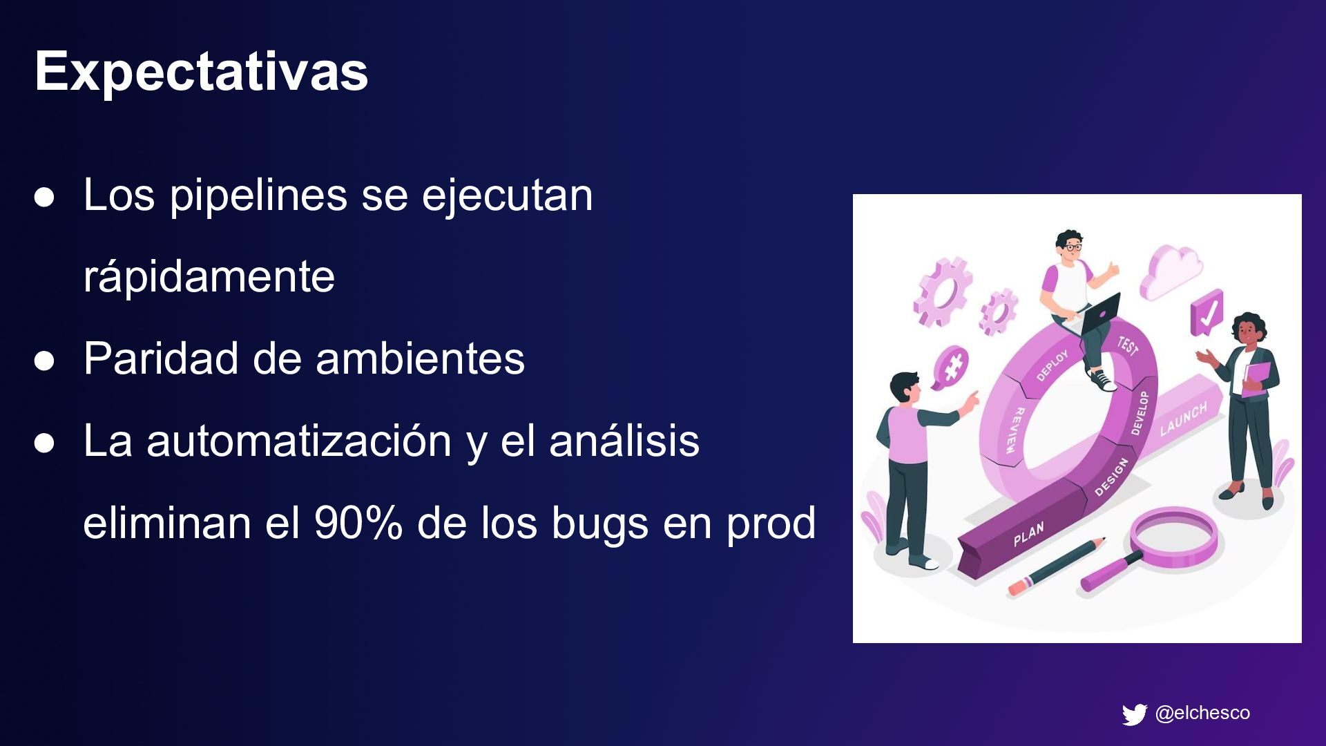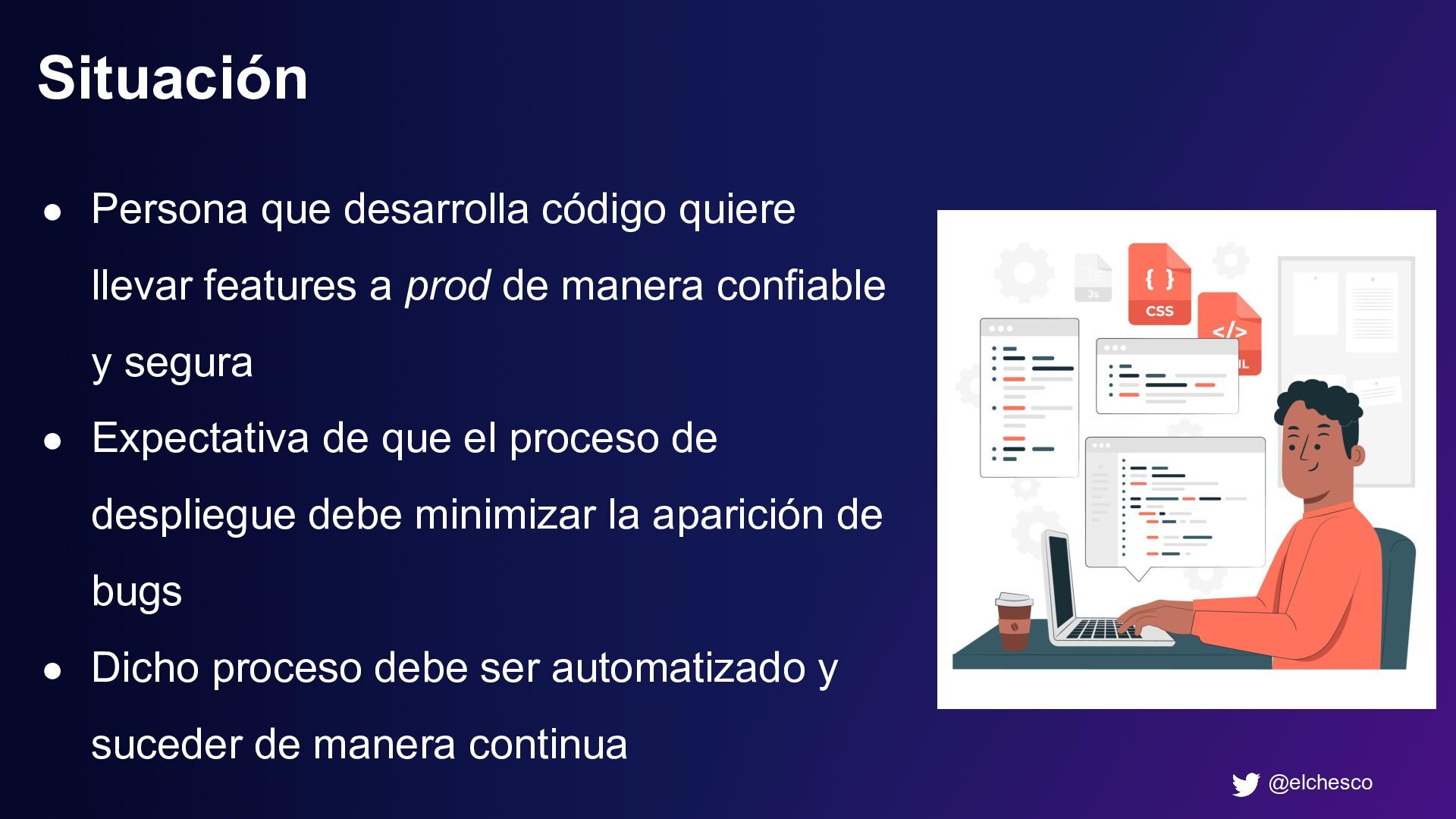 prod de manera confiable y segura • Expectativa de que el proceso de despliegue debe minimizar la aparición de bugs • Dicho proceso debe ser automatizado y suceder de manera continua @elchesco