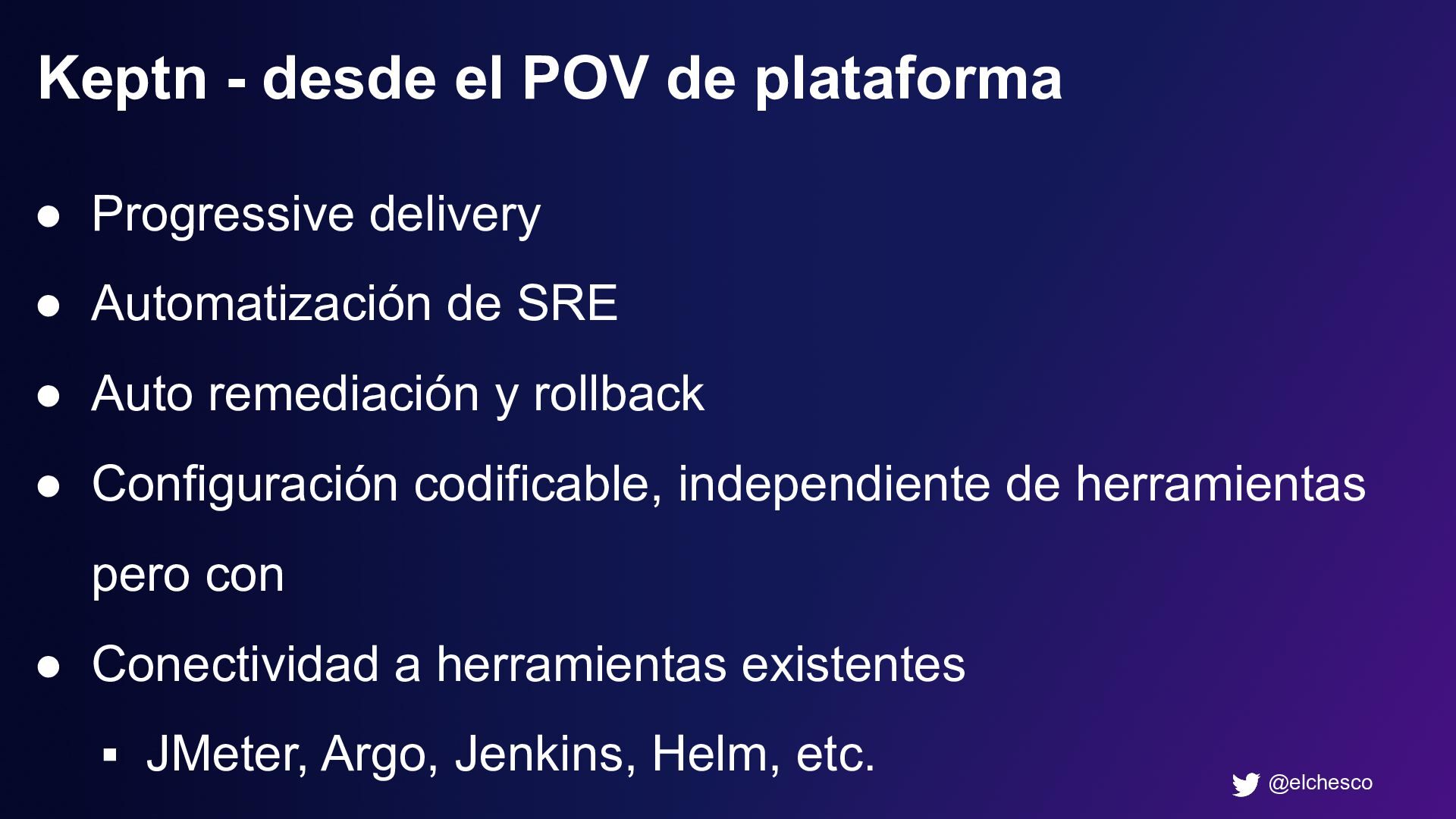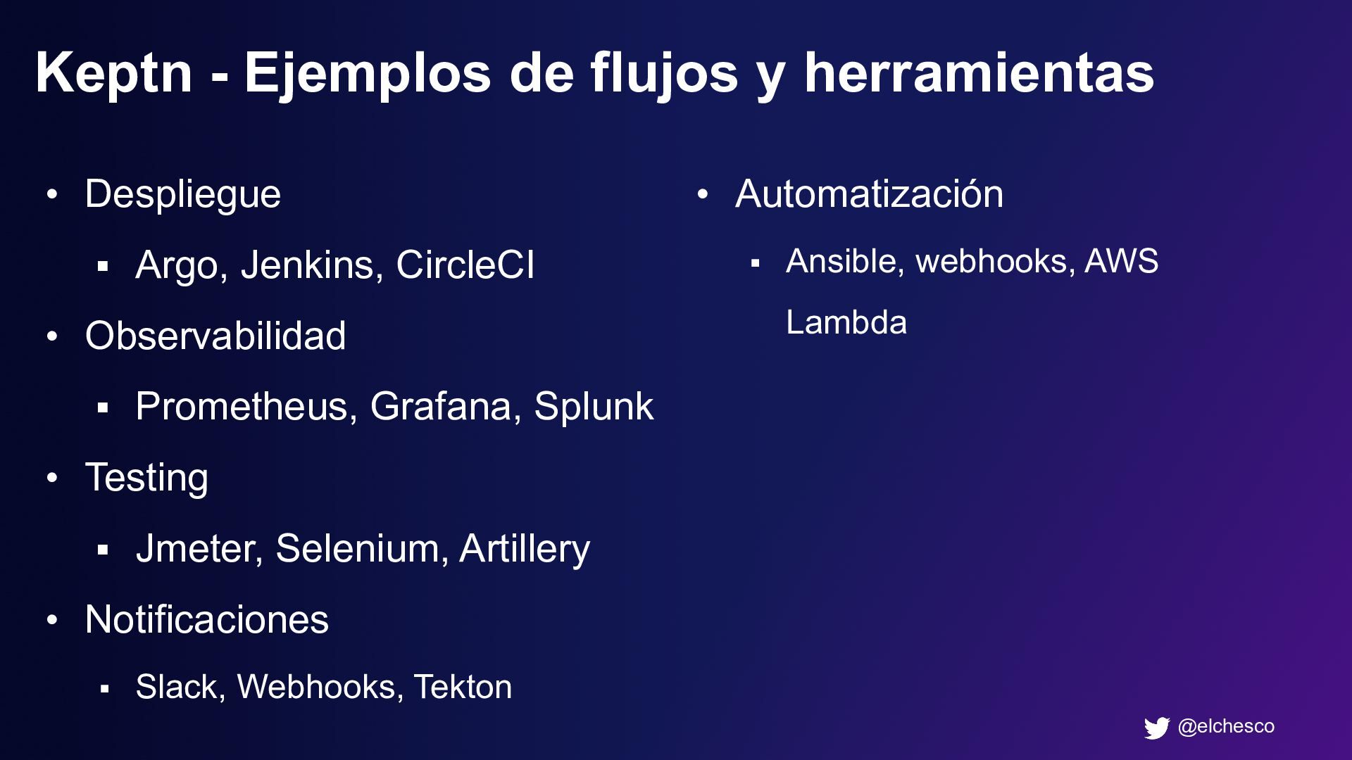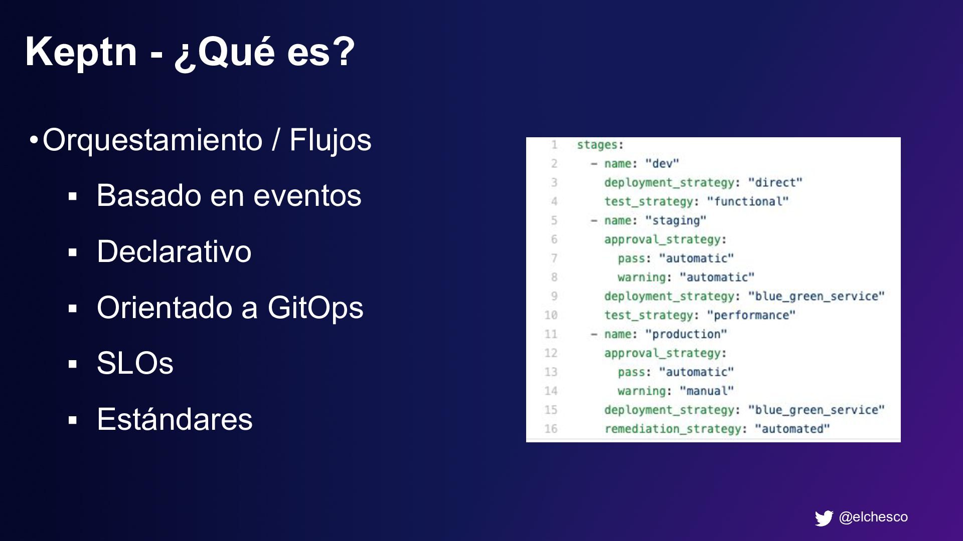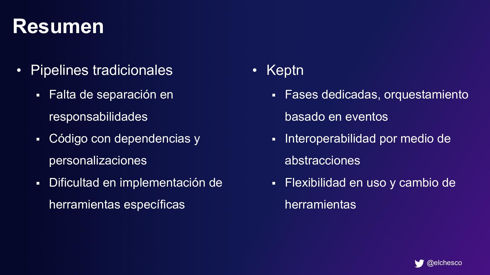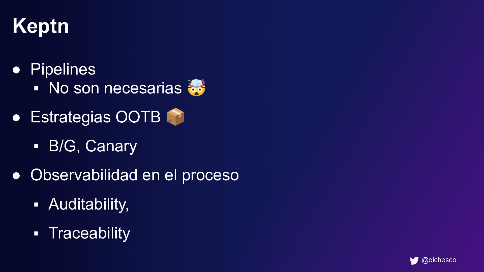 ▪ Código con dependencias y personalizaciones ▪ Dificultad en implementación de herramientas específicas @elchesco • Keptn ▪ Fases dedicadas, orquestamiento basado en eventos ▪ Interoperabilidad por medio de abstracciones ▪ Flexibilidad en uso y cambio de herramientas
