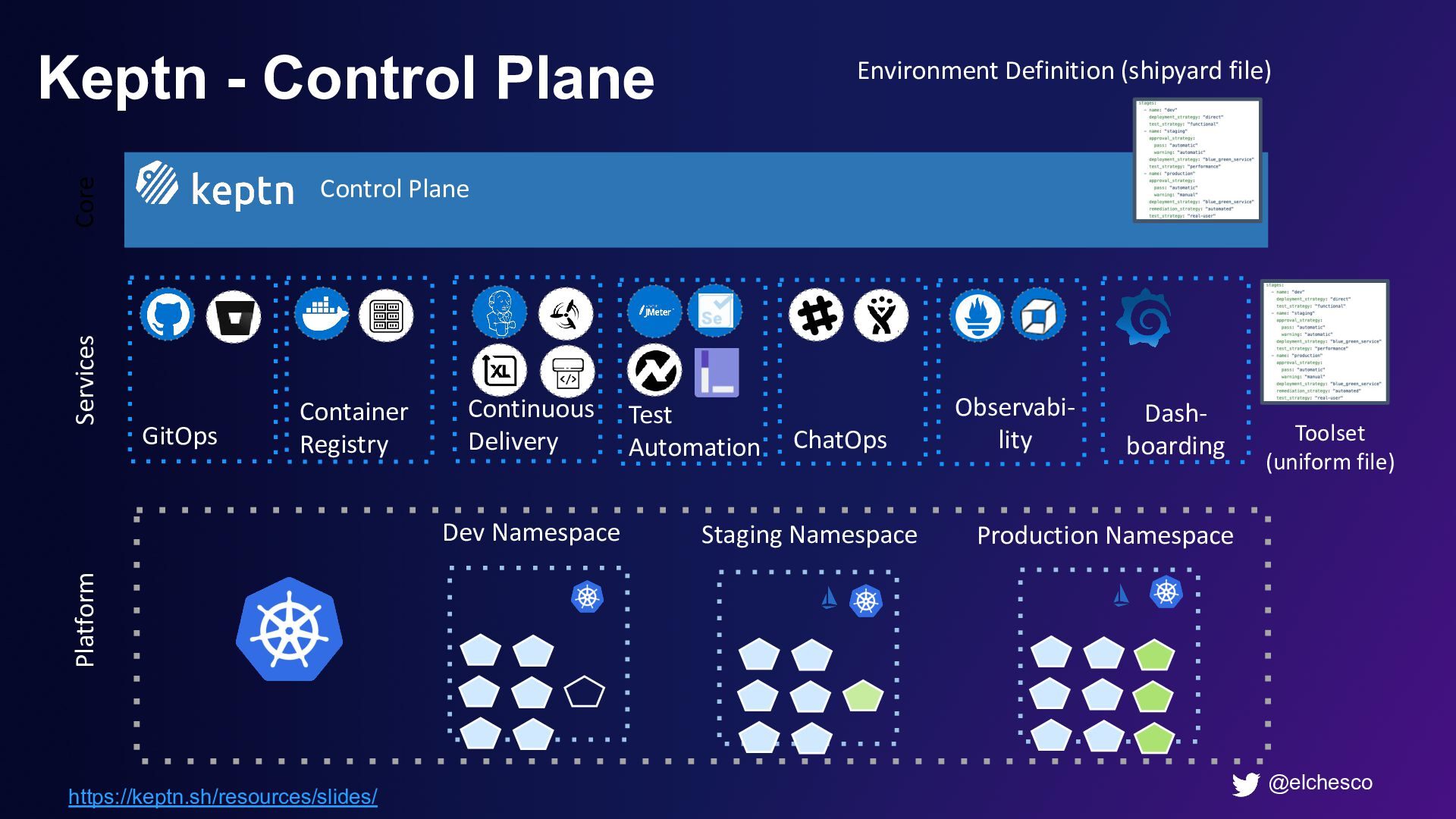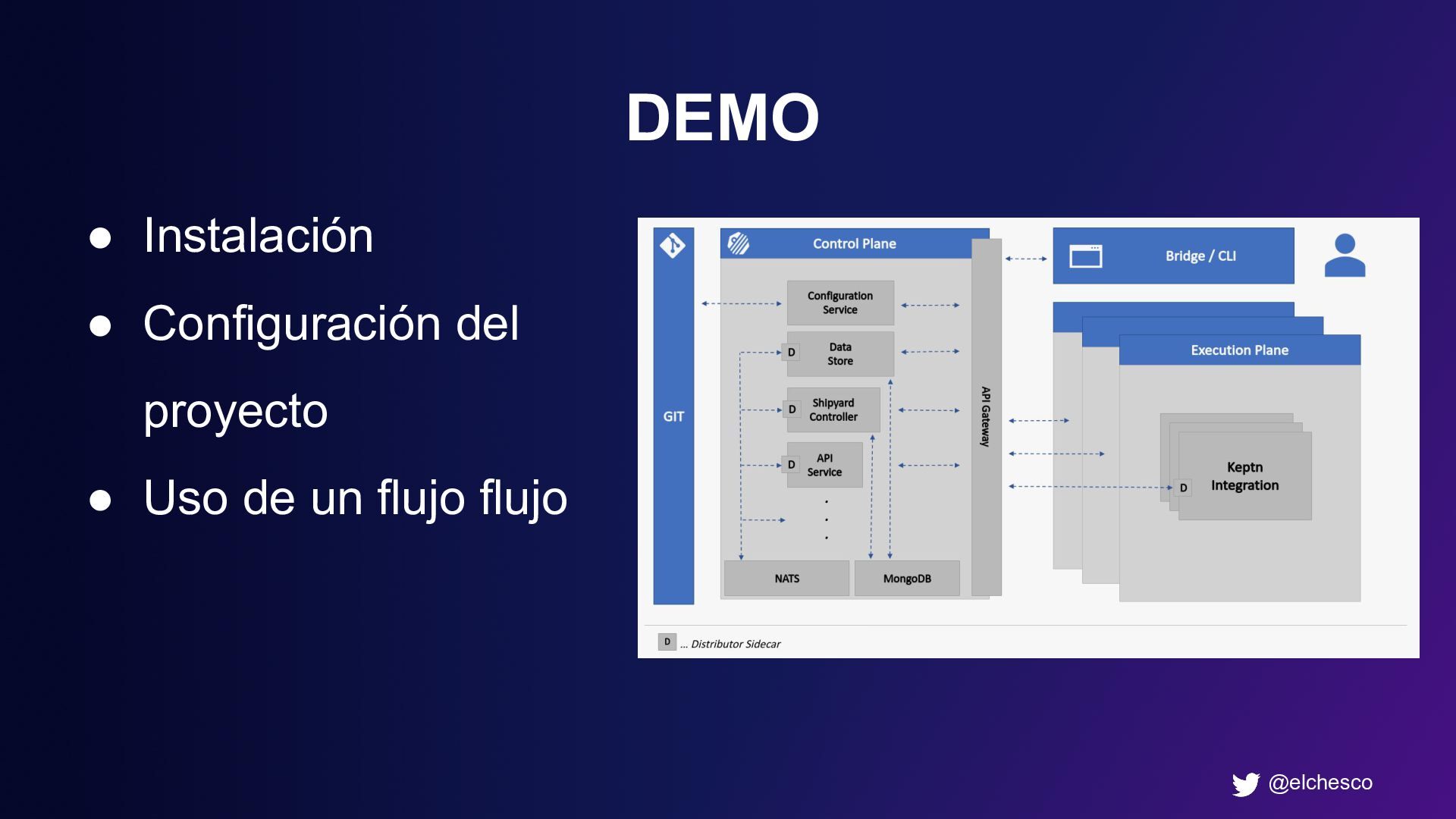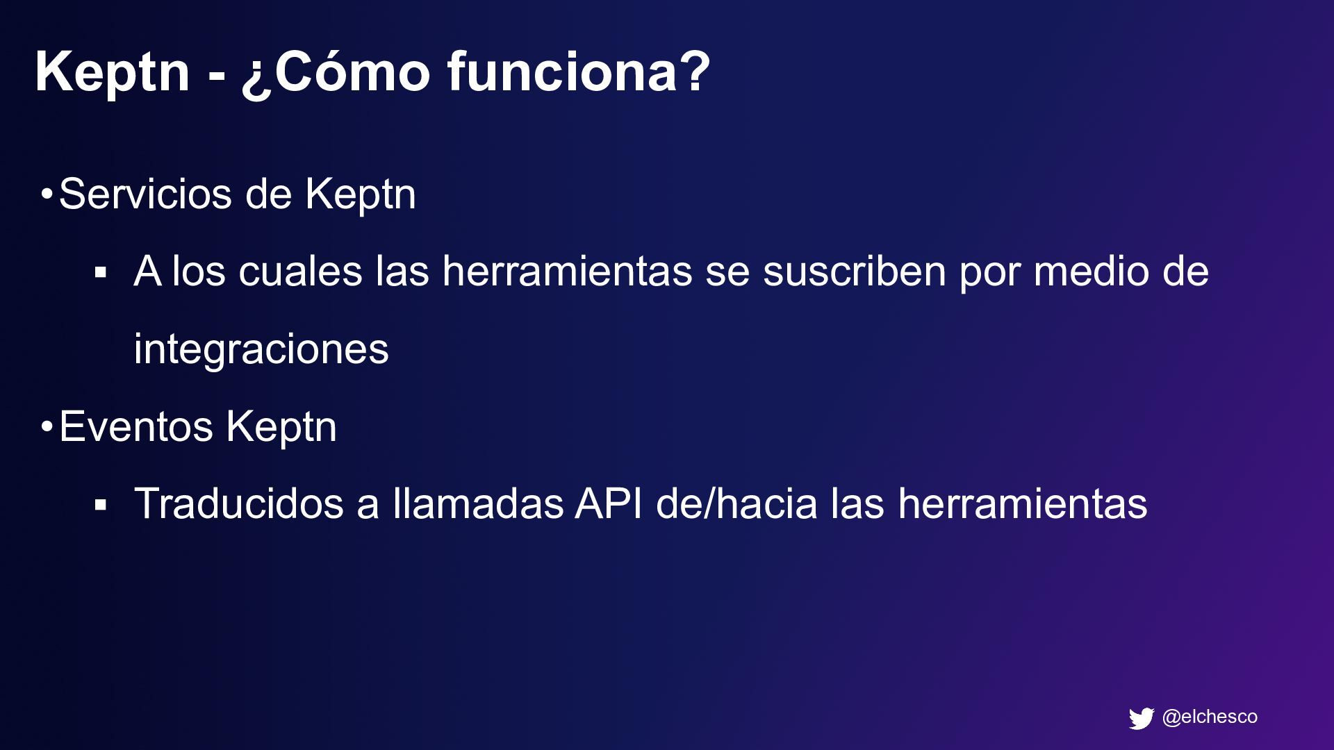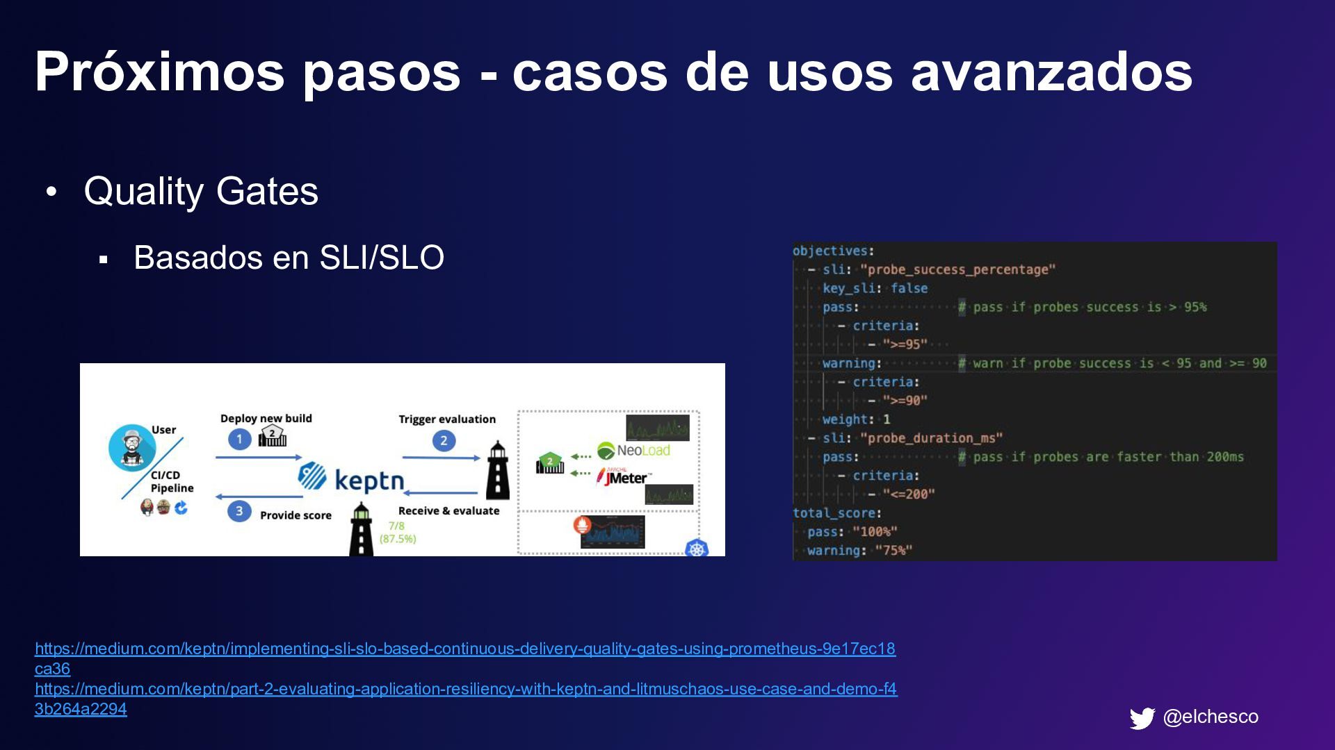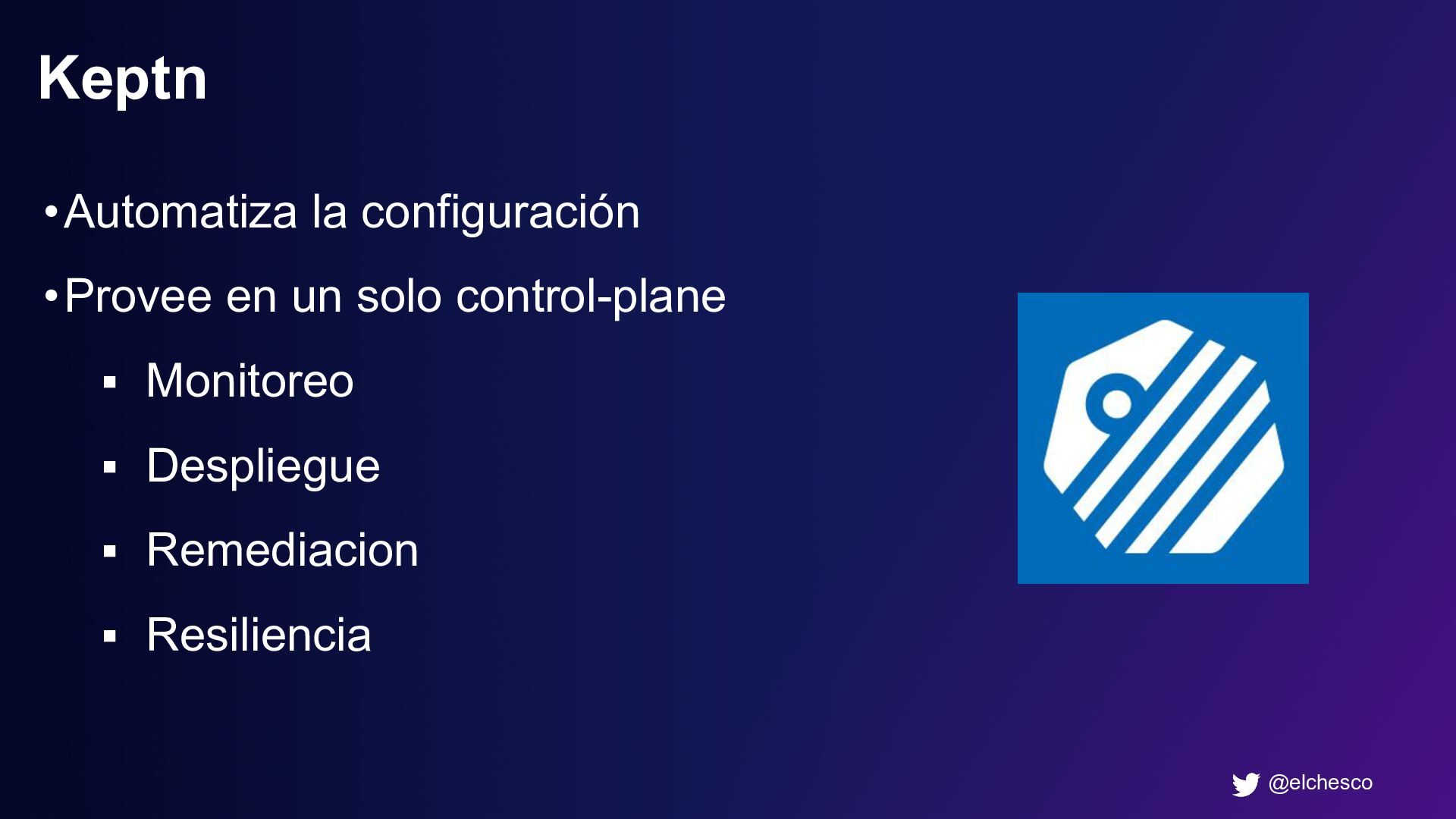 ▪ Código con dependencias y personalizaciones ▪ Dificultad en implementación de herramientas específicas @elchesco • Keptn ▪ Fases dedicadas, orquestamiento basado en eventos ▪ Interoperabilidad por medio de abstracciones ▪ Flexibilidad en uso y cambio de herramientas