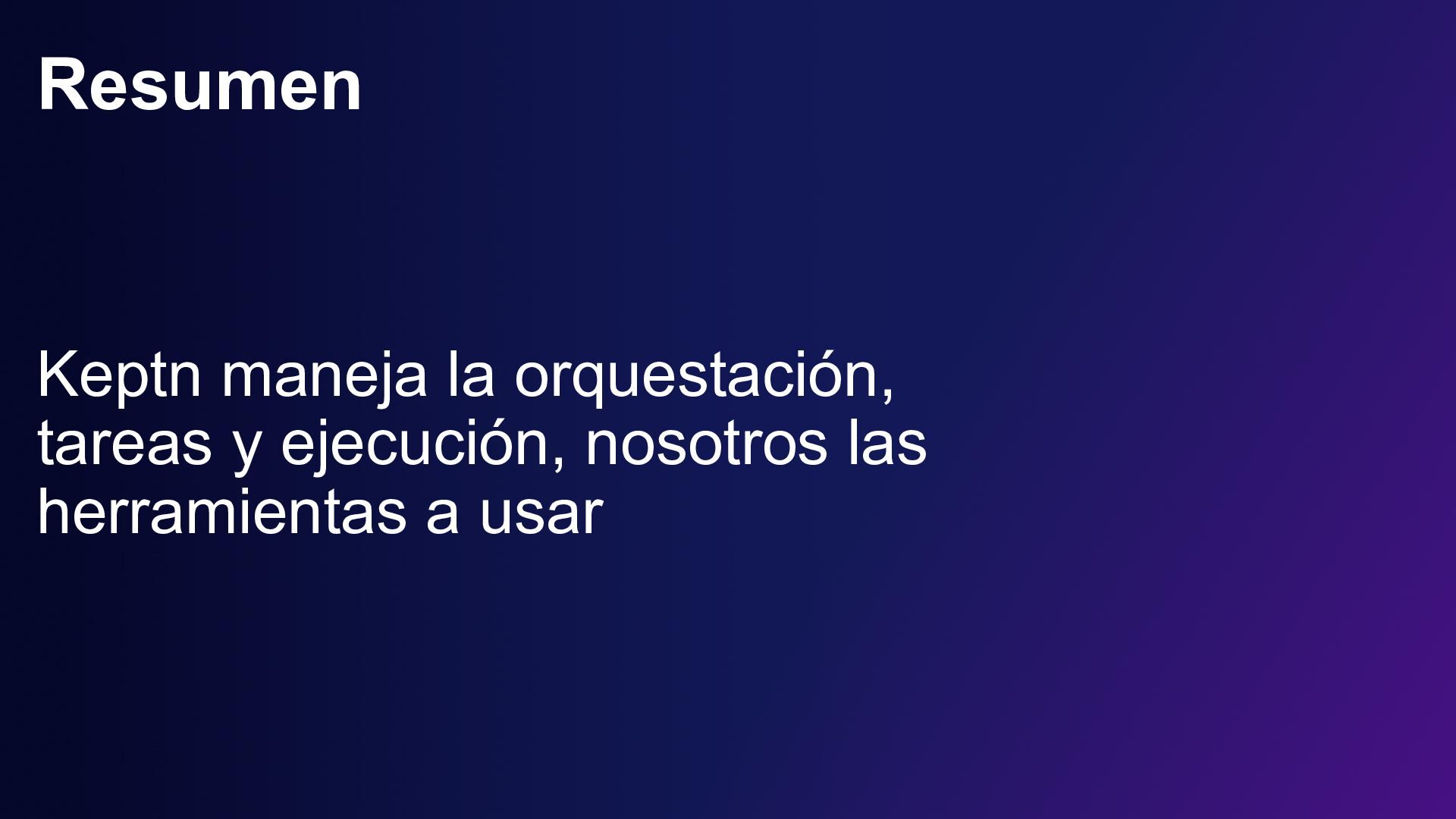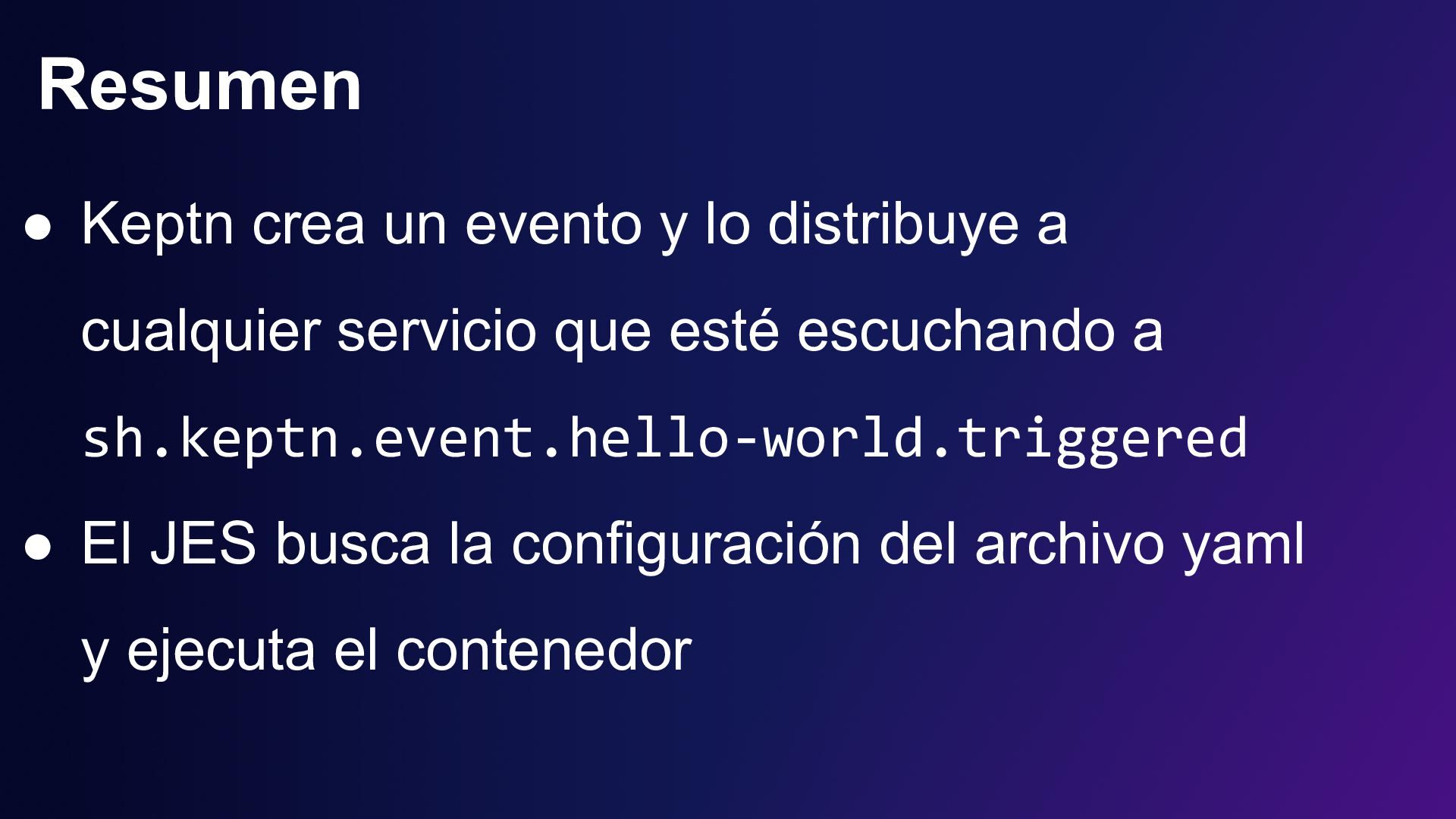 eventos a Keptn (un evento .started y un evento .finished correspondiente) • Keptn recibe un par de eventos .started y .finished de JES, por lo que sabe que la tarea está completa • Keptn termina la secuencia Resumen