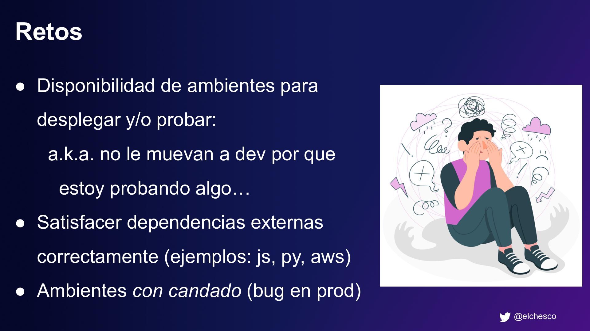 no le muevan a dev por que estoy probando algo… • Satisfacer dependencias externas correctamente (ejemplos: js, py, aws) • Ambientes con candado (bug en prod) @elchesco