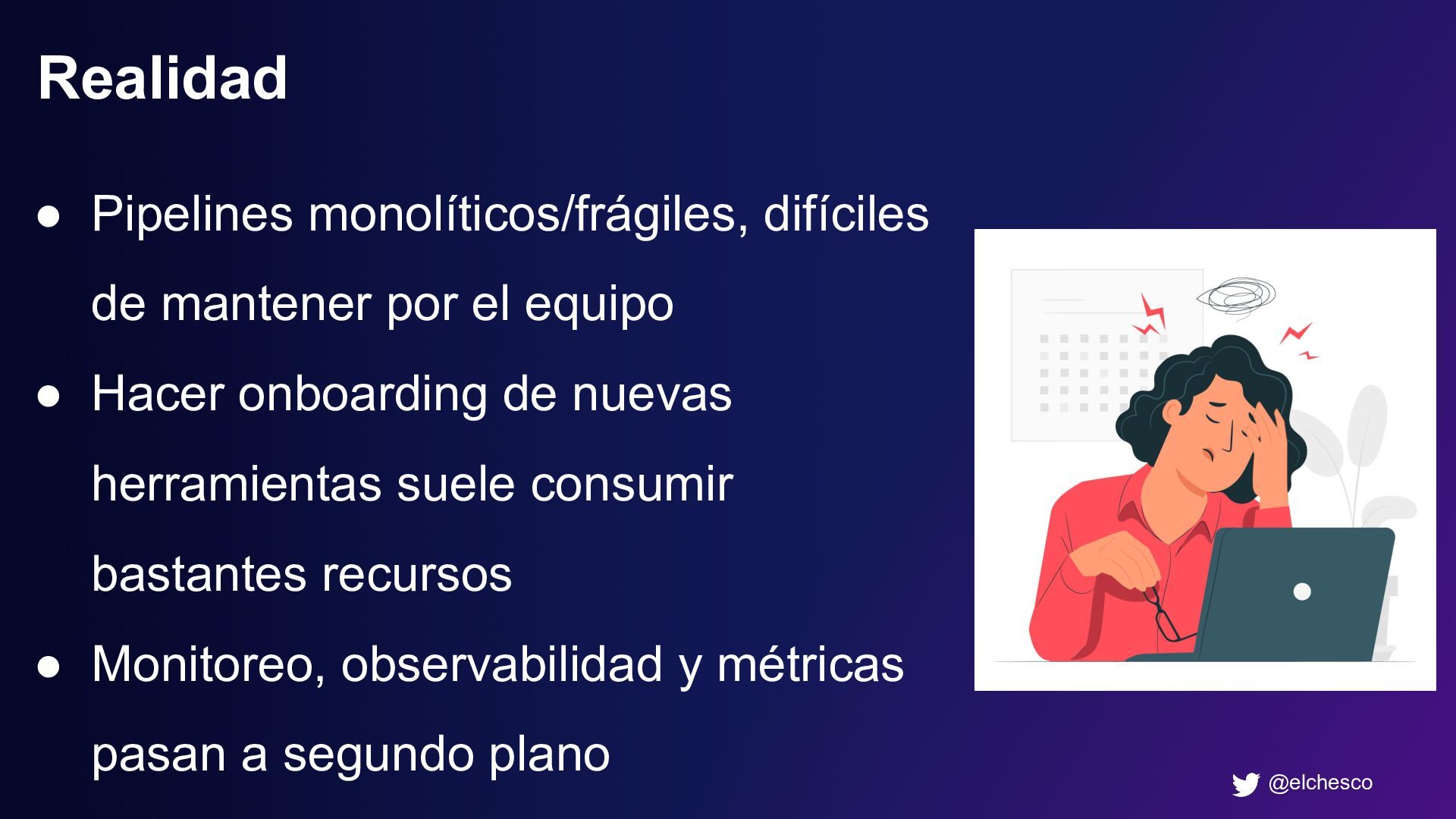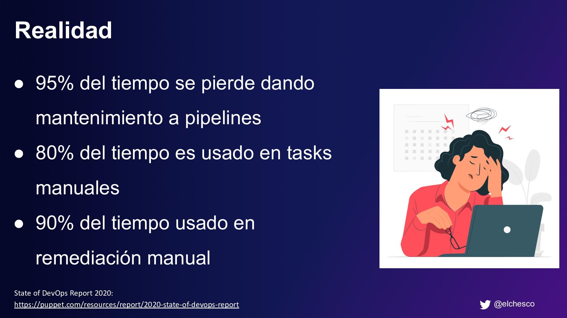 pipelines • 80% del tiempo es usado en tasks manuales • 90% del tiempo usado en remediación manual @elchesco State of DevOps Report 2020: https://puppet.com/resources/report/2020-state-of-devops-report