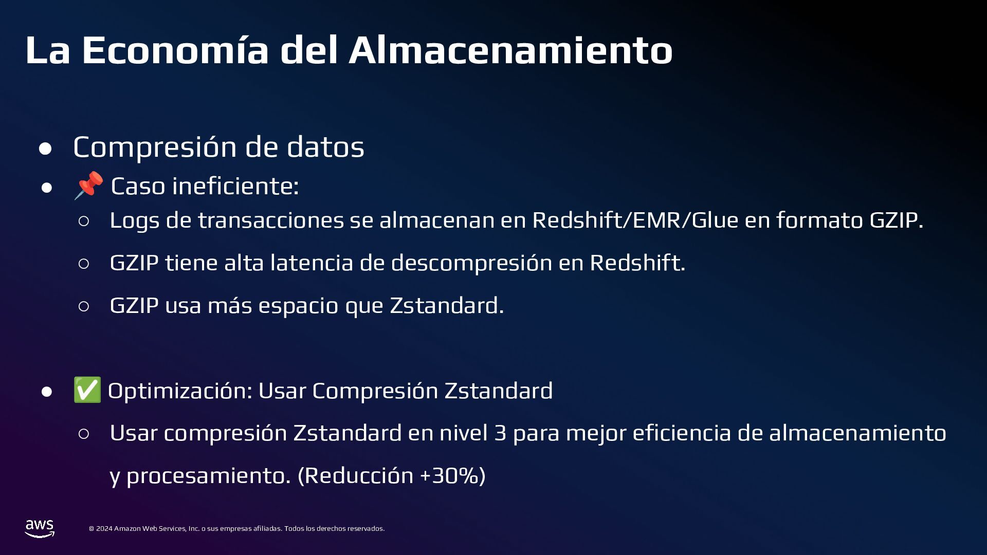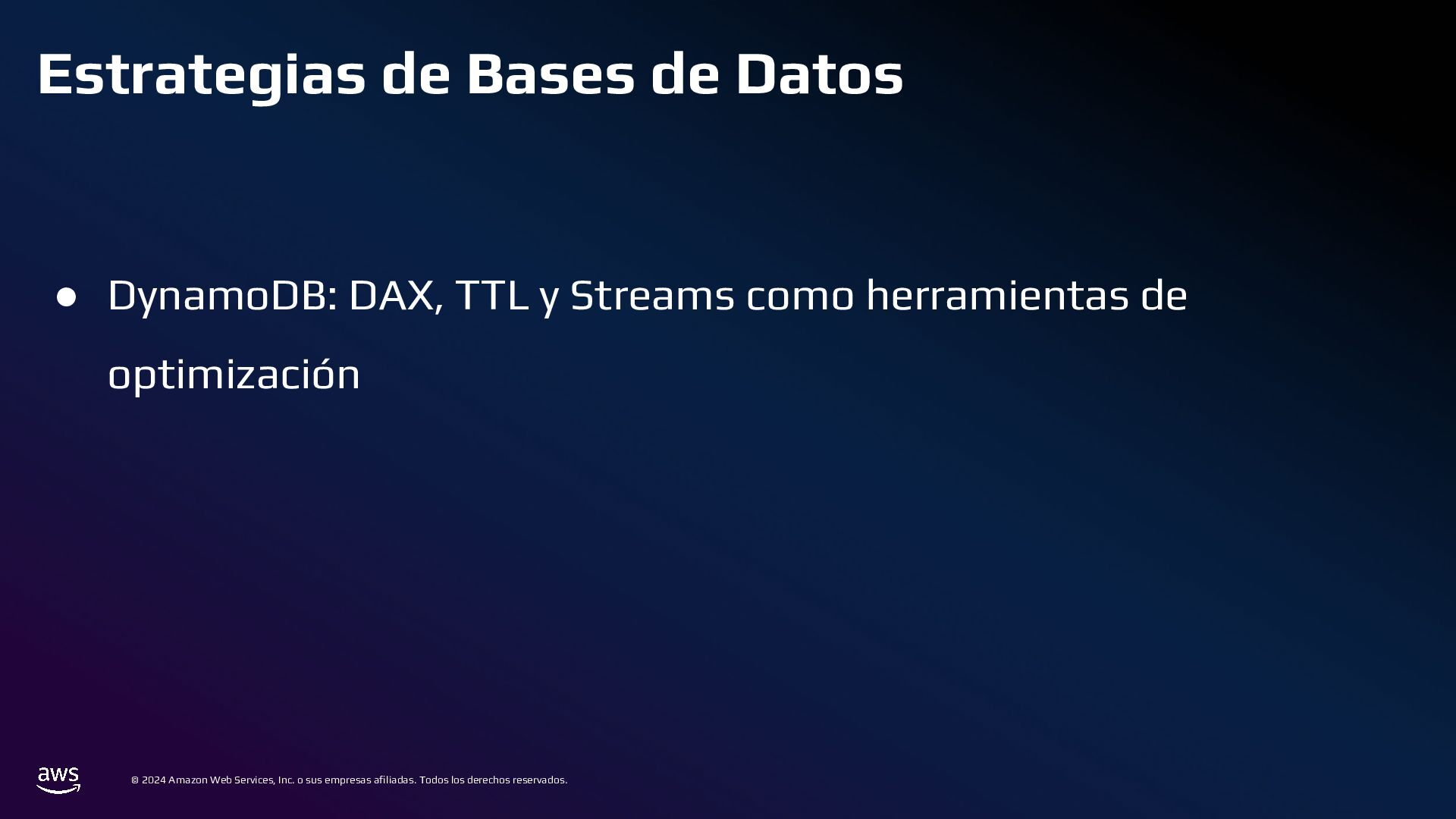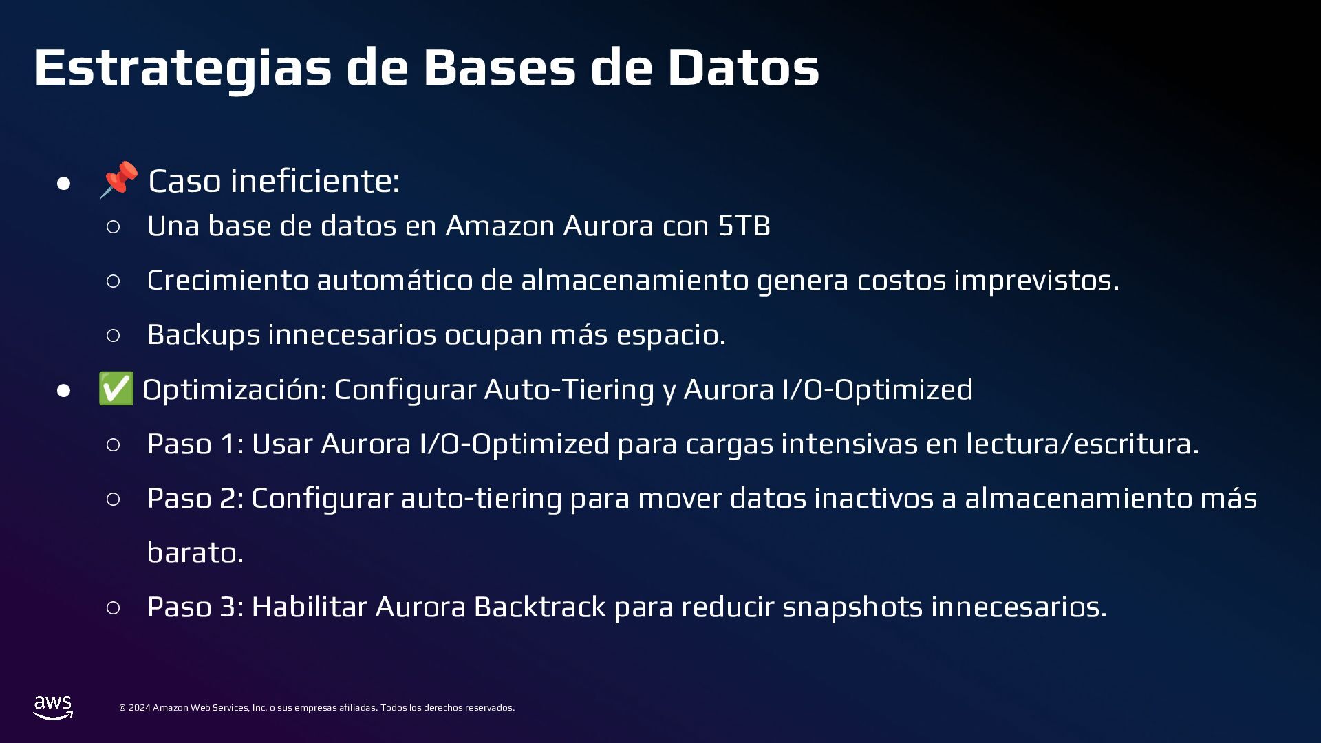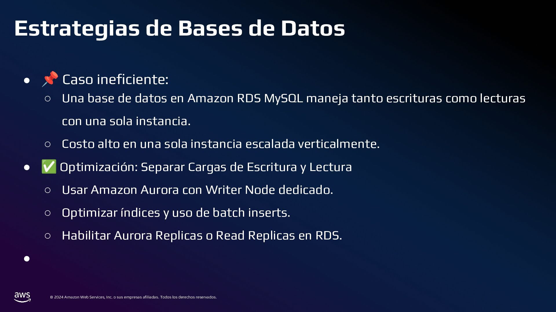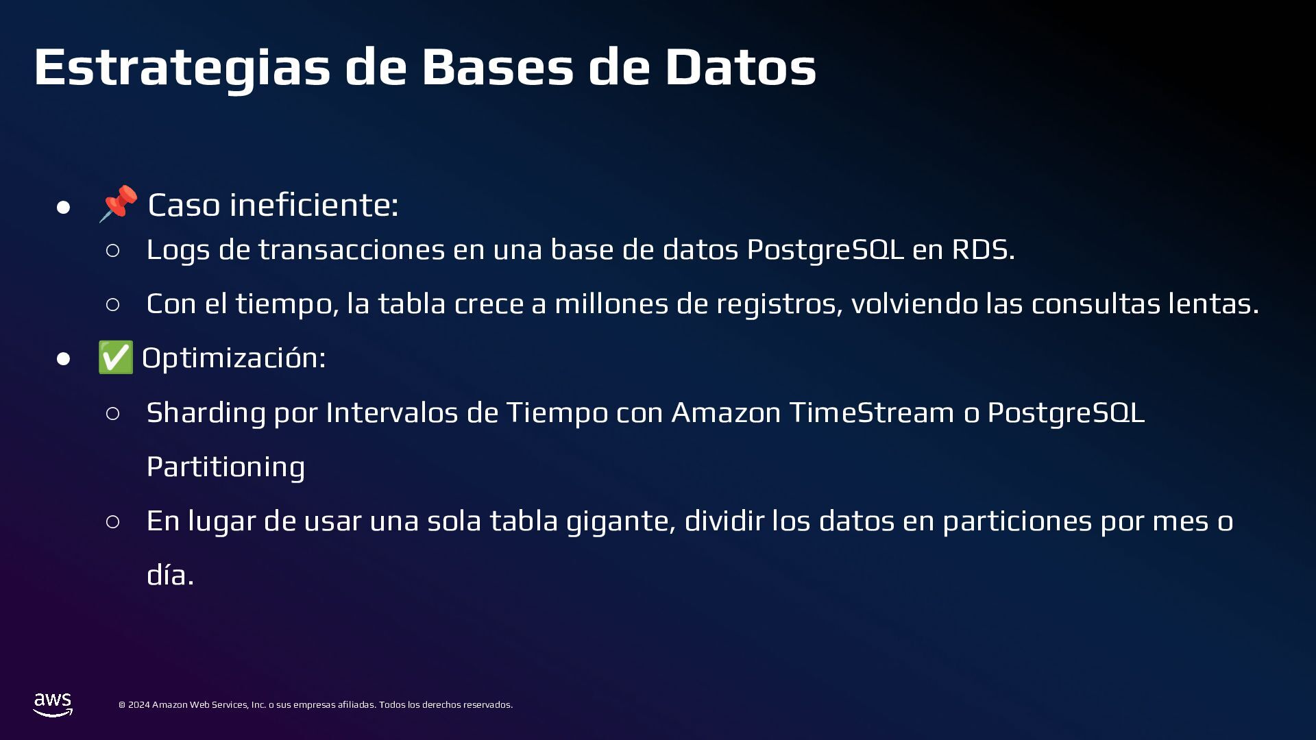 Todos los derechos reservados. Estrategias de Bases de Datos • 📌 Caso ineficiente: ◦ Logs de transacciones en una base de datos PostgreSQL en RDS. ◦ Con el tiempo, la tabla crece a millones de registros, volviendo las consultas lentas. • ✅ Optimización: ◦ Sharding por Intervalos de Tiempo con Amazon TimeStream o PostgreSQL Partitioning ◦ En lugar de usar una sola tabla gigante, dividir los datos en particiones por mes o día.