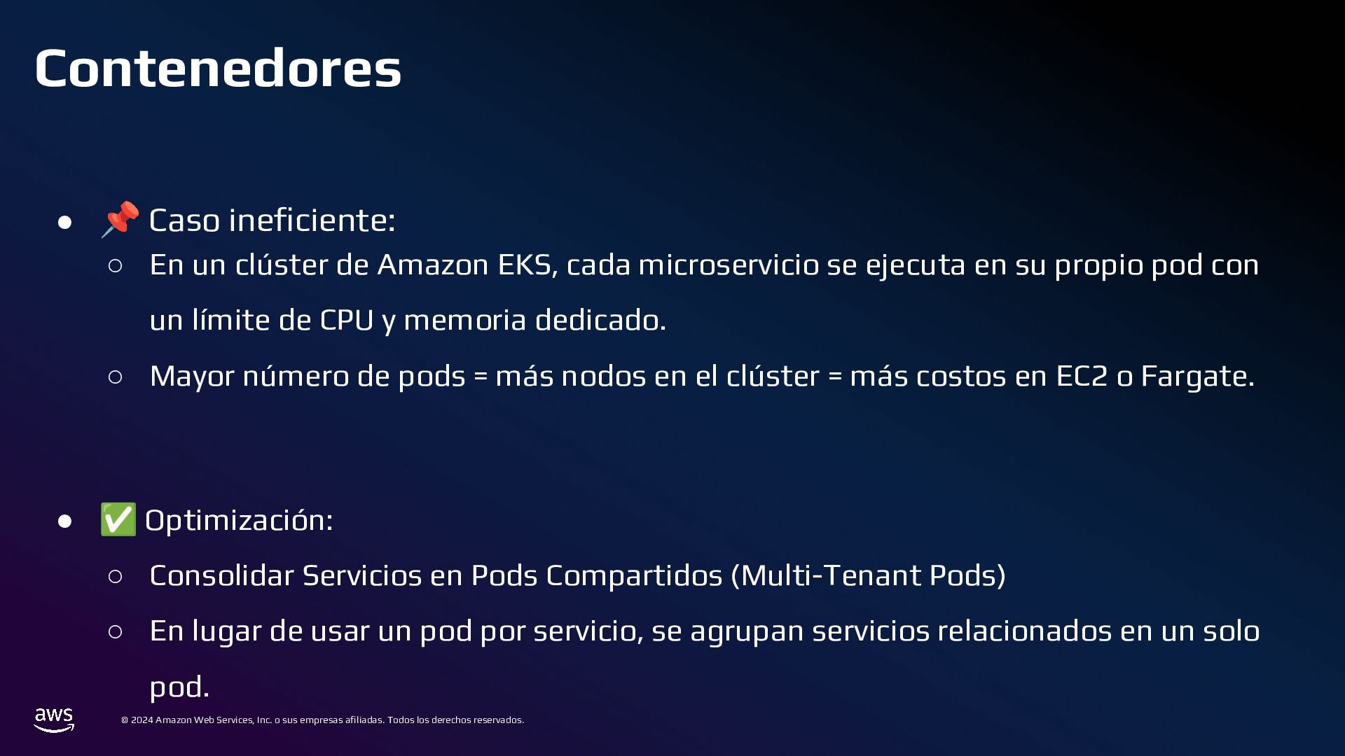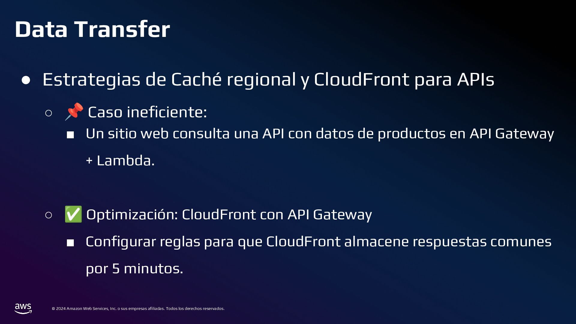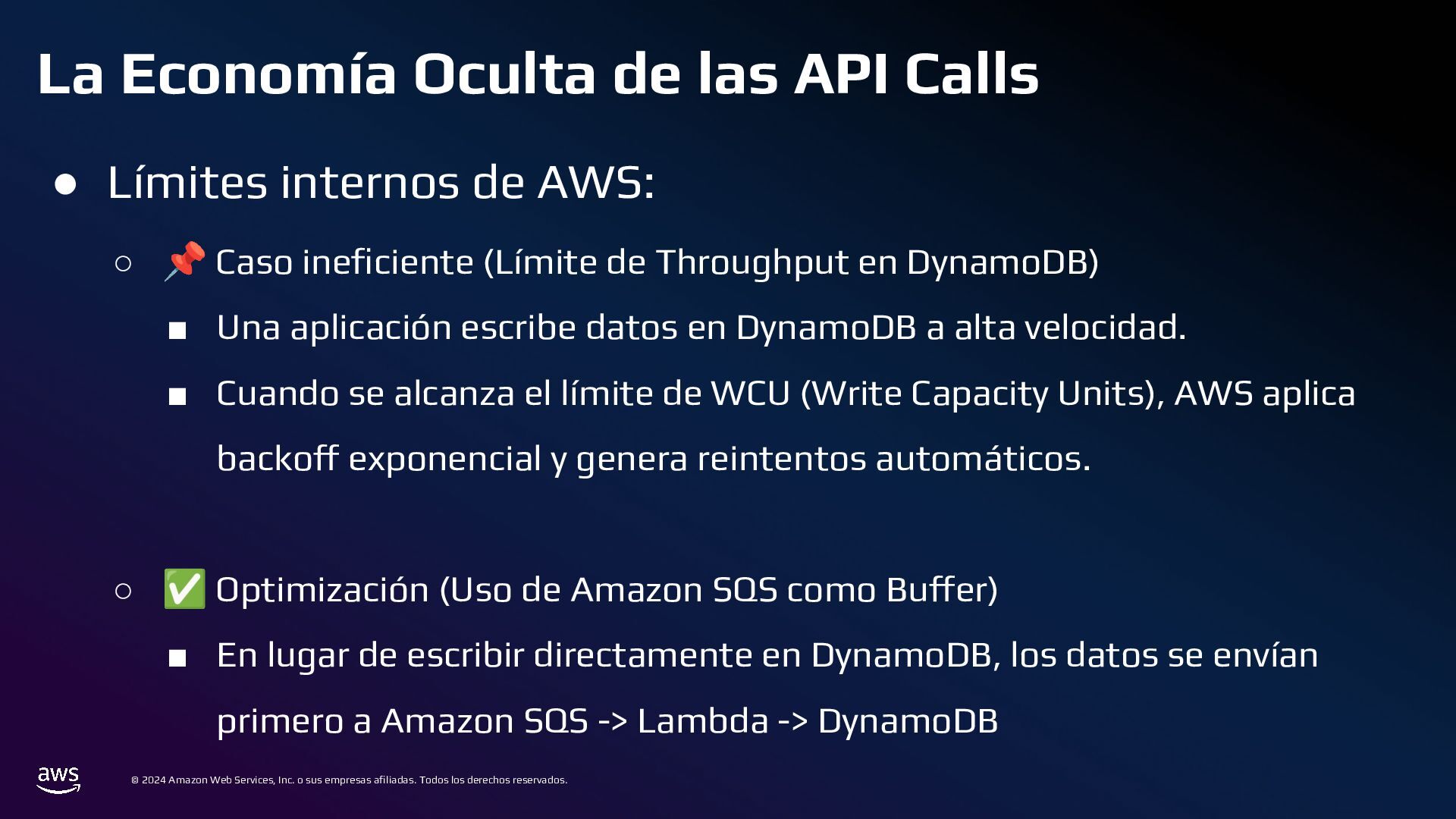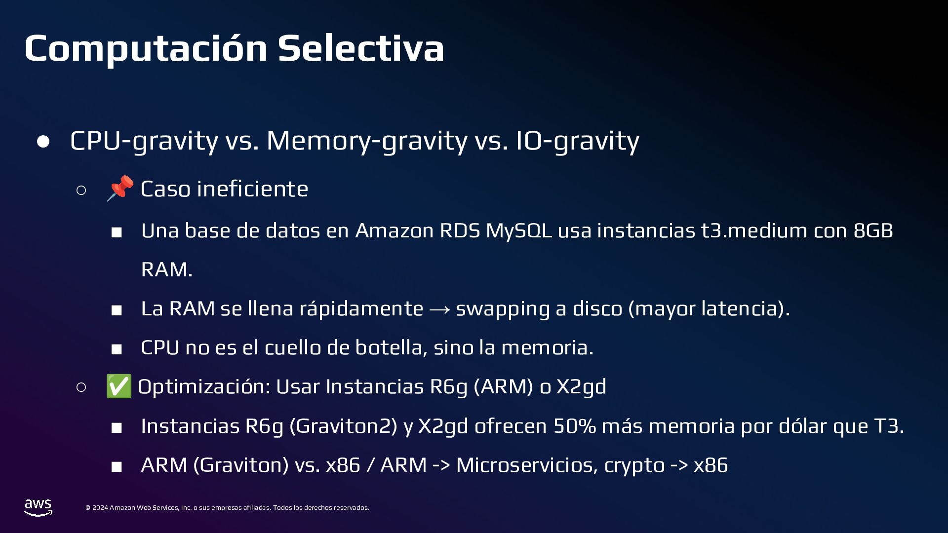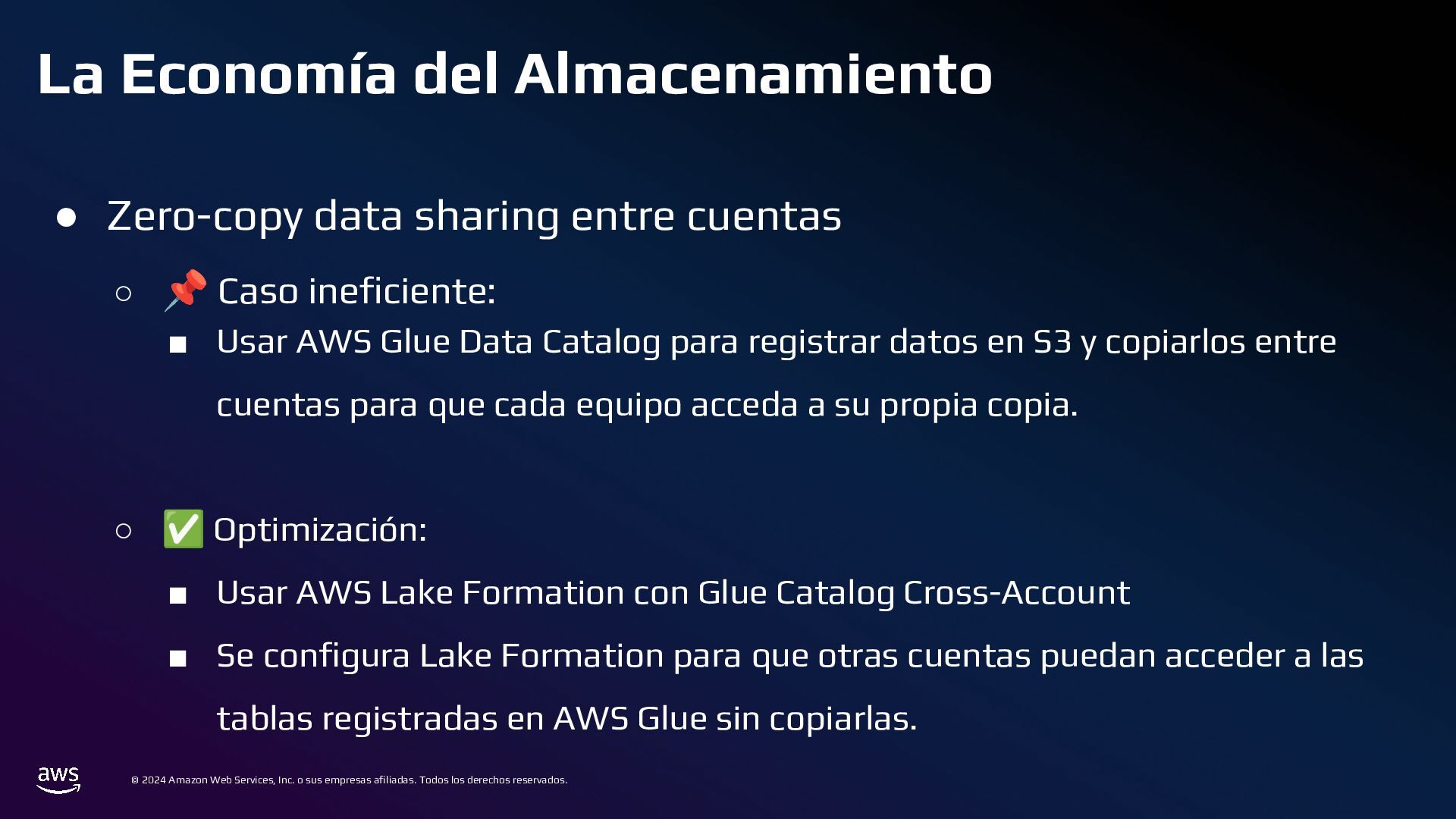 Todos los derechos reservados. Estrategias de Bases de Datos • 📌 Caso ineficiente: ◦ Logs de transacciones en una base de datos PostgreSQL en RDS. ◦ Con el tiempo, la tabla crece a millones de registros, volviendo las consultas lentas. • ✅ Optimización: ◦ Sharding por Intervalos de Tiempo con Amazon TimeStream o PostgreSQL Partitioning ◦ En lugar de usar una sola tabla gigante, dividir los datos en particiones por mes o día.