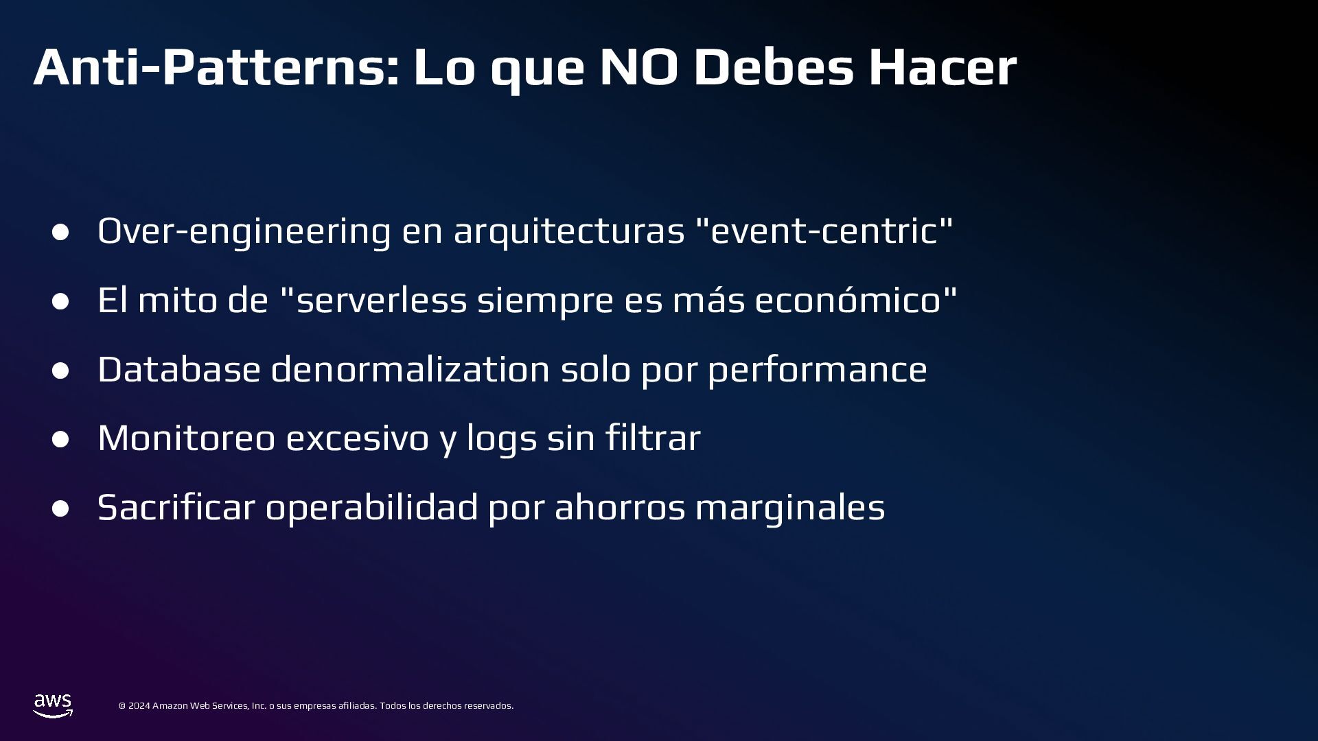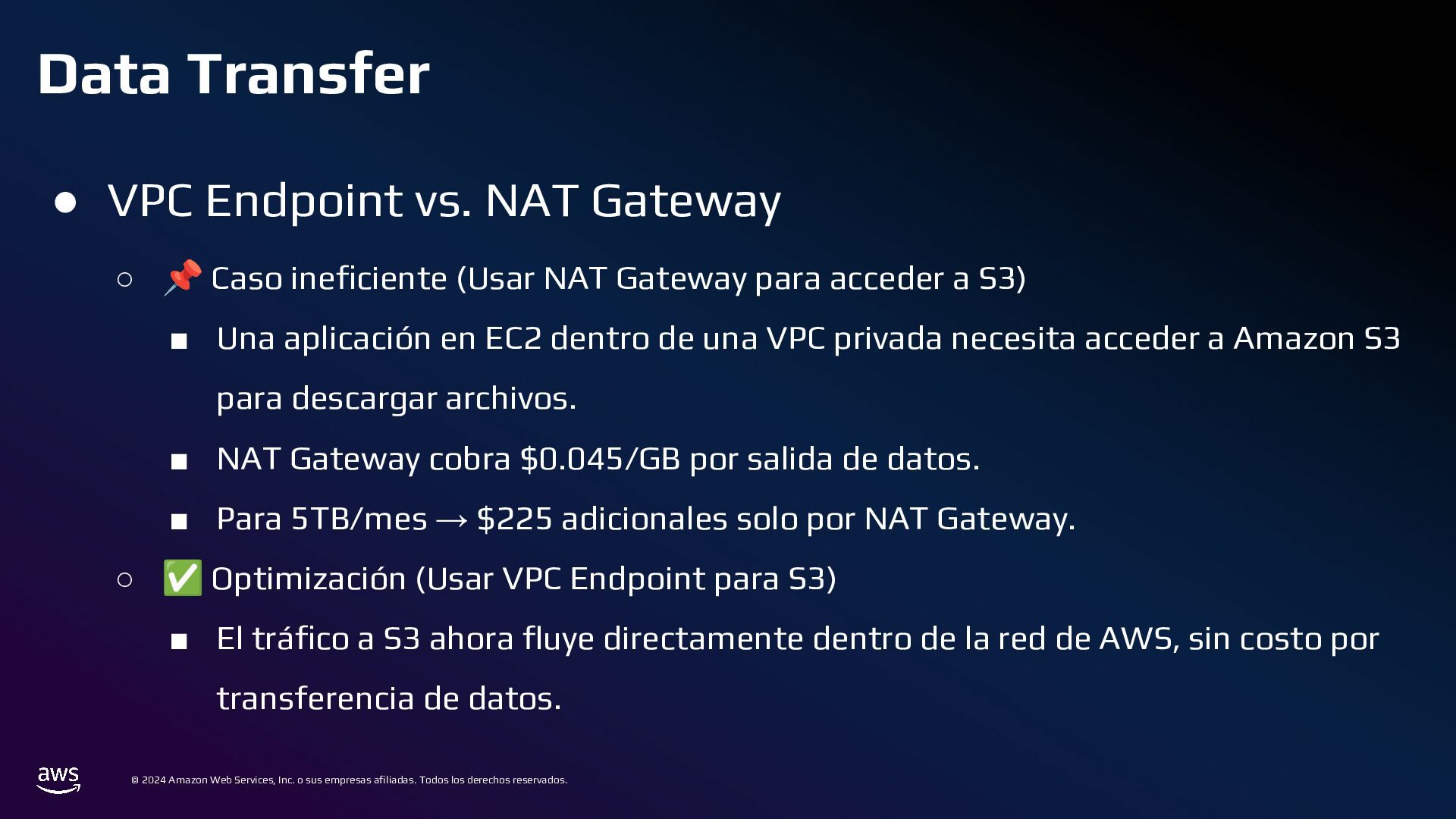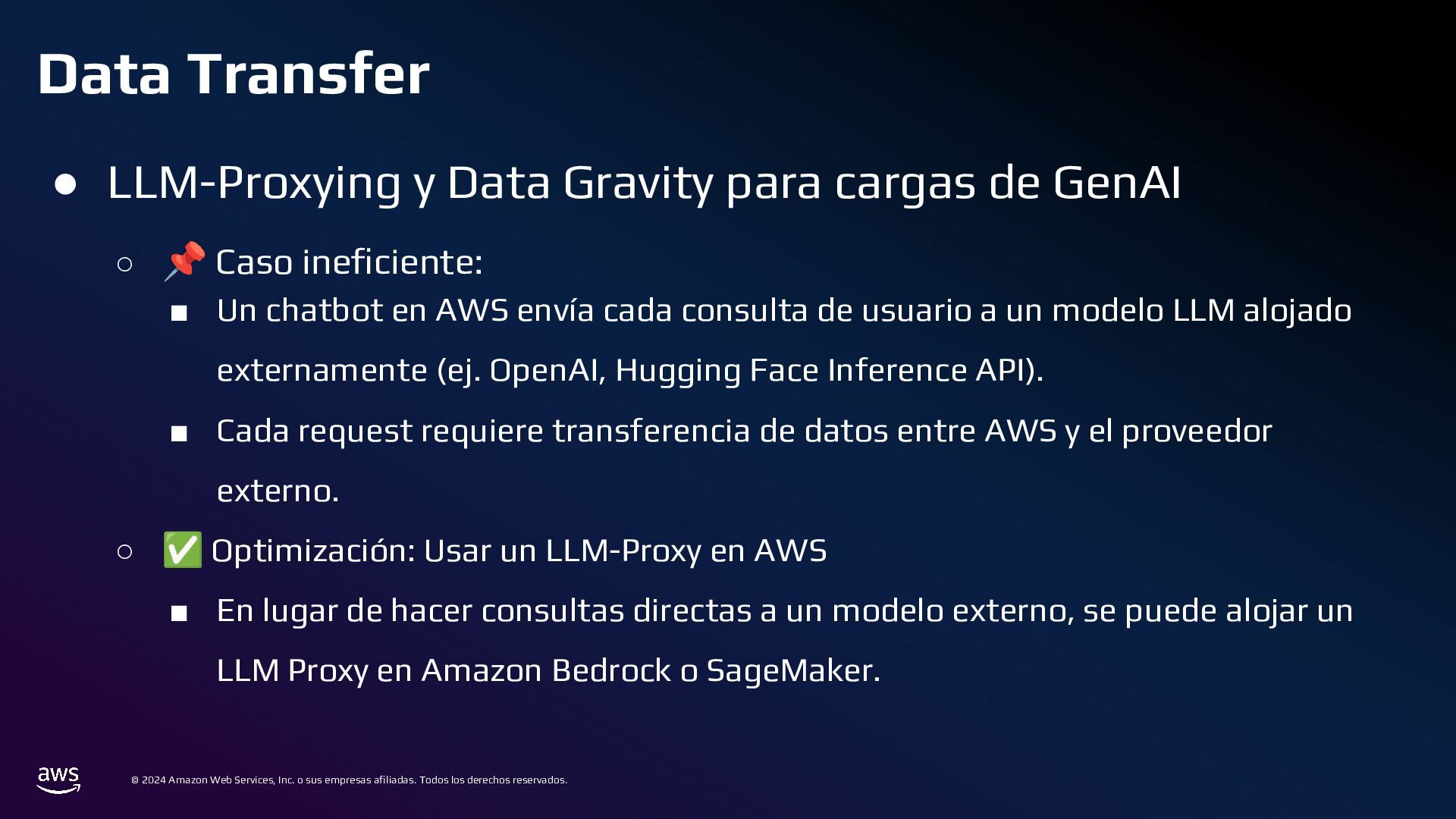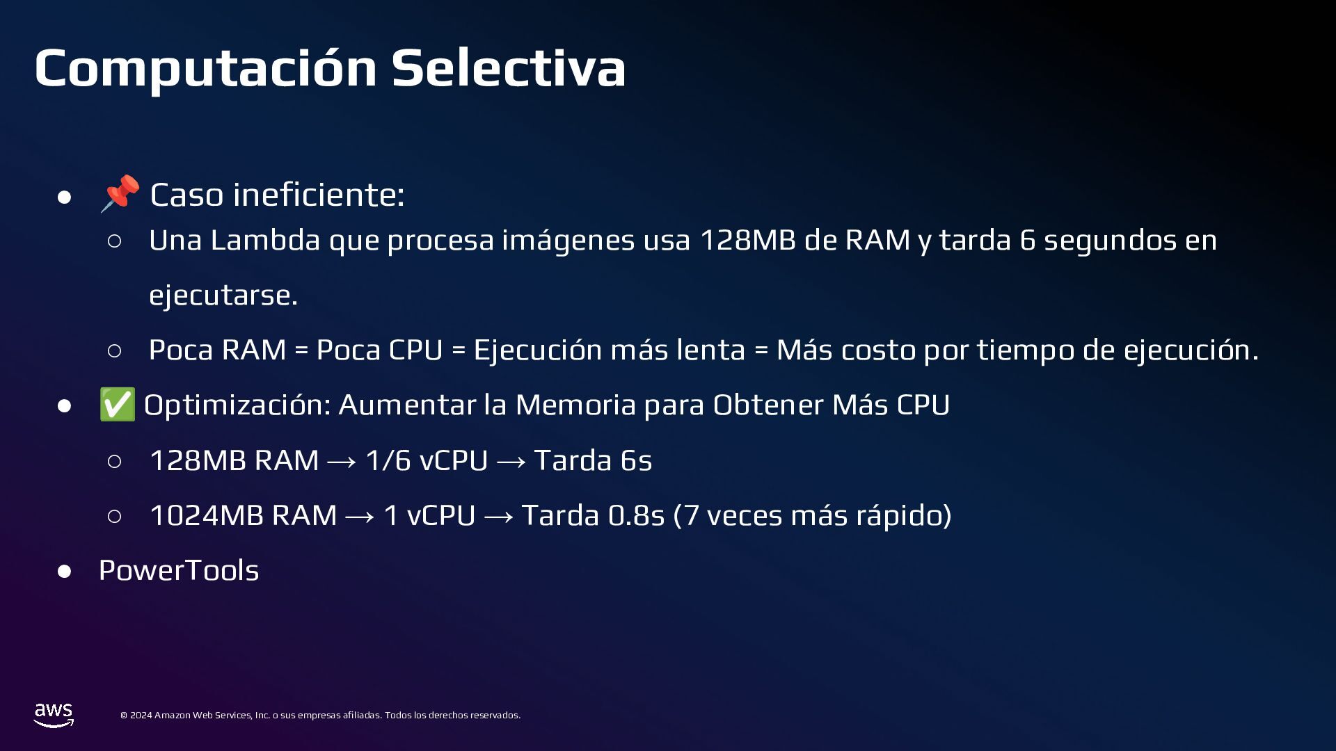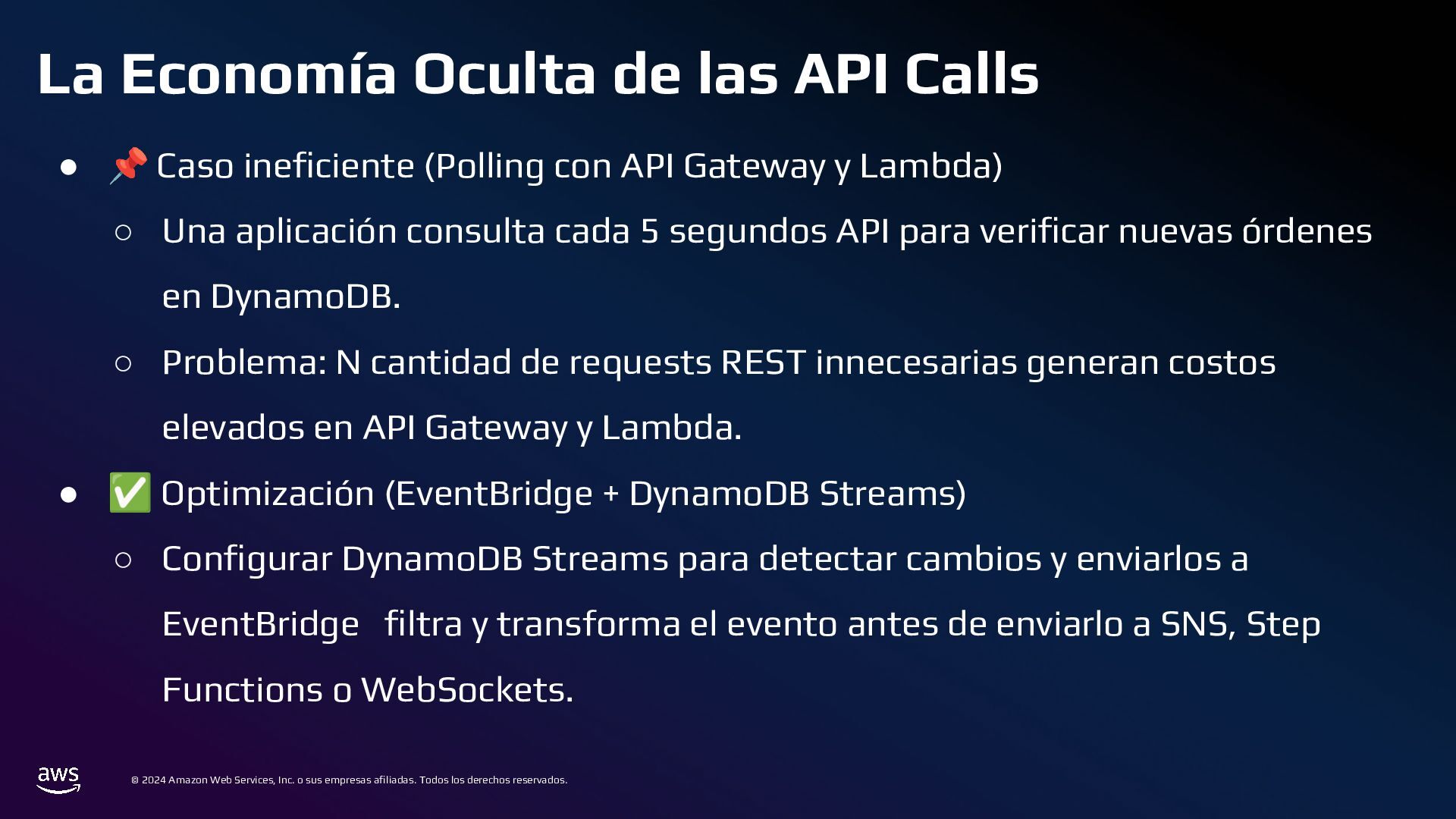 Todos los derechos reservados. Estrategias de Bases de Datos • 📌 Caso ineficiente: ◦ Logs de transacciones en una base de datos PostgreSQL en RDS. ◦ Con el tiempo, la tabla crece a millones de registros, volviendo las consultas lentas. • ✅ Optimización: ◦ Sharding por Intervalos de Tiempo con Amazon TimeStream o PostgreSQL Partitioning ◦ En lugar de usar una sola tabla gigante, dividir los datos en particiones por mes o día.