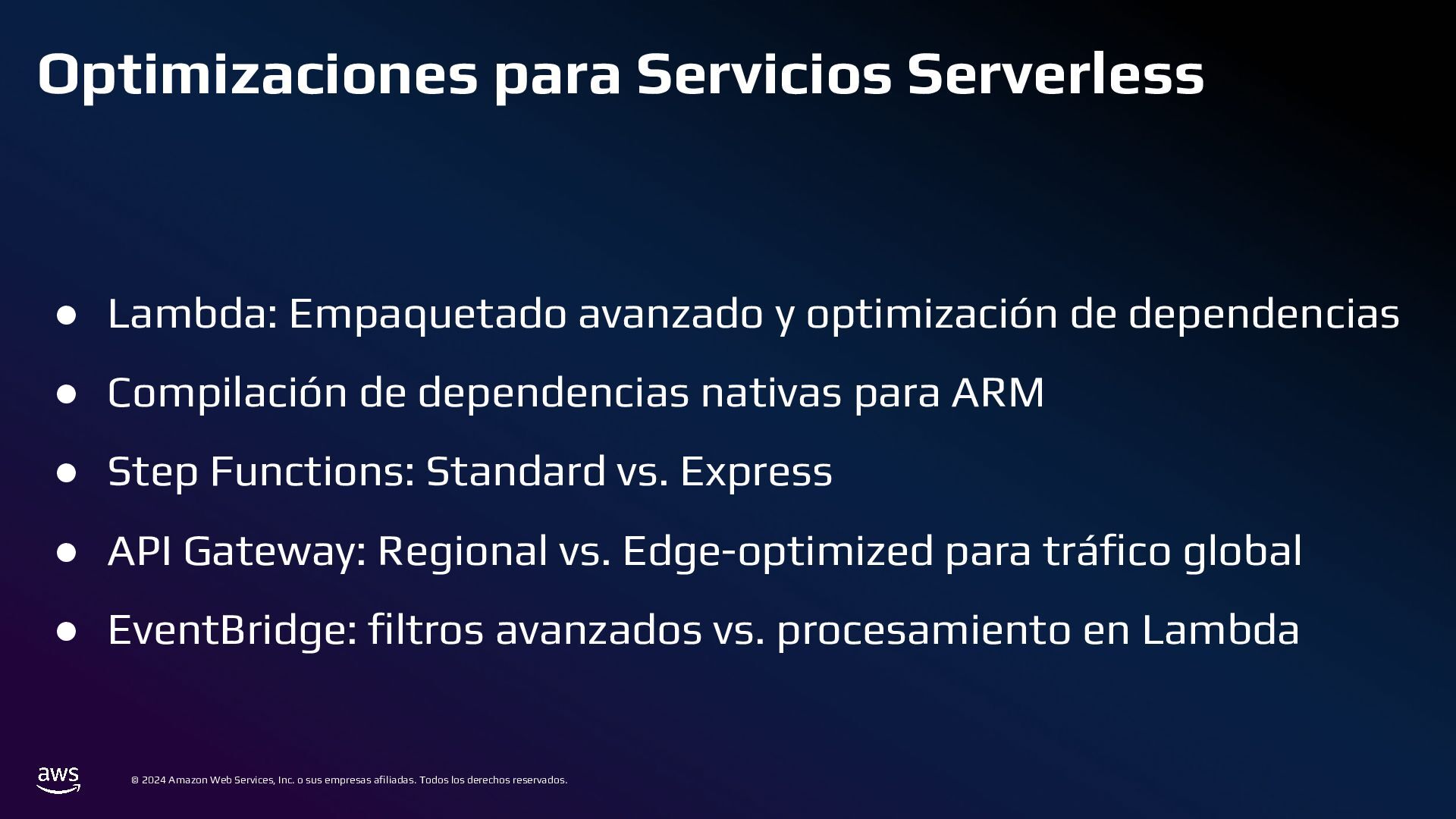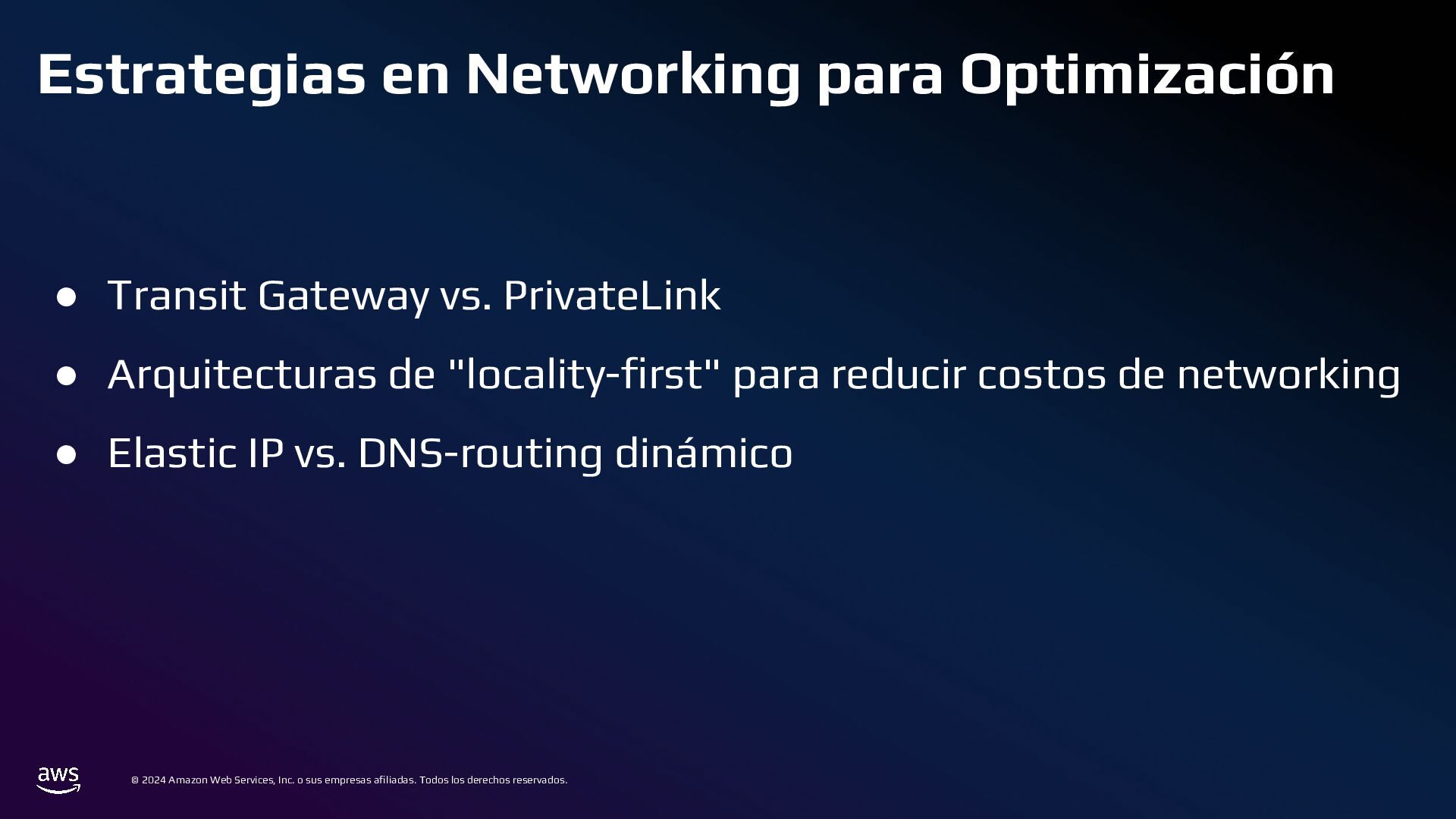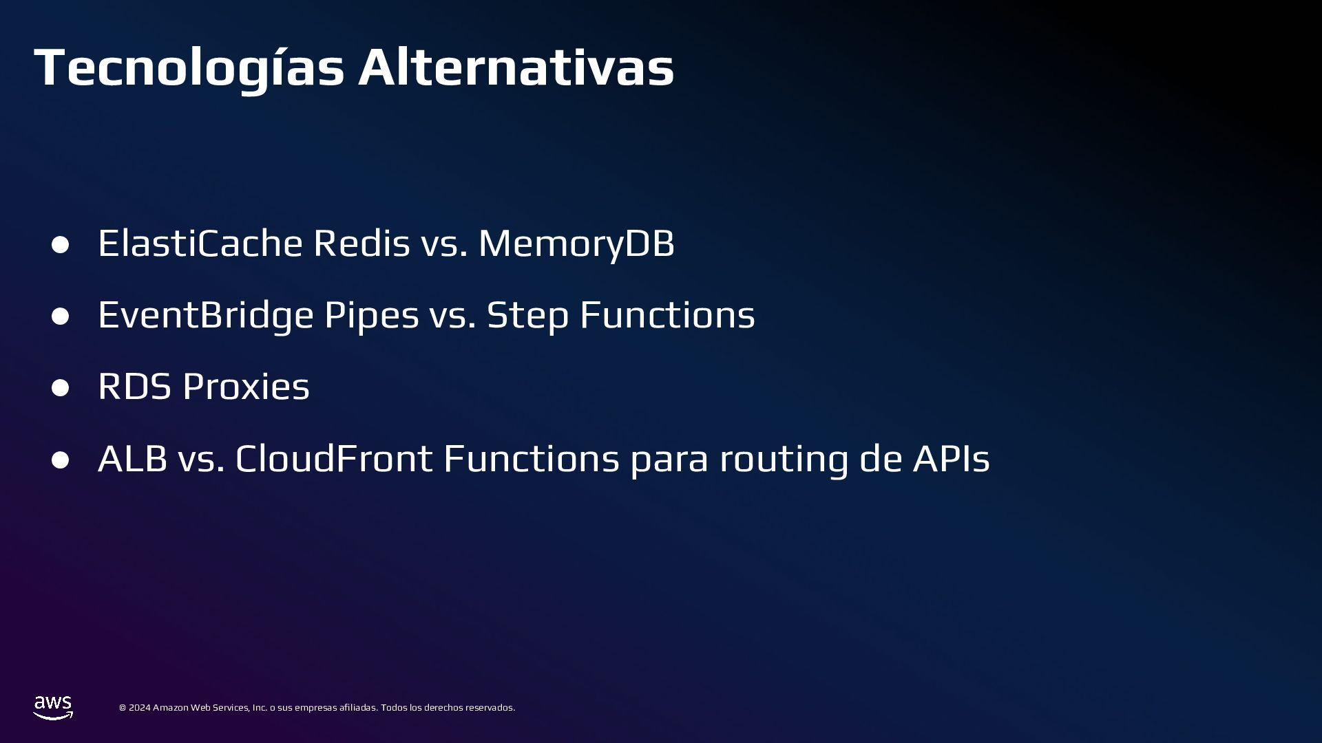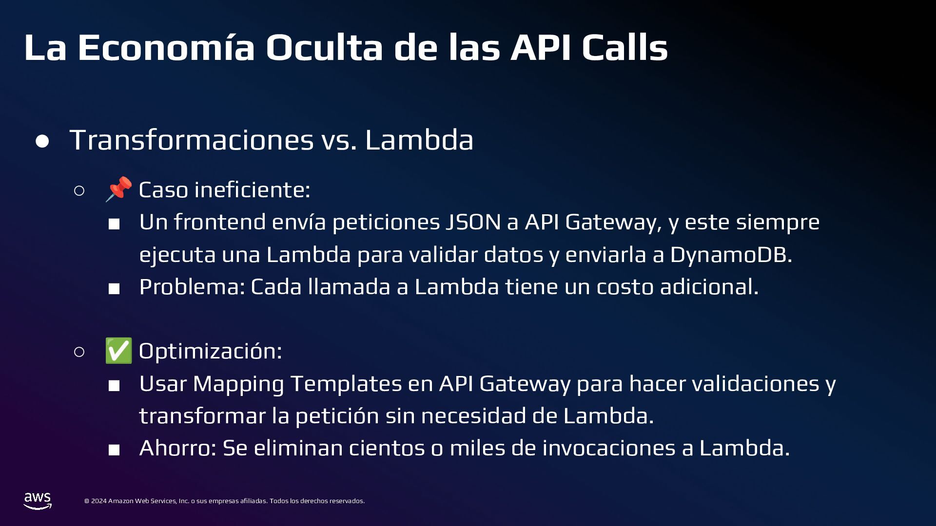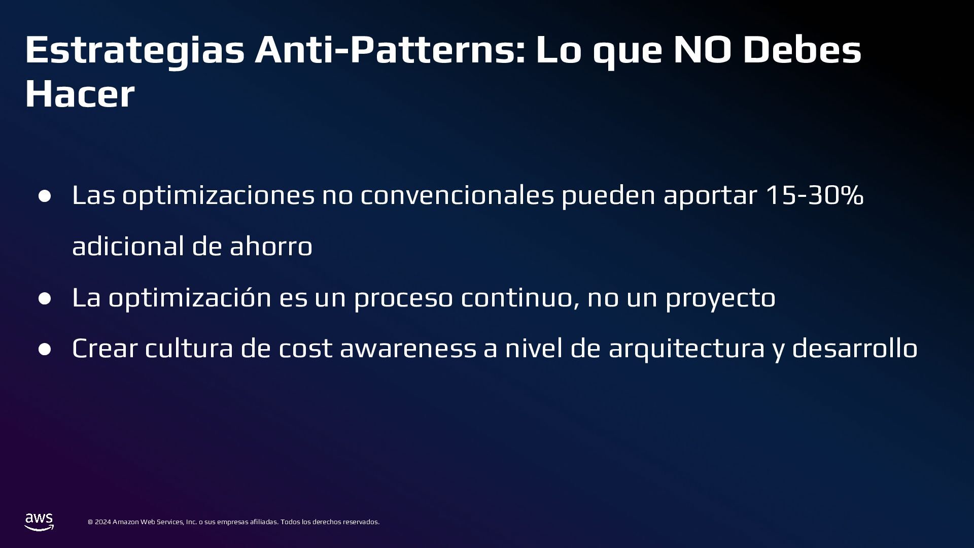 Todos los derechos reservados. Estrategias de Bases de Datos • 📌 Caso ineficiente: ◦ Logs de transacciones en una base de datos PostgreSQL en RDS. ◦ Con el tiempo, la tabla crece a millones de registros, volviendo las consultas lentas. • ✅ Optimización: ◦ Sharding por Intervalos de Tiempo con Amazon TimeStream o PostgreSQL Partitioning ◦ En lugar de usar una sola tabla gigante, dividir los datos en particiones por mes o día.