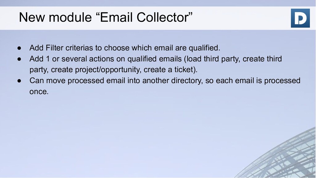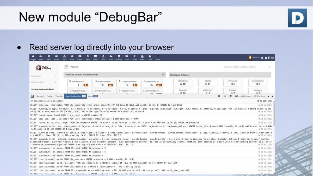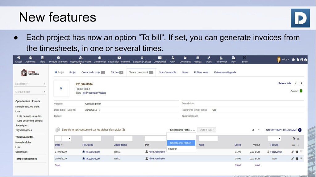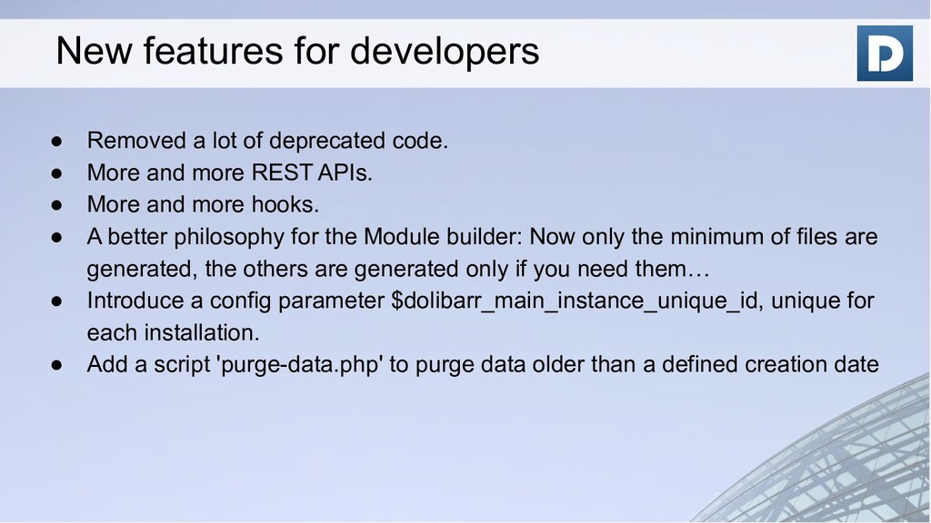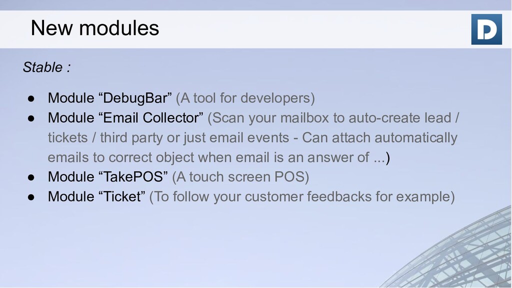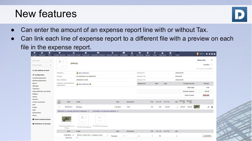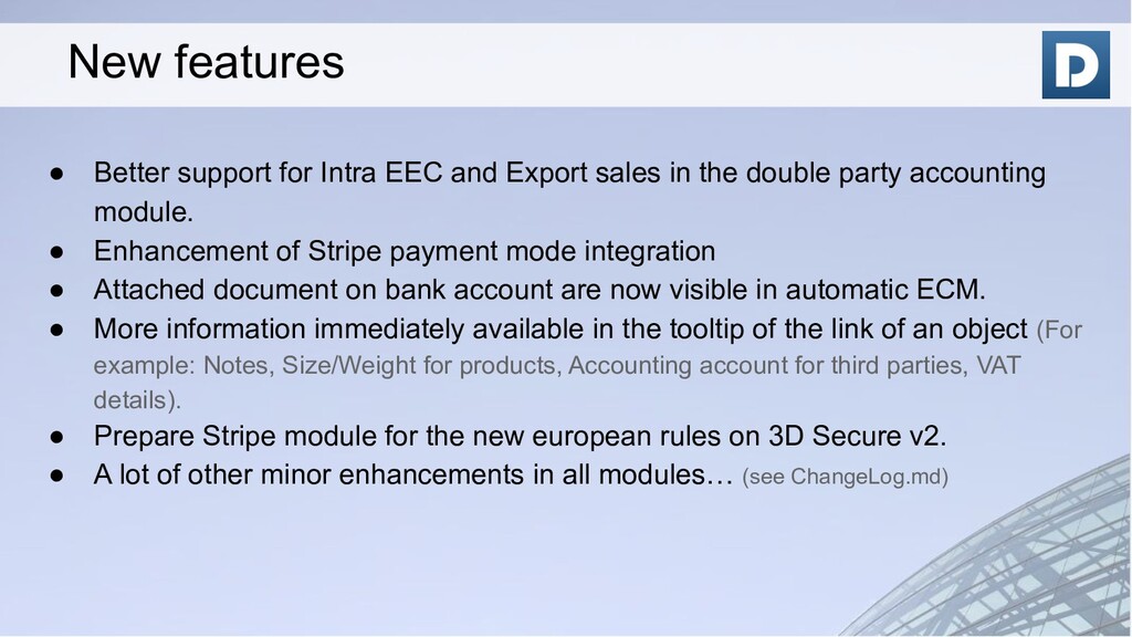 the double party accounting module. • Enhancement of Stripe payment mode integration • Attached document on bank account are now visible in automatic ECM. • More information immediately available in the tooltip of the link of an object (For example: Notes, Size/Weight for products, Accounting account for third parties, VAT details). • Prepare Stripe module for the new european rules on 3D Secure v2. • A lot of other minor enhancements in all modules… (see ChangeLog.md) New features