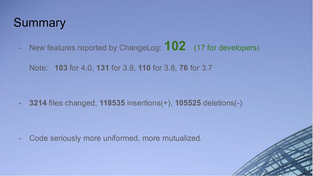 developers) Note: 103 for 4.0, 131 for 3.9, 110 for 3.8, 76 for 3.7 - 3214 files changed, 118535 insertions(+), 105525 deletions(-) - Code seriously more uniformed, more mutualized.