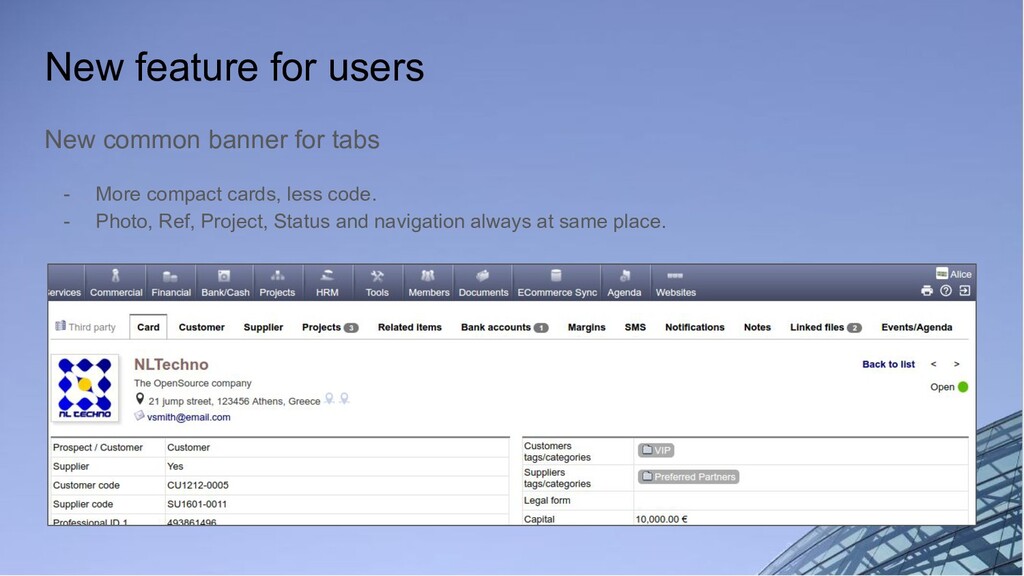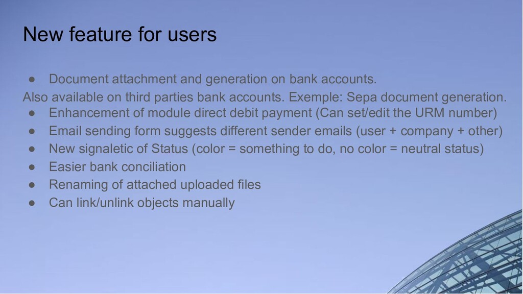 bank accounts. Also available on third parties bank accounts. Exemple: Sepa document generation. • Enhancement of module direct debit payment (Can set/edit the URM number) • Email sending form suggests different sender emails (user + company + other) • New signaletic of Status (color = something to do, no color = neutral status) • Easier bank conciliation • Renaming of attached uploaded files • Can link/unlink objects manually