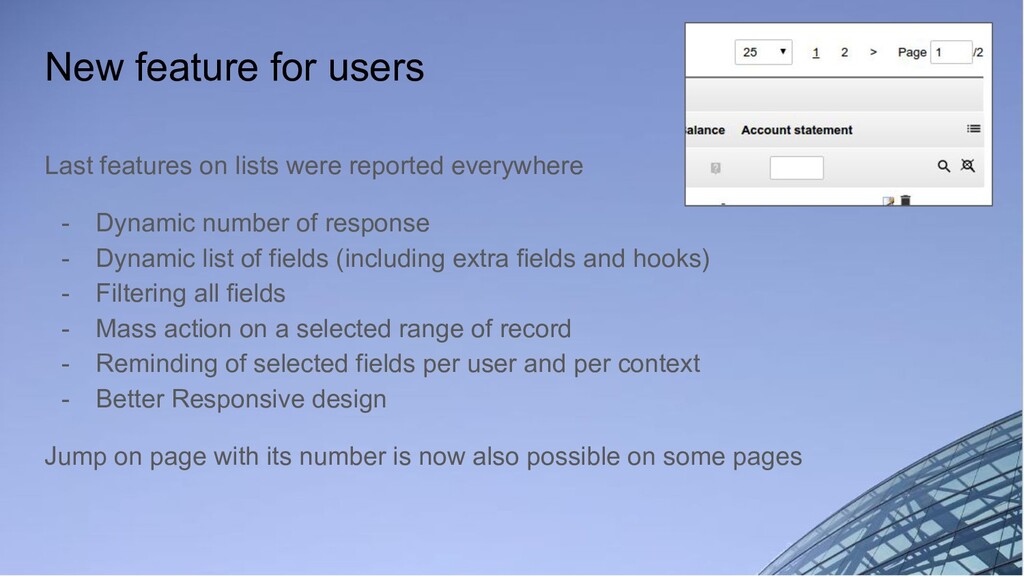 everywhere - Dynamic number of response - Dynamic list of fields (including extra fields and hooks) - Filtering all fields - Mass action on a selected range of record - Reminding of selected fields per user and per context - Better Responsive design Jump on page with its number is now also possible on some pages