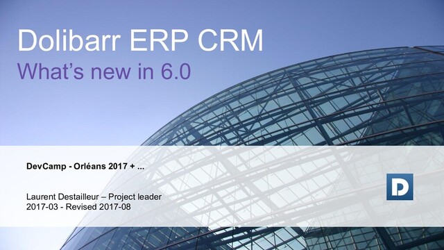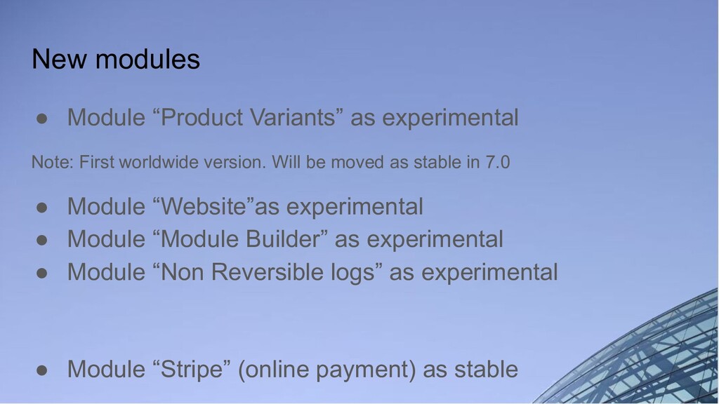 worldwide version. Will be moved as stable in 7.0 • Module “Website”as experimental • Module “Module Builder” as experimental • Module “Non Reversible logs” as experimental • Module “Stripe” (online payment) as stable