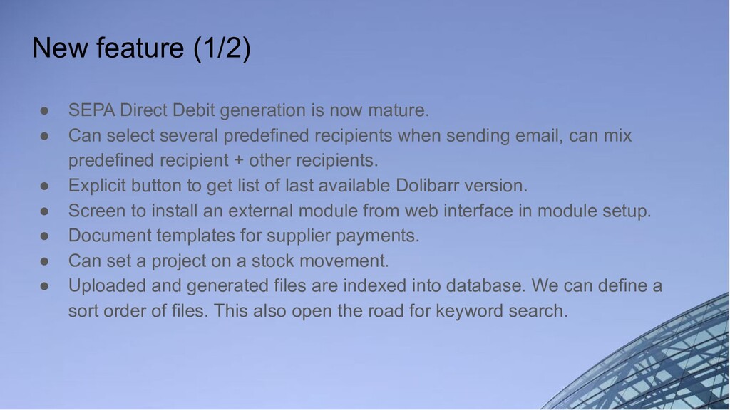 mature. • Can select several predefined recipients when sending email, can mix predefined recipient + other recipients. • Explicit button to get list of last available Dolibarr version. • Screen to install an external module from web interface in module setup. • Document templates for supplier payments. • Can set a project on a stock movement. • Uploaded and generated files are indexed into database. We can define a sort order of files. This also open the road for keyword search.