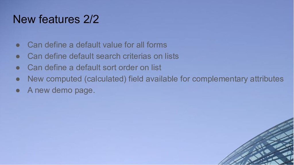 all forms • Can define default search criterias on lists • Can define a default sort order on list • New computed (calculated) field available for complementary attributes • A new demo page.