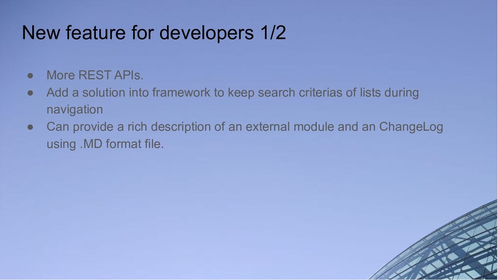 Add a solution into framework to keep search criterias of lists during navigation • Can provide a rich description of an external module and an ChangeLog using .MD format file.