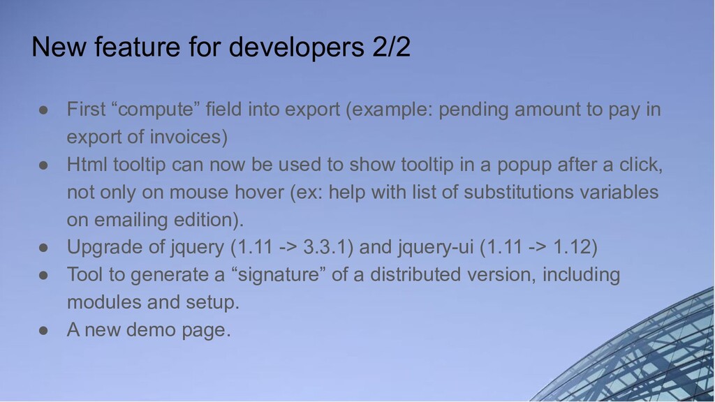 export (example: pending amount to pay in export of invoices) • Html tooltip can now be used to show tooltip in a popup after a click, not only on mouse hover (ex: help with list of substitutions variables on emailing edition). • Upgrade of jquery (1.11 -> 3.3.1) and jquery-ui (1.11 -> 1.12) • Tool to generate a “signature” of a distributed version, including modules and setup. • A new demo page.