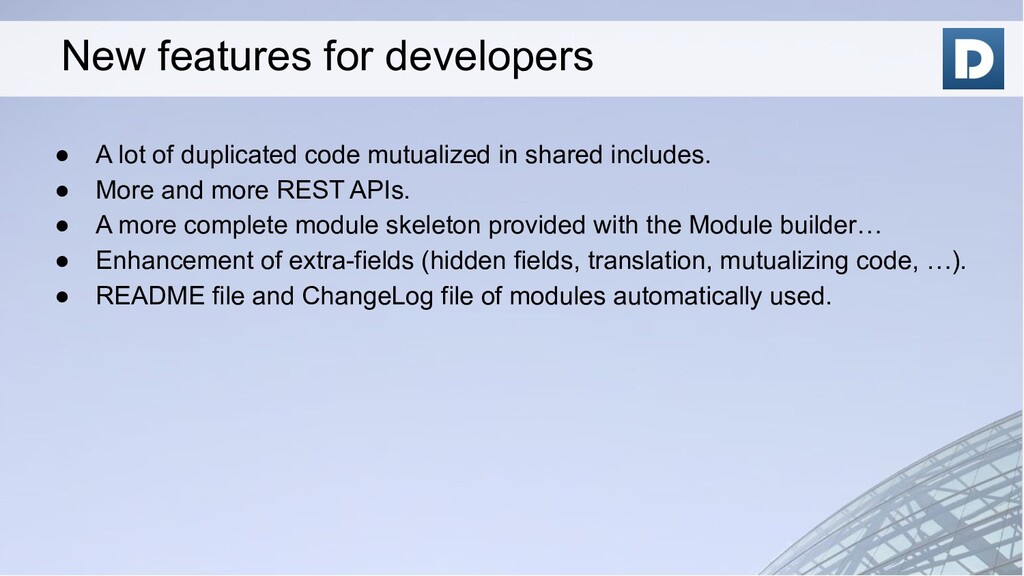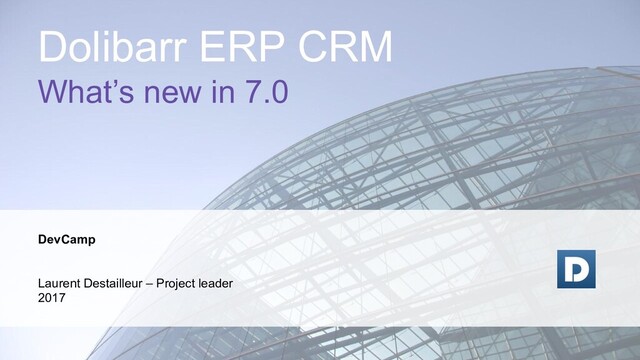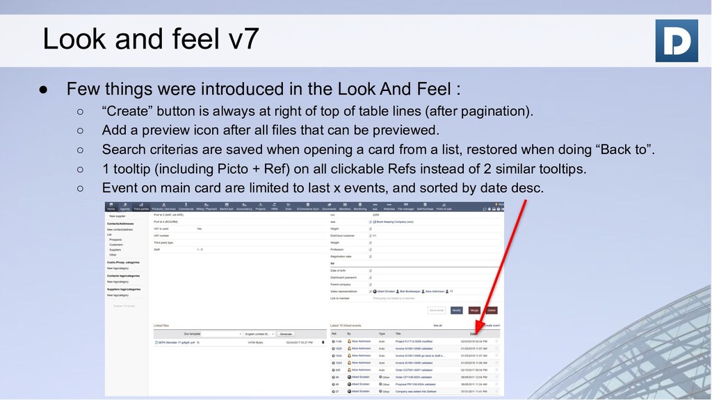 include translation and config variables into templates ◦ Templates are per user / language ◦ Can choose to attach or not by default the document PDF in the template definition • Enhanced interface to report time consumed (filters, group by project and holidays appears) • Enhancement into accounting interface (example: accounting now into a dedicated menu) • More bulk actions (mass delete with a confirmation everywhere, pdf merge, validate...) • More import / export predefined profiles • Can use a specific setup for SMTP sending for emailing module • A tons of minor enhancements in all modules… (see ChangeLog.md) New features
