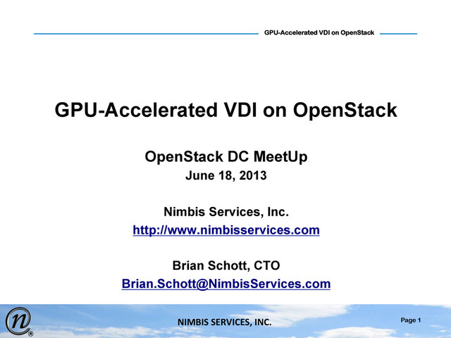GPU-Accelerated VDI on OpenStack OpenStack DC MeetUp June 18, 2013 Nimbis Services, Inc. http://www.nimbisservices.com Brian Schott, CTO [email protected]