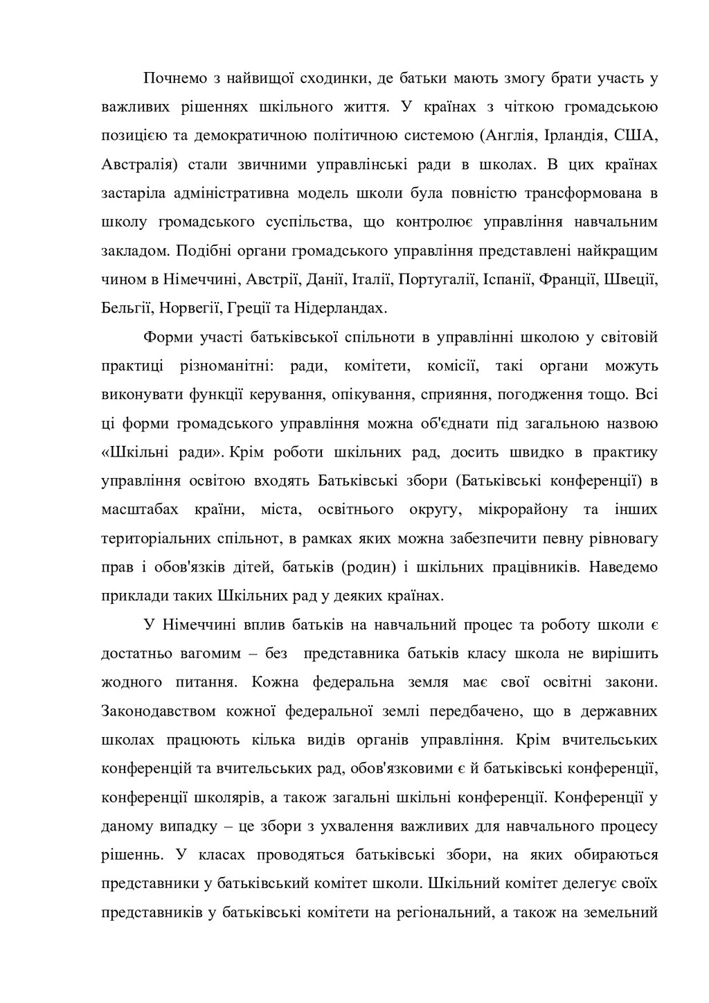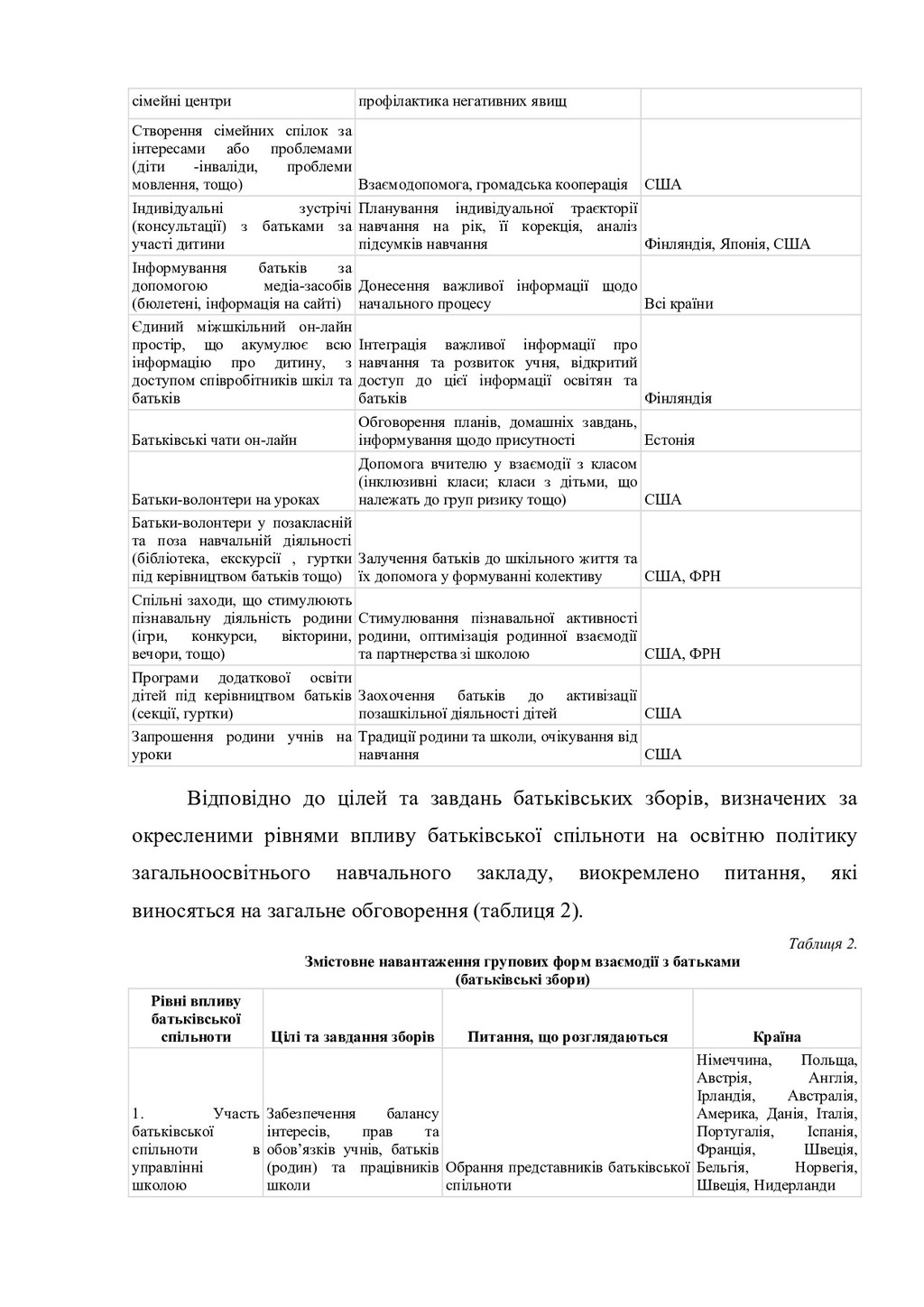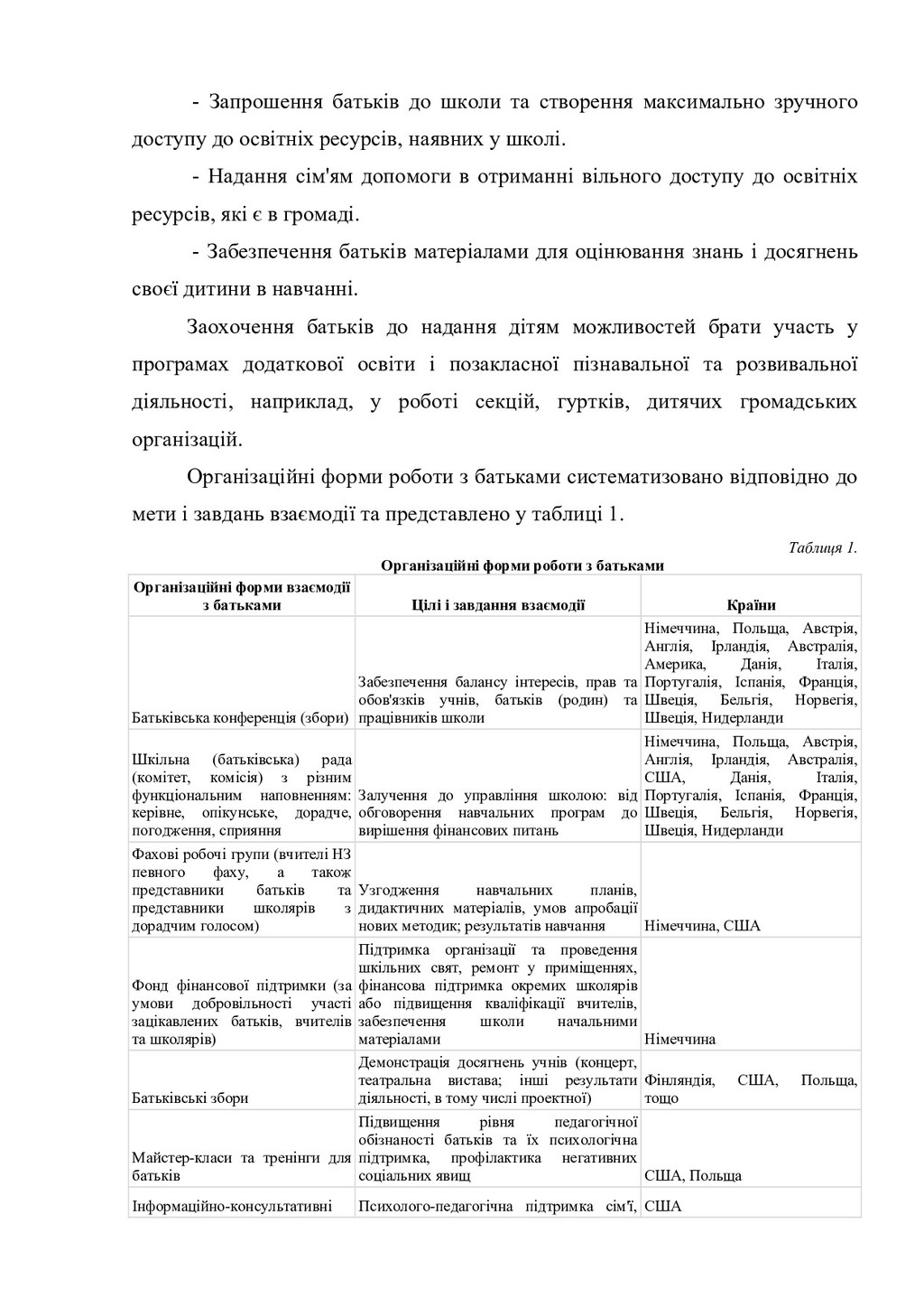до освітніх ресурсів, наявних у школі. - Надання сім'ям допомоги в отриманні вільного доступу до освітніх ресурсів, які є в громаді. - Забезпечення батьків матеріалами для оцінювання знань і досягнень своєї дитини в навчанні. Заохочення батьків до надання дітям можливостей брати участь у програмах додаткової освіти і позакласної пізнавальної та розвивальної діяльності, наприклад, у роботі секцій, гуртків, дитячих громадських організацій. Організаційні форми роботи з батьками систематизовано відповідно до мети і завдань взаємодії та представлено у таблиці 1. Таблиця 1. Організаційні форми роботи з батьками Організаційні форми взаємодії з батьками Цілі і завдання взаємодії Країни Батьківська конференція (збори) Забезпечення балансу інтересів, прав та обов'язків учнів, батьків (родин) та працівників школи Німеччина, Польща, Австрія, Англія, Ірландія, Австралія, Америка, Данія, Італія, Португалія, Іспанія, Франція, Швеція, Бельгія, Норвегія, Швеція, Нидерланди Шкільна (батьківська) рада (комітет, комісія) з різним функціональним наповненням: керівне, опікунське, дорадче, погодження, сприяння Залучення до управління школою: від обговорення навчальних програм до вирішення фінансових питань Німеччина, Польща, Австрія, Англія, Ірландія, Австралія, США, Данія, Італія, Португалія, Іспанія, Франція, Швеція, Бельгія, Норвегія, Швеція, Нидерланди Фахові робочі групи (вчителі НЗ певного фаху, а також представники батьків та представники школярів з дорадчим голосом) Узгодження навчальних планів, дидактичних матеріалів, умов апробації нових методик; результатів навчання Німеччина, США Фонд фінансової підтримки (за умови добровільності участі зацікавлених батьків, вчителів та школярів) Підтримка організації та проведення шкільних свят, ремонт у приміщеннях, фінансова підтримка окремих школярів або підвищення кваліфікації вчителів, забезпечення школи начальними матеріалами Німеччина Батьківські збори Демонстрація досягнень учнів (концерт, театральна вистава; інші результати діяльності, в тому числі проектної) Фінляндія, США, Польща, тощо Майстер-класи та тренінги для батьків Підвищення рівня педагогічної обізнаності батьків та їх психологічна підтримка, профілактика негативних соціальних явищ США, Польща Інформаційно-консультативні Психолого-педагогічна підтримка сім'ї, США