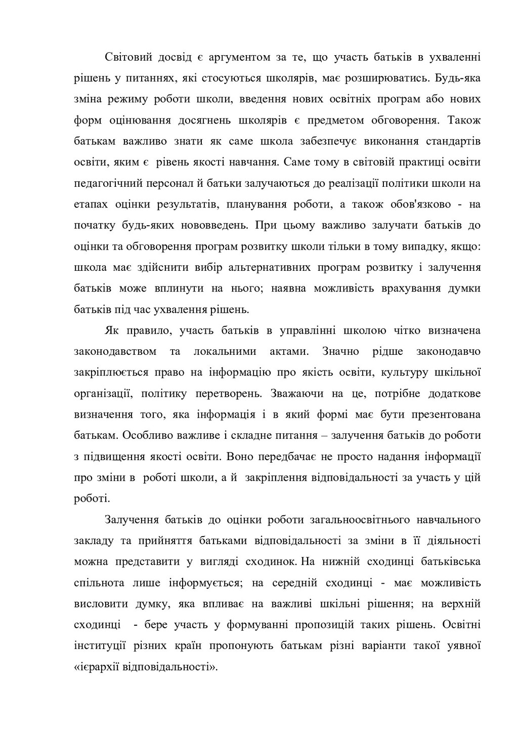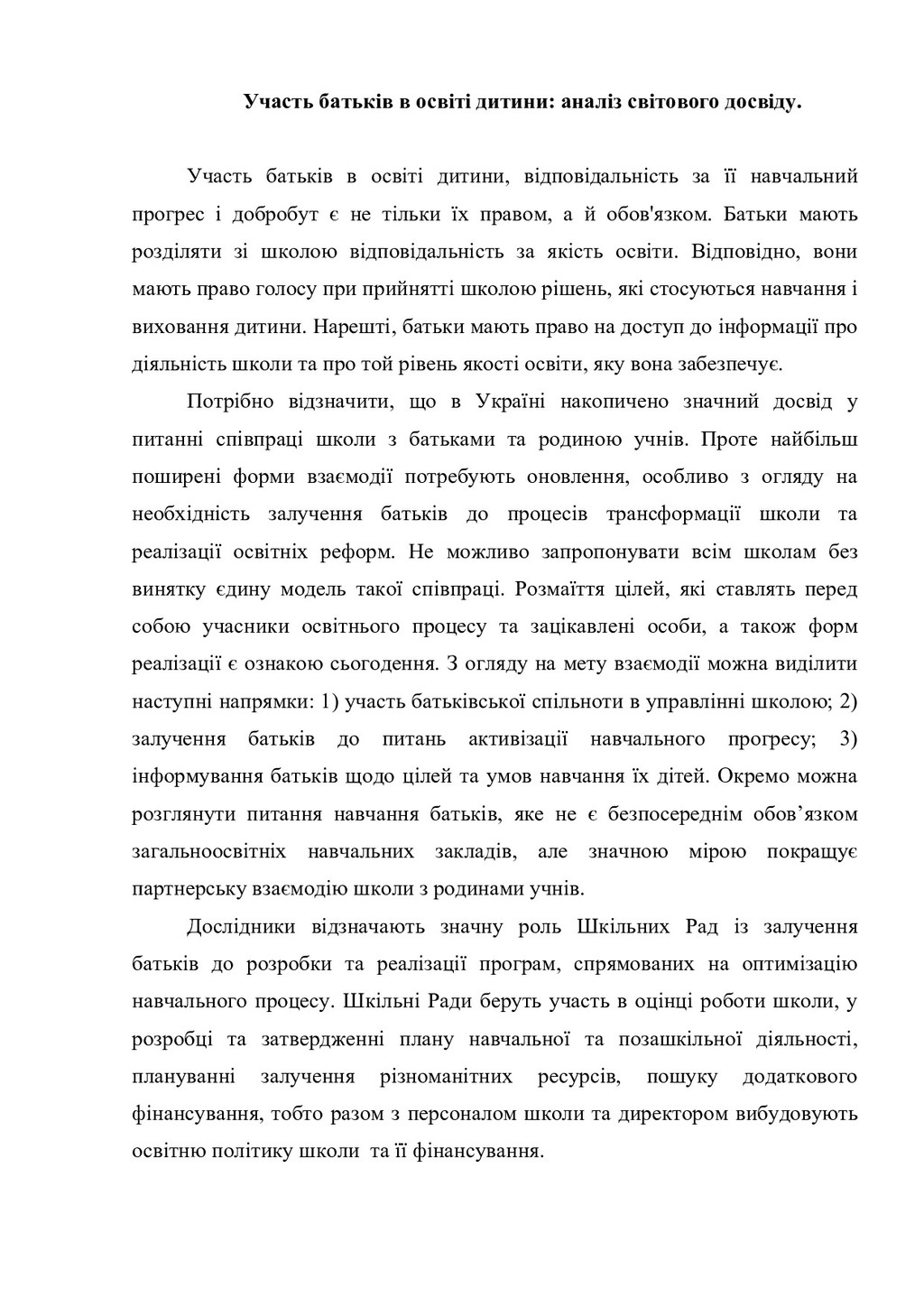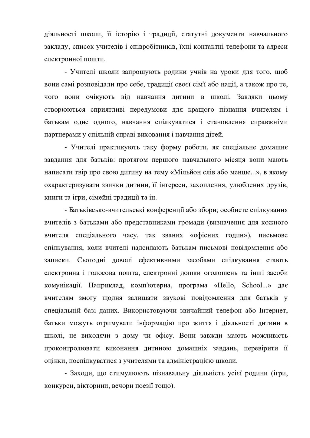 до освітніх ресурсів, наявних у школі. - Надання сім'ям допомоги в отриманні вільного доступу до освітніх ресурсів, які є в громаді. - Забезпечення батьків матеріалами для оцінювання знань і досягнень своєї дитини в навчанні. Заохочення батьків до надання дітям можливостей брати участь у програмах додаткової освіти і позакласної пізнавальної та розвивальної діяльності, наприклад, у роботі секцій, гуртків, дитячих громадських організацій. Організаційні форми роботи з батьками систематизовано відповідно до мети і завдань взаємодії та представлено у таблиці 1. Таблиця 1. Організаційні форми роботи з батьками Організаційні форми взаємодії з батьками Цілі і завдання взаємодії Країни Батьківська конференція (збори) Забезпечення балансу інтересів, прав та обов'язків учнів, батьків (родин) та працівників школи Німеччина, Польща, Австрія, Англія, Ірландія, Австралія, Америка, Данія, Італія, Португалія, Іспанія, Франція, Швеція, Бельгія, Норвегія, Швеція, Нидерланди Шкільна (батьківська) рада (комітет, комісія) з різним функціональним наповненням: керівне, опікунське, дорадче, погодження, сприяння Залучення до управління школою: від обговорення навчальних програм до вирішення фінансових питань Німеччина, Польща, Австрія, Англія, Ірландія, Австралія, США, Данія, Італія, Португалія, Іспанія, Франція, Швеція, Бельгія, Норвегія, Швеція, Нидерланди Фахові робочі групи (вчителі НЗ певного фаху, а також представники батьків та представники школярів з дорадчим голосом) Узгодження навчальних планів, дидактичних матеріалів, умов апробації нових методик; результатів навчання Німеччина, США Фонд фінансової підтримки (за умови добровільності участі зацікавлених батьків, вчителів та школярів) Підтримка організації та проведення шкільних свят, ремонт у приміщеннях, фінансова підтримка окремих школярів або підвищення кваліфікації вчителів, забезпечення школи начальними матеріалами Німеччина Батьківські збори Демонстрація досягнень учнів (концерт, театральна вистава; інші результати діяльності, в тому числі проектної) Фінляндія, США, Польща, тощо Майстер-класи та тренінги для батьків Підвищення рівня педагогічної обізнаності батьків та їх психологічна підтримка, профілактика негативних соціальних явищ США, Польща Інформаційно-консультативні Психолого-педагогічна підтримка сім'ї, США