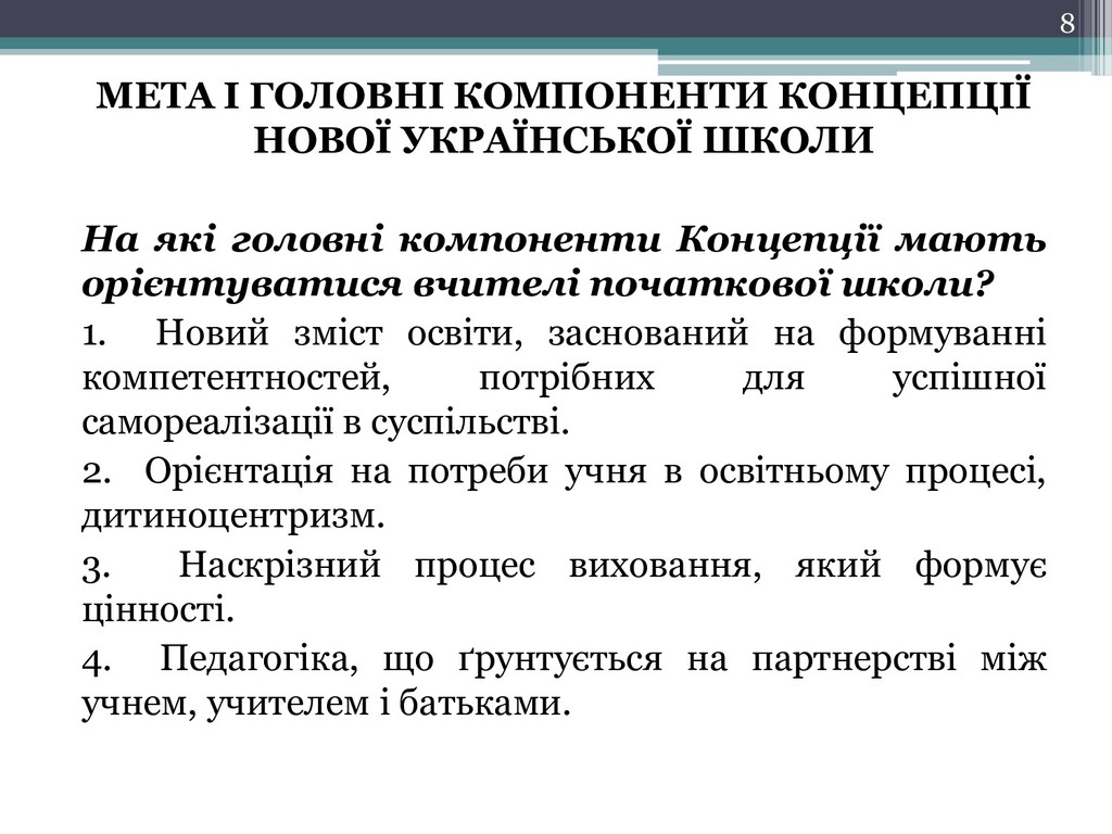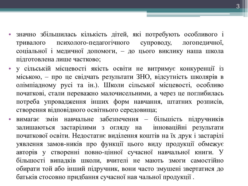між школами, які територіально, соціально і демографічно працюють у різних умовах, що утруднює реальний доступ учнів до здобуття якісної освіти; • недостатньо розвинена мережа дошкільних закладів – це унеможливлює обов’язкову передшкільну підготовку дітей старшого дошкільного віку. Такий стан, як засвідчує статистика, буде зберігатися у найближчі роки, тому постає потреба пошуку й інших шляхів здійснення підготовки дітей до школи; • умови навчання дітей, особливо 6-річних першокласників, – наповнення класів, режим навчання, вимоги до приміщення, забезпечення харчуванням, матеріальна база тощо – у переважній більшості закладів освіти не відповідають психофізіологічним особливостям розвитку учнів; з кожним роком збільшуються ризики погіршення фізичного та психологічного здоров’я дітей, що вимагає перегляду режиму їхньої навчальної праці, розвантаження і переструктурування змісту навчальних предметів, уникнення дублювання матеріалу тощо; 2