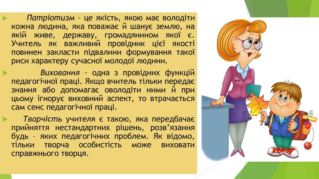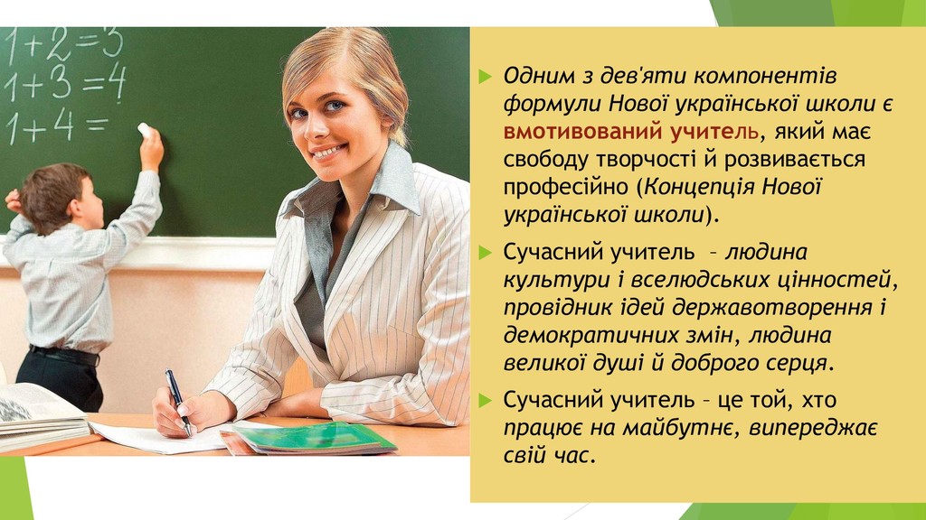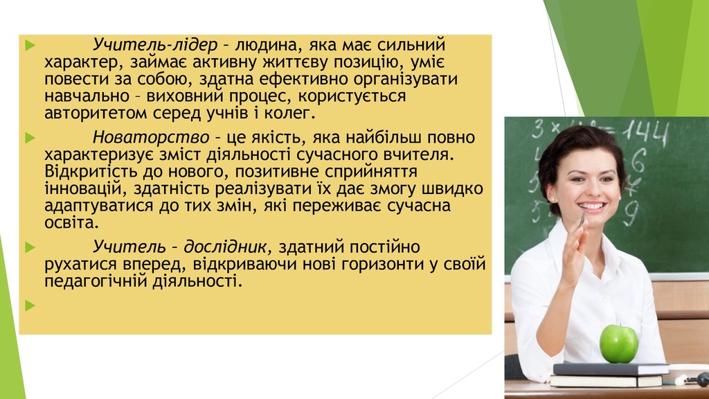 життєву позицію, уміє повести за собою, здатна ефективно організувати навчально – виховний процес, користується авторитетом серед учнів і колег. Новаторство – це якість, яка найбільш повно характеризує зміст діяльності сучасного вчителя. Відкритість до нового, позитивне сприйняття інновацій, здатність реалізувати їх дає змогу швидко адаптуватися до тих змін, які переживає сучасна освіта. Учитель – дослідник, здатний постійно рухатися вперед, відкриваючи нові горизонти у своїй педагогічній діяльності.