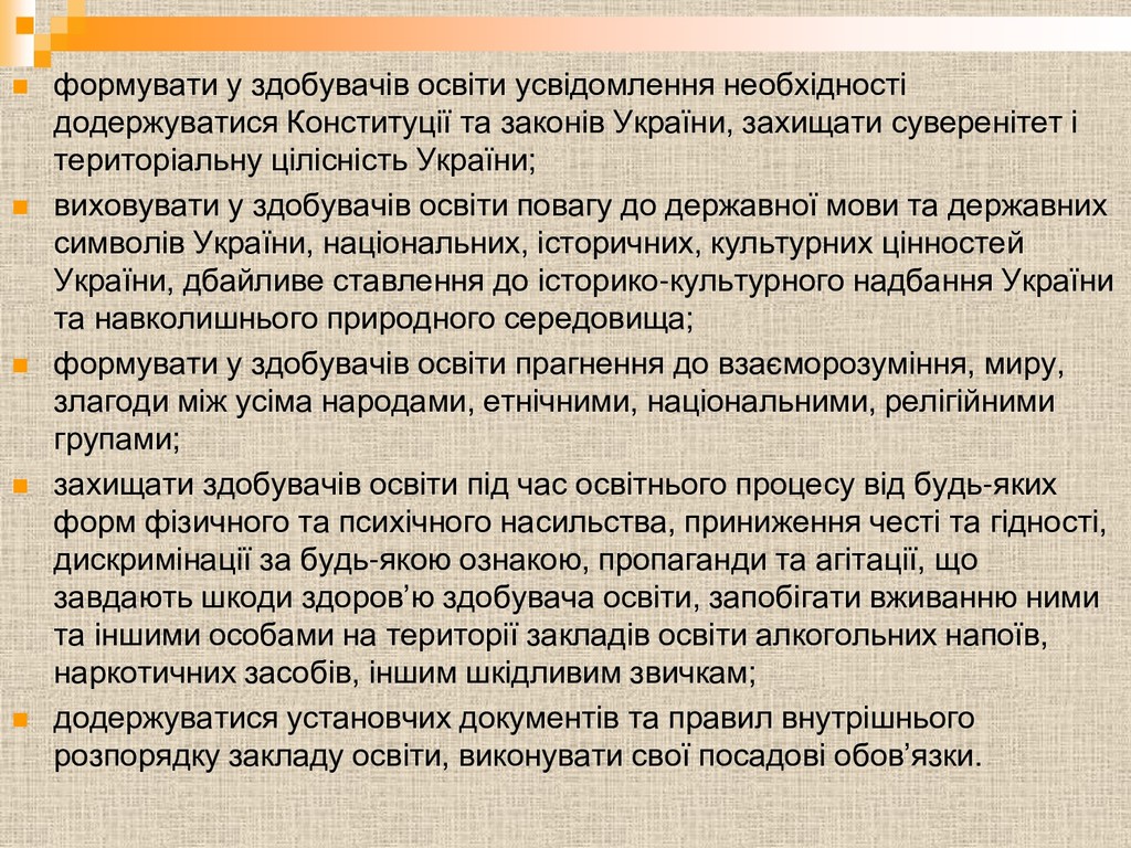 законів України, захищати суверенітет і територіальну цілісність України; виховувати у здобувачів освіти повагу до державної мови та державних символів України, національних, історичних, культурних цінностей України, дбайливе ставлення до історико-культурного надбання України та навколишнього природного середовища; формувати у здобувачів освіти прагнення до взаєморозуміння, миру, злагоди між усіма народами, етнічними, національними, релігійними групами; захищати здобувачів освіти під час освітнього процесу від будь-яких форм фізичного та психічного насильства, приниження честі та гідності, дискримінації за будь-якою ознакою, пропаганди та агітації, що завдають шкоди здоров’ю здобувача освіти, запобігати вживанню ними та іншими особами на території закладів освіти алкогольних напоїв, наркотичних засобів, іншим шкідливим звичкам; додержуватися установчих документів та правил внутрішнього розпорядку закладу освіти, виконувати свої посадові обов’язки.