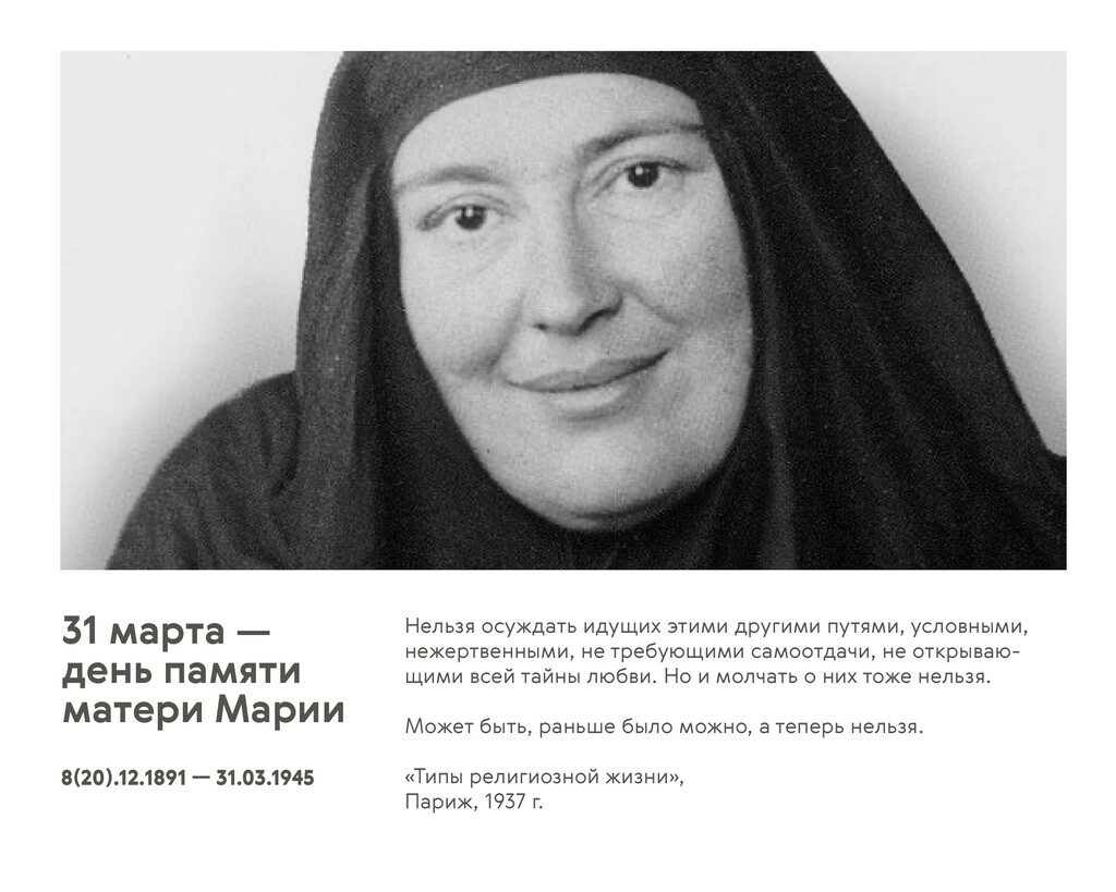 Мать Мария (Скобцова) своей смертью явила подвиг жертвенной любви, когда вместо своей соседки по лагерю Равенсбрюк, где находилась за то, что укрывала от фашистов евреев, пошла в газовую камеру.
