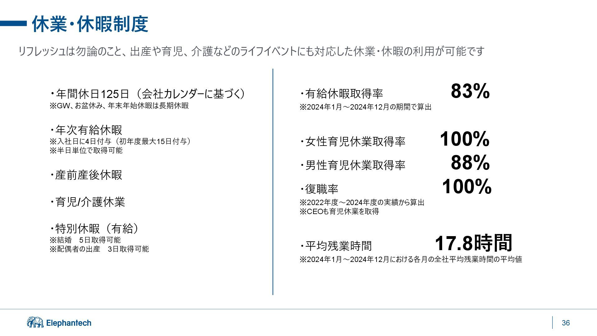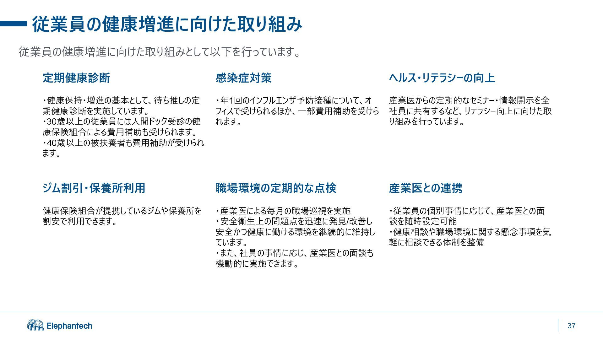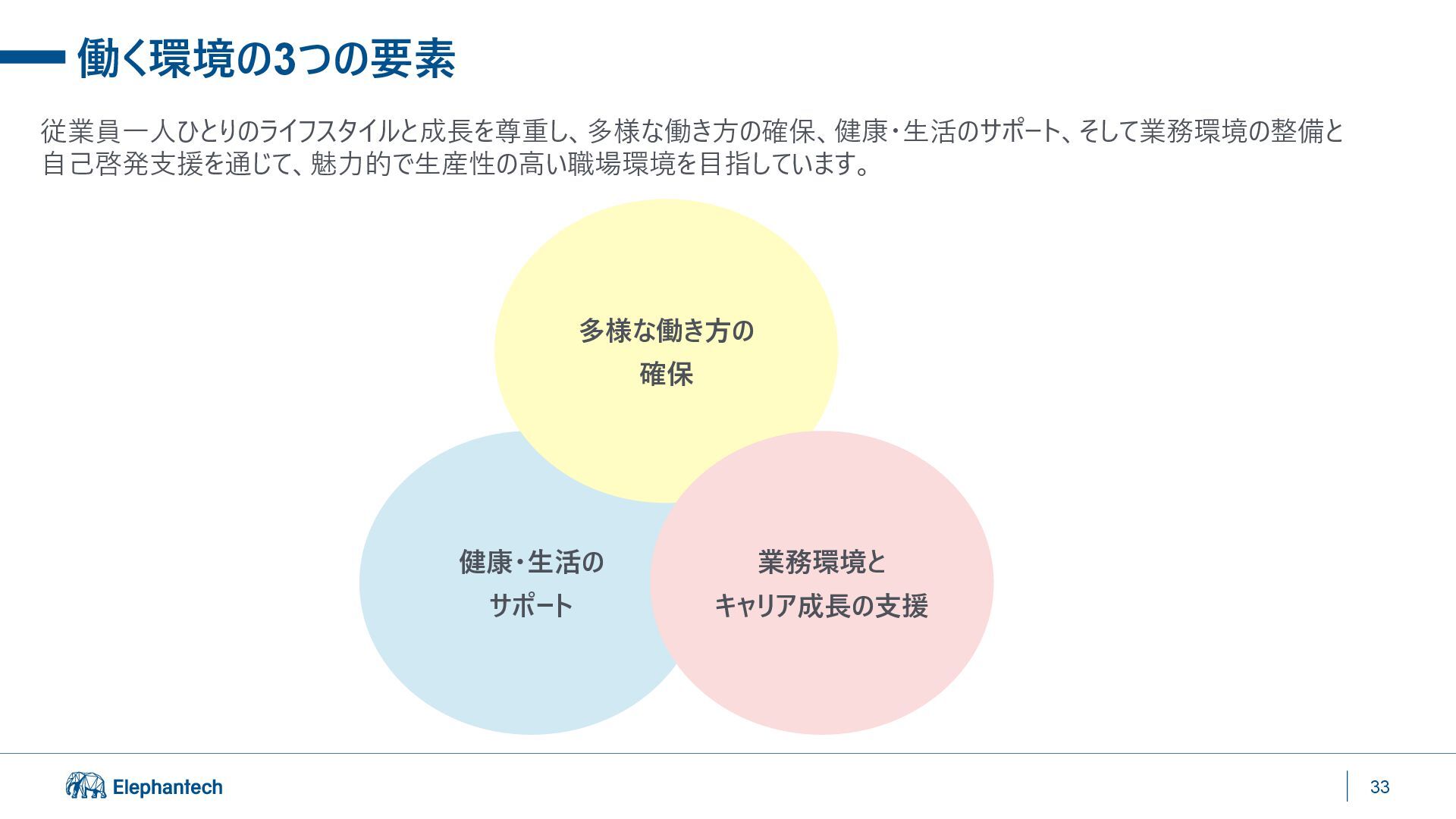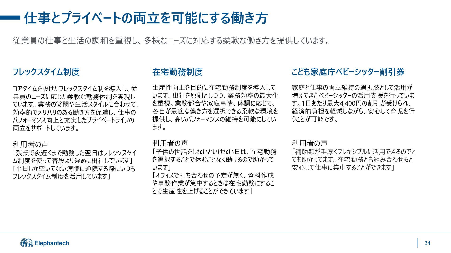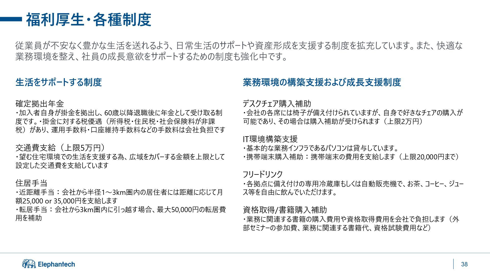 住居手当 ・近距離手当:会社から半径1~3km圏内の居住者には距離に応じて月 額25,000 or 35,000円を支給します ・転居手当:会社から3km圏内に引っ越す場合、最大50,000円の転居費 用を補助 業務環境の構築支援および成長支援制度 デスクチェア購入補助 ・会社の各席には椅子が備え付けられていますが、自身で好きなチェアの購入が 可能であり、その場合は購入補助が受けられます(上限2万円) IT環境構築支援 ・基本的な業務インフラであるパソコンは貸与しています。 ・携帯端末購入補助:携帯端末の費用を支給します(上限20,000円まで) フリードリンク ・各拠点に備え付けの専用冷蔵庫もしくは自動販売機で、お茶、コーヒー、ジュー ス等を自由に飲んでいただけます。 資格取得/書籍購入補助 ・業務に関連する書籍の購入費用や資格取得費用を会社で負担します(外 部セミナーの参加費、業務に関連する書籍代、資格試験費用など) 従業員が不安なく豊かな生活を送れるよう、日常生活のサポートや資産形成を支援する制度を拡充しています。また、快適な 業務環境を整え、社員の成長意欲をサポートするための制度も強化中です。