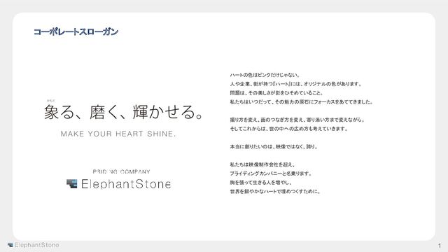 ミッション・バリュー・ビジョン 最高の映像作品を創りたい。でも、独りよがりにはなりたくない。映像に宿る『想い』の 持ち主にとっても、私たちにとっても最高傑作であるような。携わった皆が「こんな映像 創ったよ!」ってつい自慢してしまう映像を創りたい。 だから、完成品だけを提供するのではなく、創る過程から一緒に楽しんでいく。そんな 映像創りを約束します。 人にも、企業にも、町にも。かならず素晴らしい魅力があります。その原石を見つけ出 し、フォーカスをあて、本来の輝きを映していきたい。そして誰もが自分たちの魅力を誇 り、胸を張ってポジティブに生きていけるような、色鮮やかな未来を、映像の力で創りま す。 2 MISSION VALUE VISION