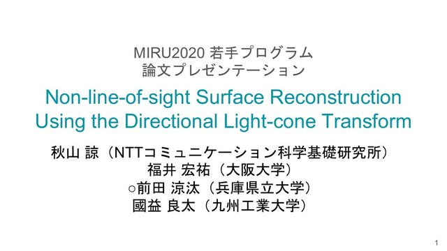 Reconstruction Scheiner et al, Seeing Around Street Corners: Non-Line-of-Sight Detection and Tracking In-the-Wild Using Doppler Radar Isogawa et al, Optical Non-Line-of-Sight Physics-based 3D Human Pose Estimation Young et al, Non-line-of-sight Surface Reconstruction Using the Directional Light- cone Transform Tanaka et al, Polarized Non-Line-of- Sight Imaging