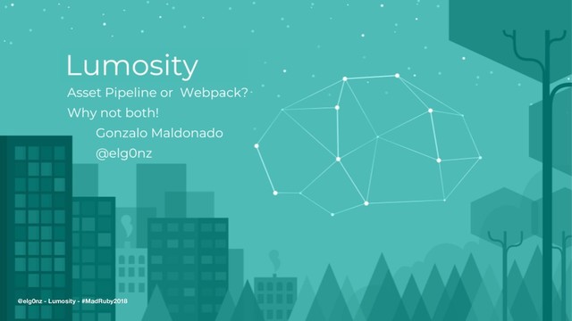 that does: * Linking: Allows you to 'require' other Javascript files, either internal or third party * Dependency Management: Makes sure your dependencies are properly set * Concatenating: Packs all your javascript code into a single deployable asset. * Minifying: Compresses the Pack above to reduce time * Transpiling: Optimizes your code by transpiling to the most optimal JS possible. @elg0nz - Lumosity - #MadRuby2018